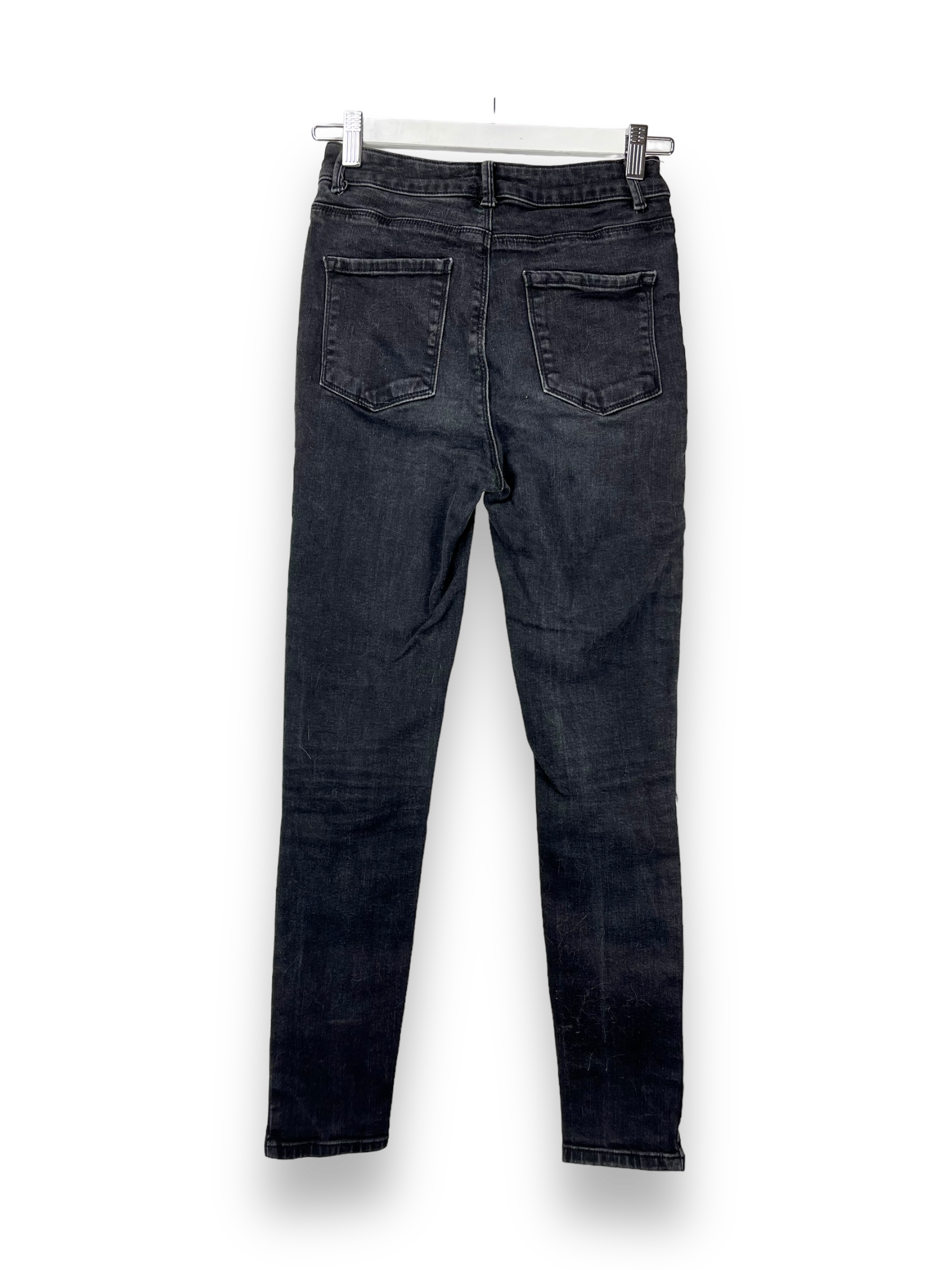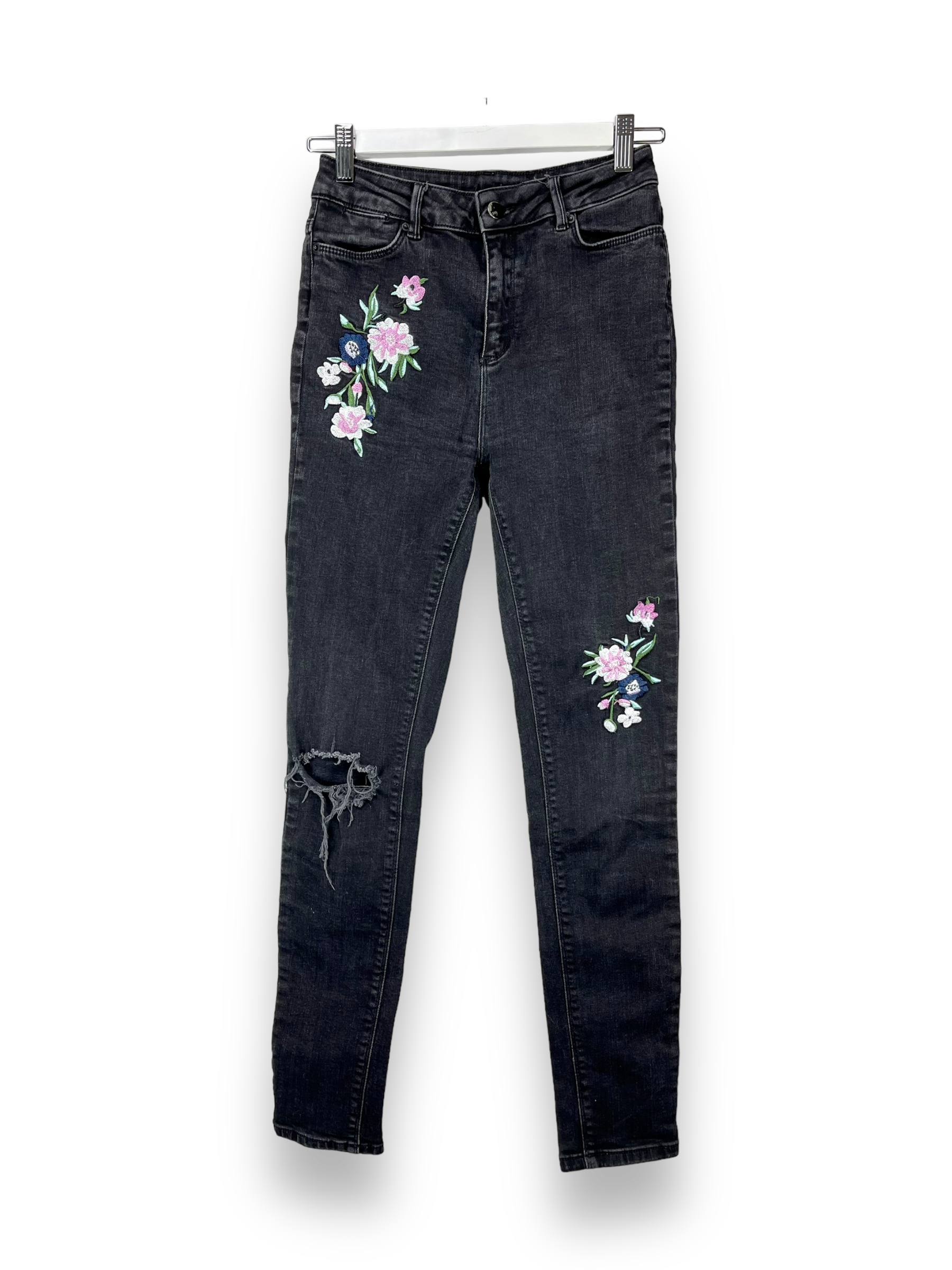 Die Jeans hier ist ganz toll, da sie uni schwarz ist, aber an beiden Beinen ein Blumen-Stick hat. Am linken Knie ist die Hose offen und befindet sich ganzen in einem guten Zustand.