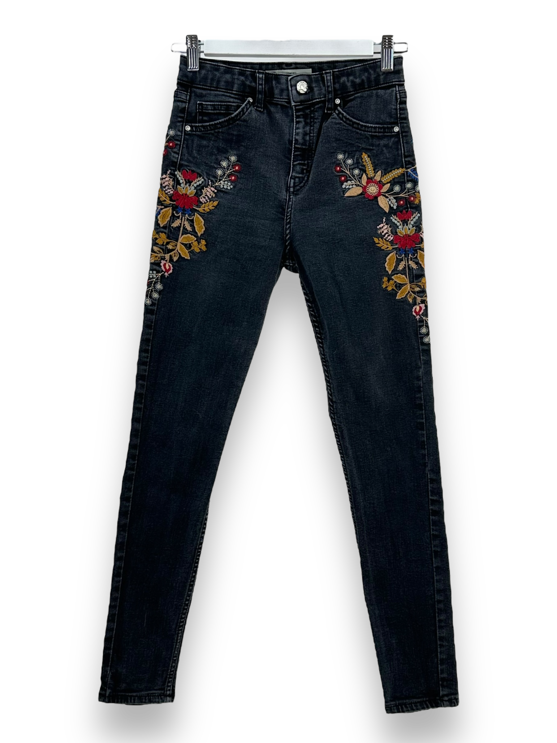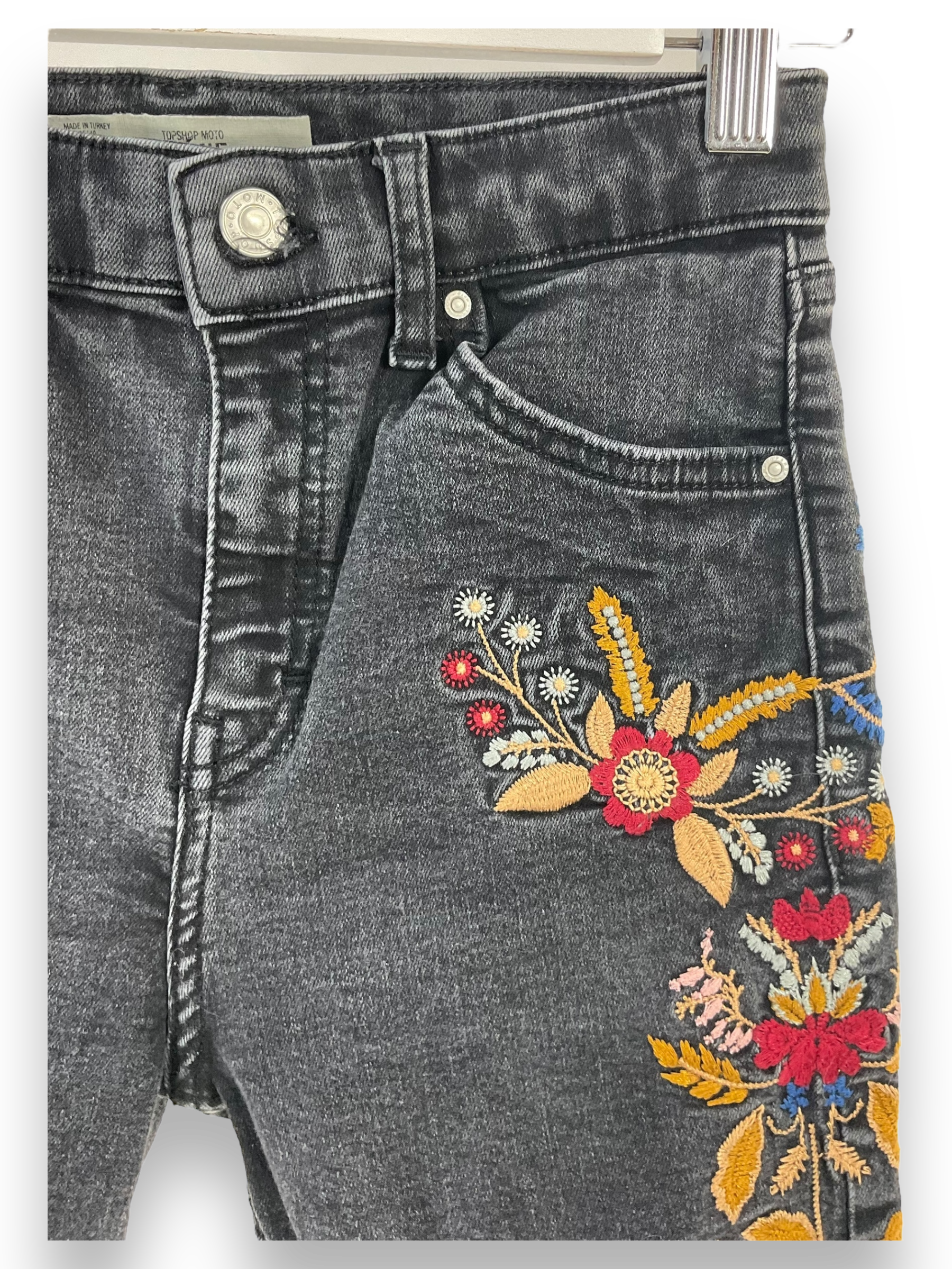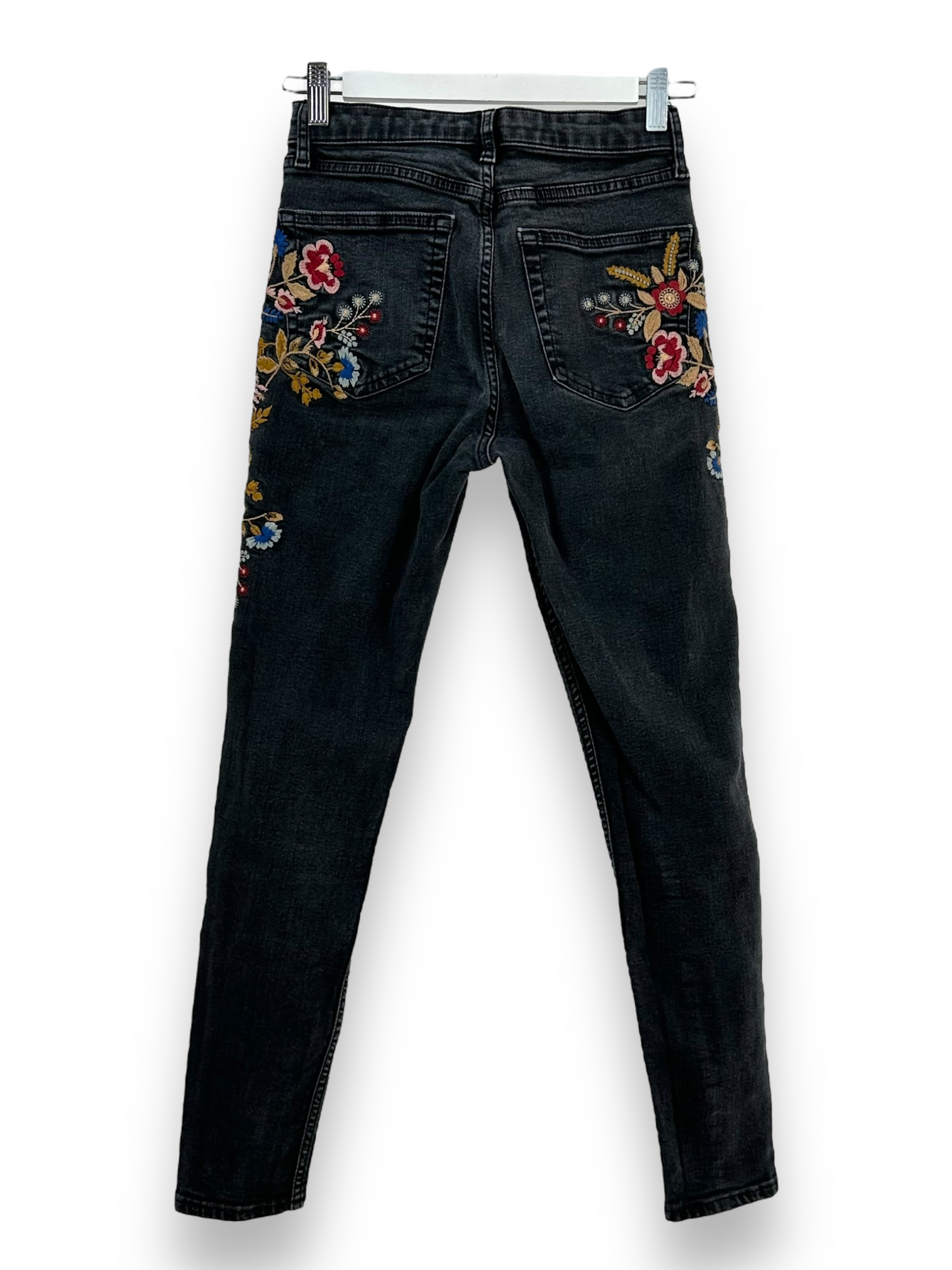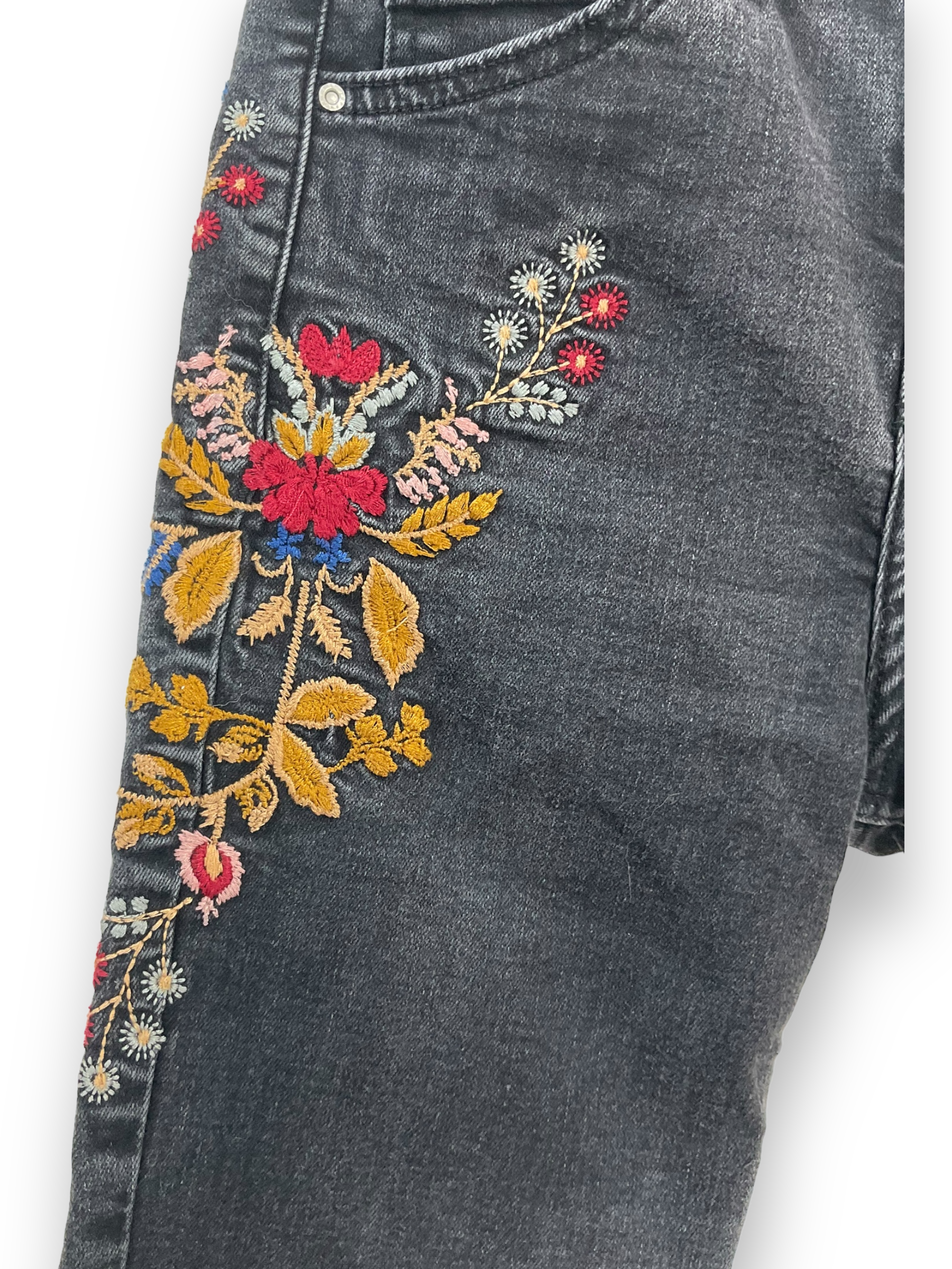 Die Stickereien mit Blumenmuster verleihen der Jeans eine verspielte und feminine Note, die sie zu einem echten Statement-Piece macht. Egal, ob du sie mit einem einfachen T-Shirt für einen lässigen Look oder mit einer Bluse für einen schickeren Anlass kombinierst, diese Jeans wird deinem Outfit einen Hauch von Individualität verleihen. Trotz ihres Secondhand-Status befindet sich die Jeans in gutem Zustand und wird dir eine stilvolle Option für deinen Alltagslook bieten.