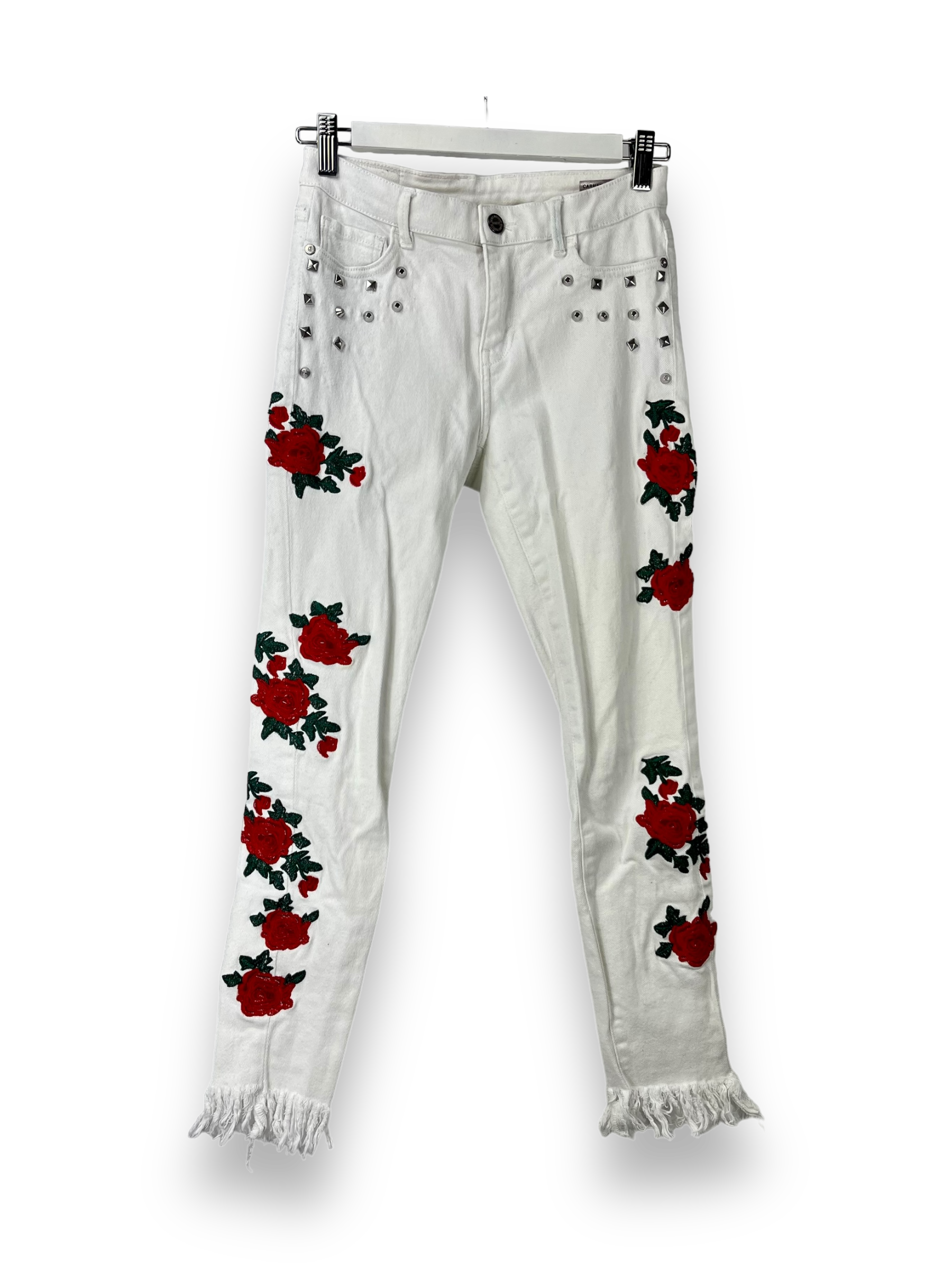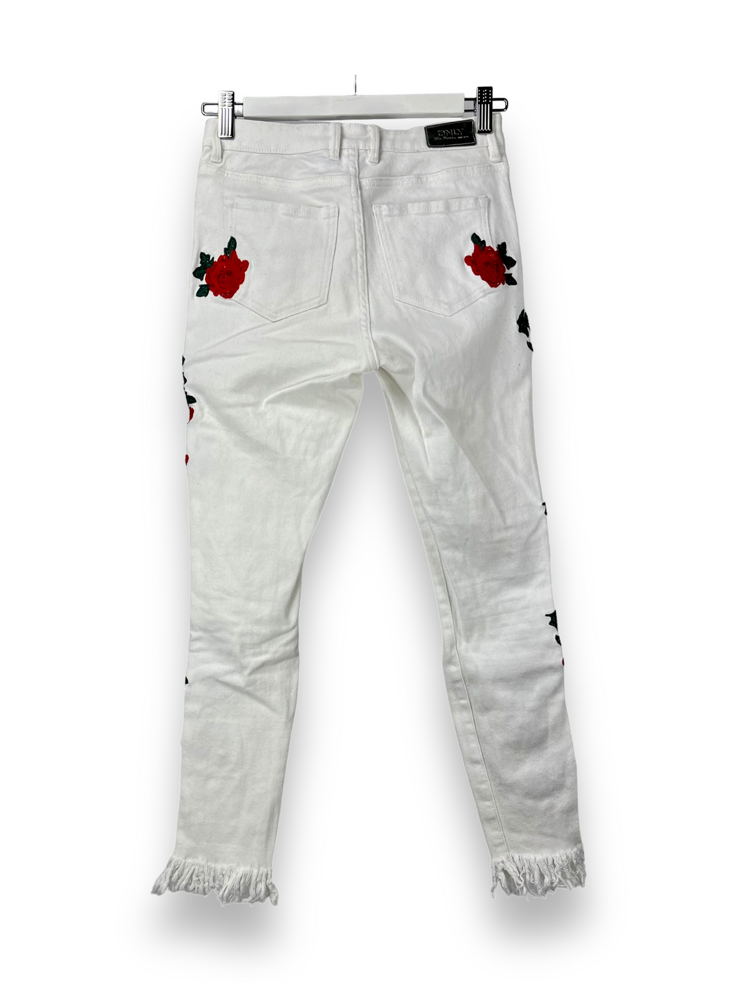 Die Jeans von ONLY ist etwas spezieller. Auf der ganzen Jeans sind Rosenstickereien verteilt, oben bei den Hosensäcken hat es einige Nieten und unten ist die Hose ausgefranst.
