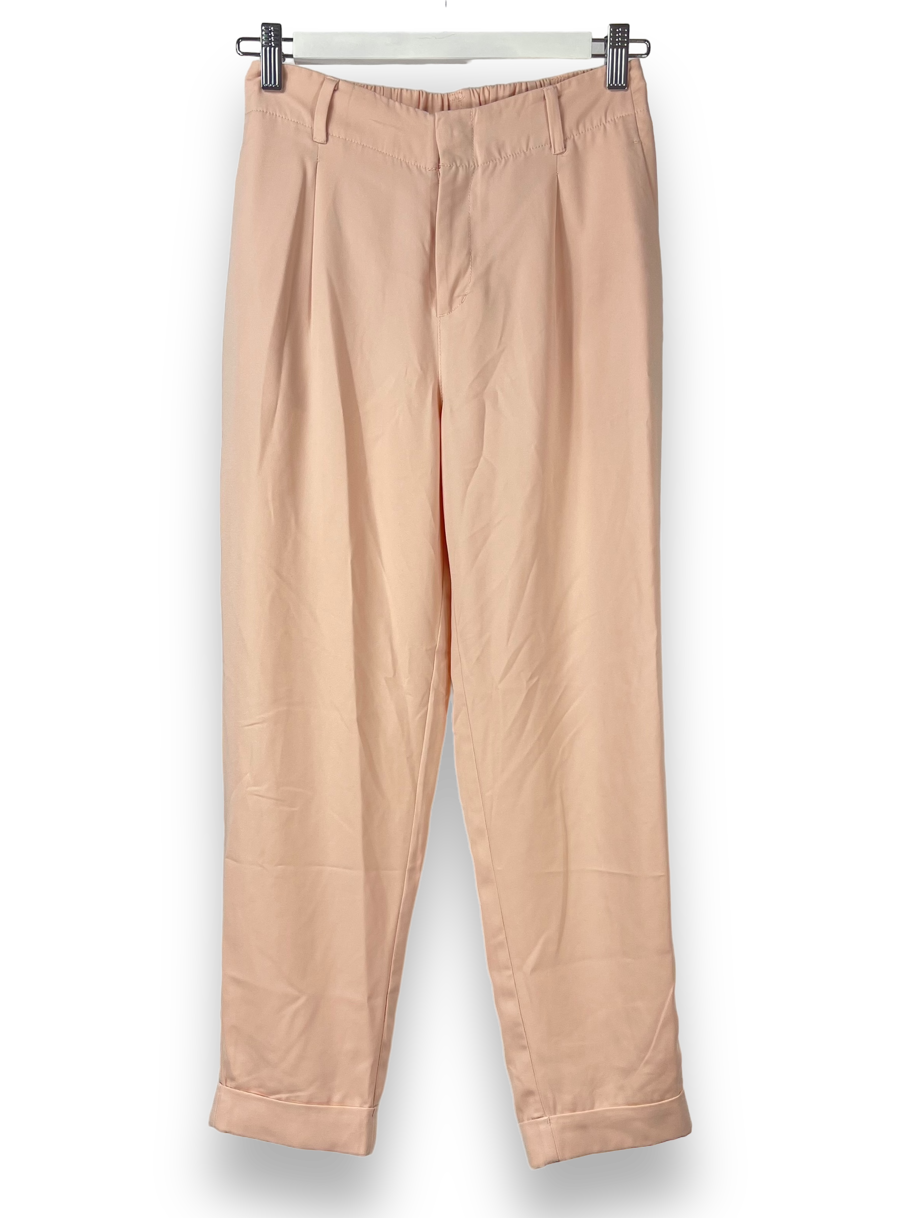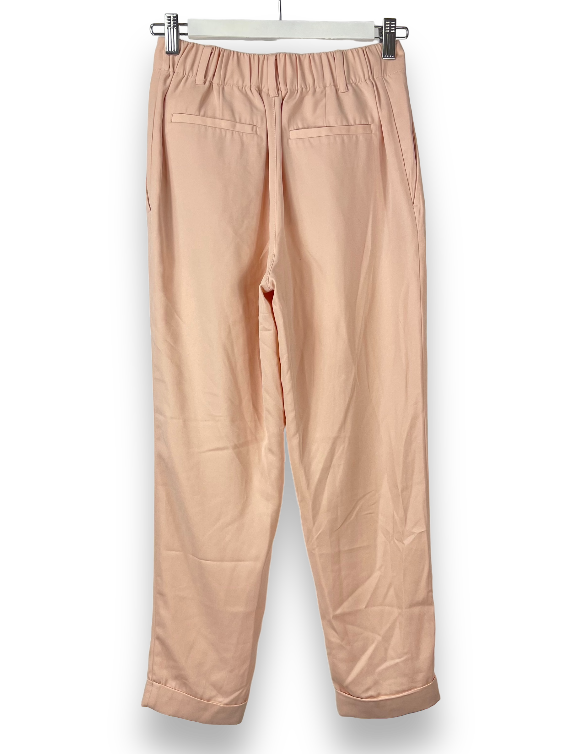 Die luftige Stoffhose ist super für die etwas wärmeren Tage. Mit dem geraden Schnitt, ist sie nicht direkt am Körper und fällt eher locker. Der hintere Bund beinhaltet einen Gummizug und die Hose befindet sich in einem guten Zustand.