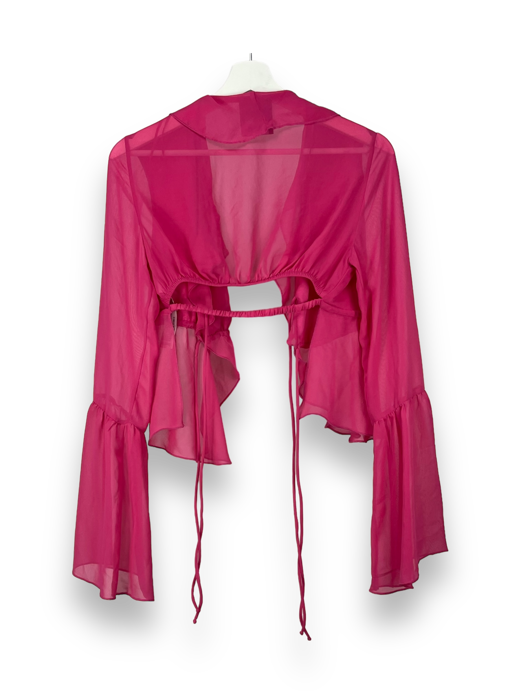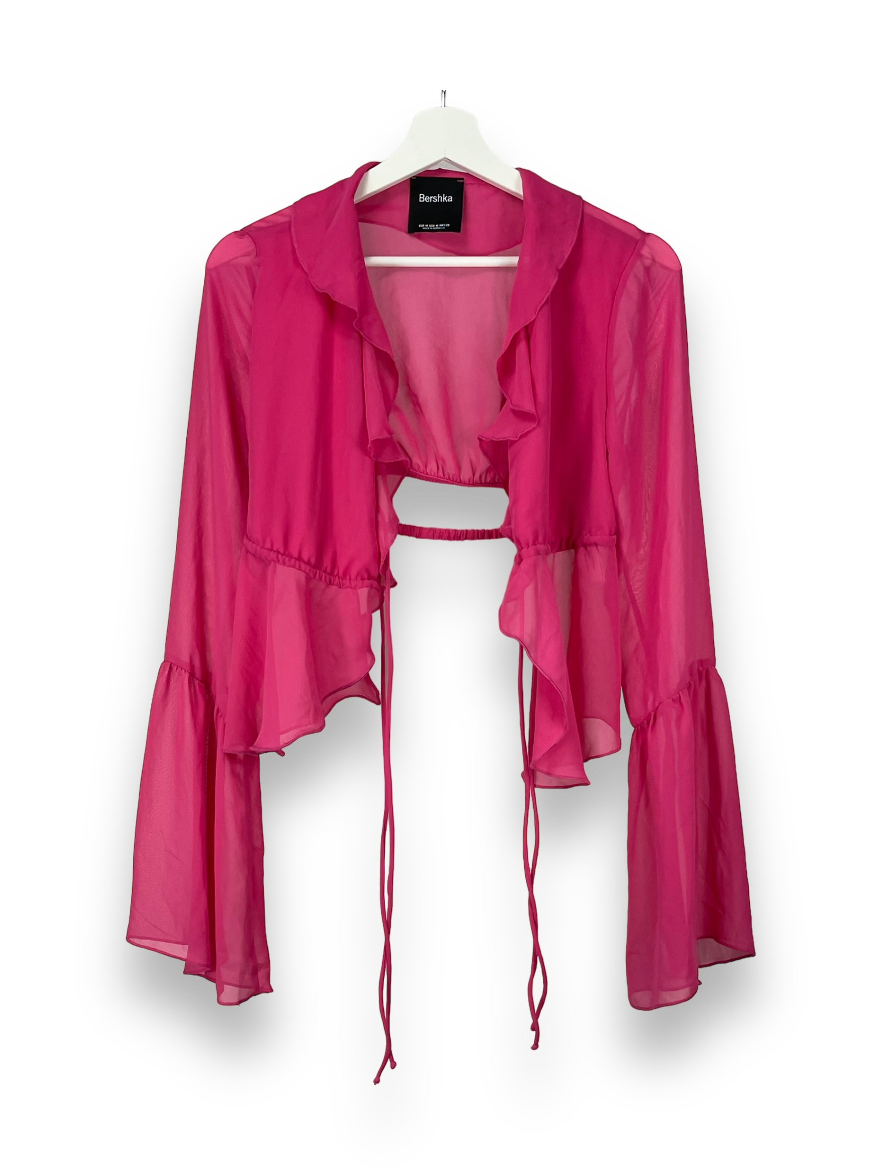 Für einen lässigen und smarten Look passt einen Bolero am besten zu Röhrenjeans und Tanktop - die kurze Jacke sorgt für einen edlen Touch in diesem Look. Hier haben wir eine in uni pink mit Trompetenärmel. Hinten hält es sich mit einem feinen Gummiband und vorne lässt es sich binden.