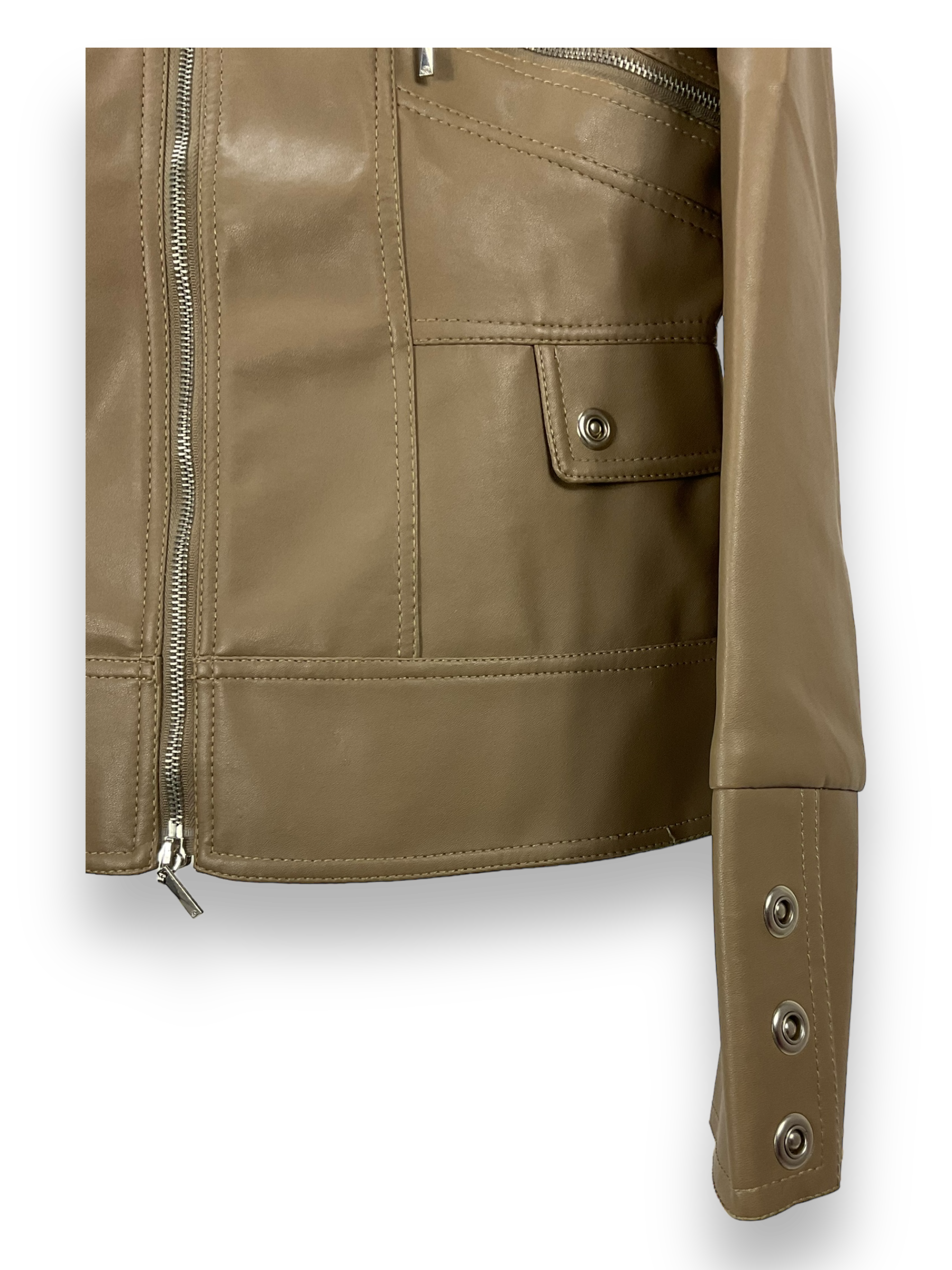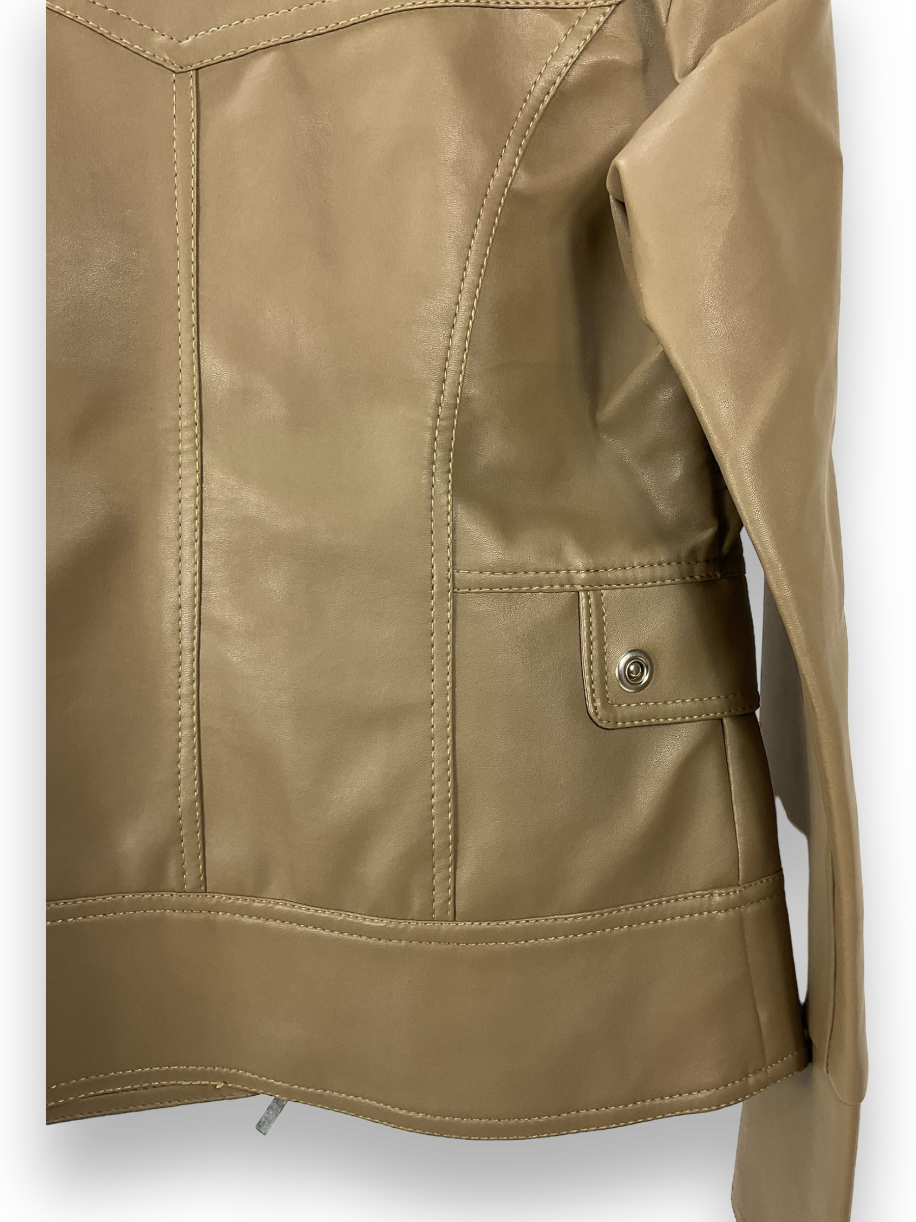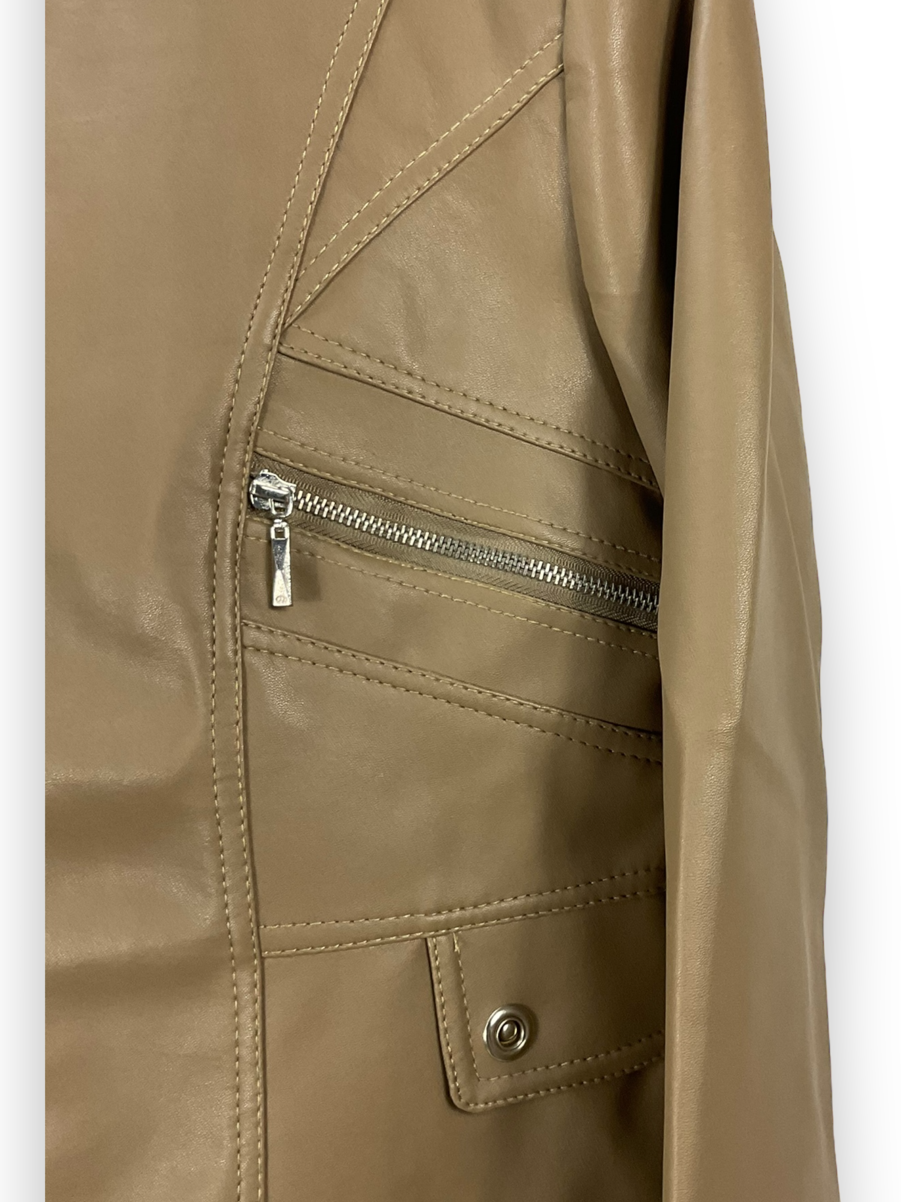 Diese braun-beige Lederjacke ist ein echtes Highlight für deinen Kleiderschrank! Mit ihrem zeitlosen Design und langen Ärmeln bietet sie vielseitige Kombinationsmöglichkeiten. Der Stehkragen verleiht der Jacke eine elegante Note, während der Reißverschluss vorne und an der Brust für einen modernen Akzent sorgt. Hergestellt aus hochwertigem Kunstleder, ist sie nicht nur stylish, sondern auch tierfreundlich.
