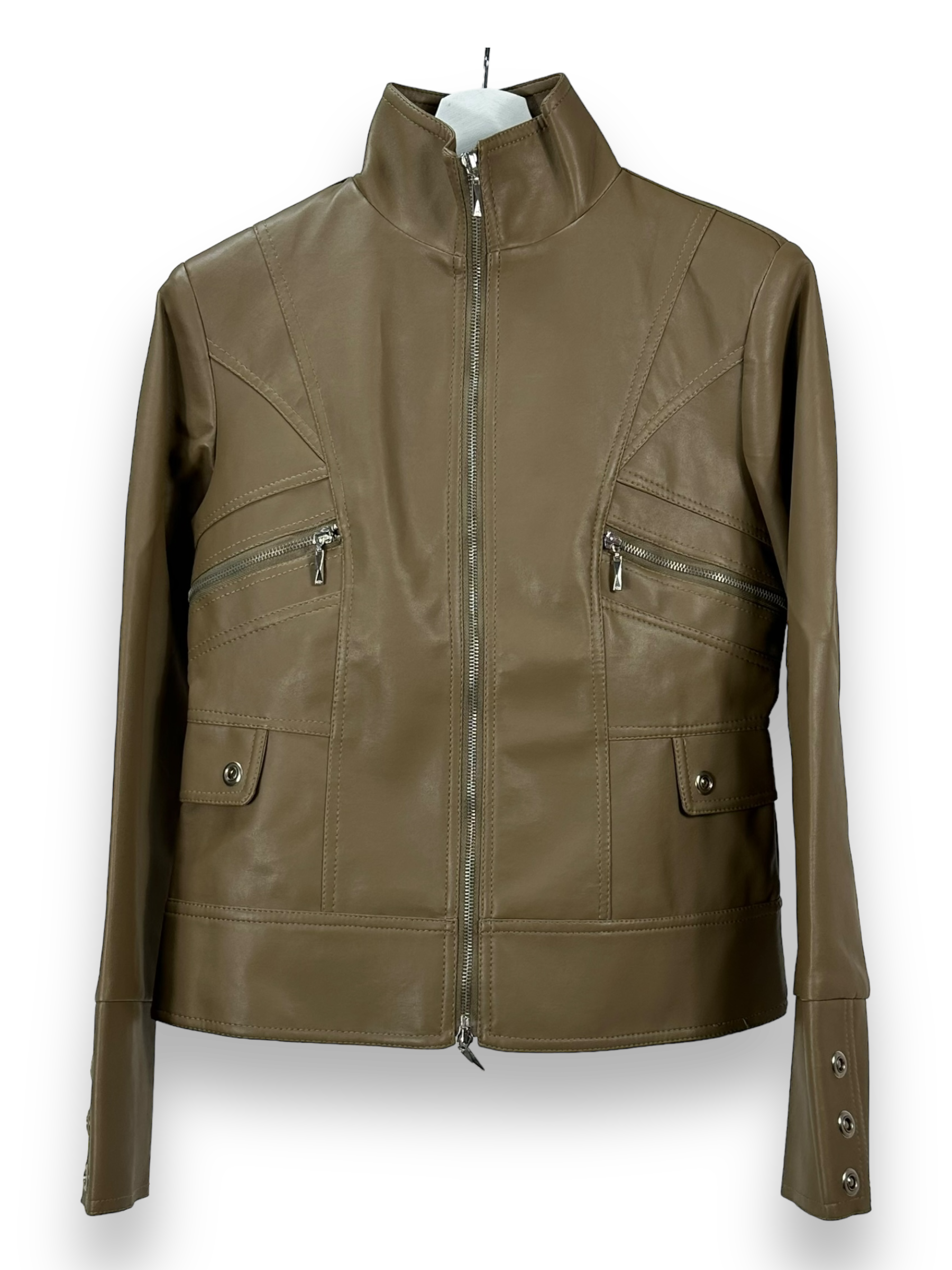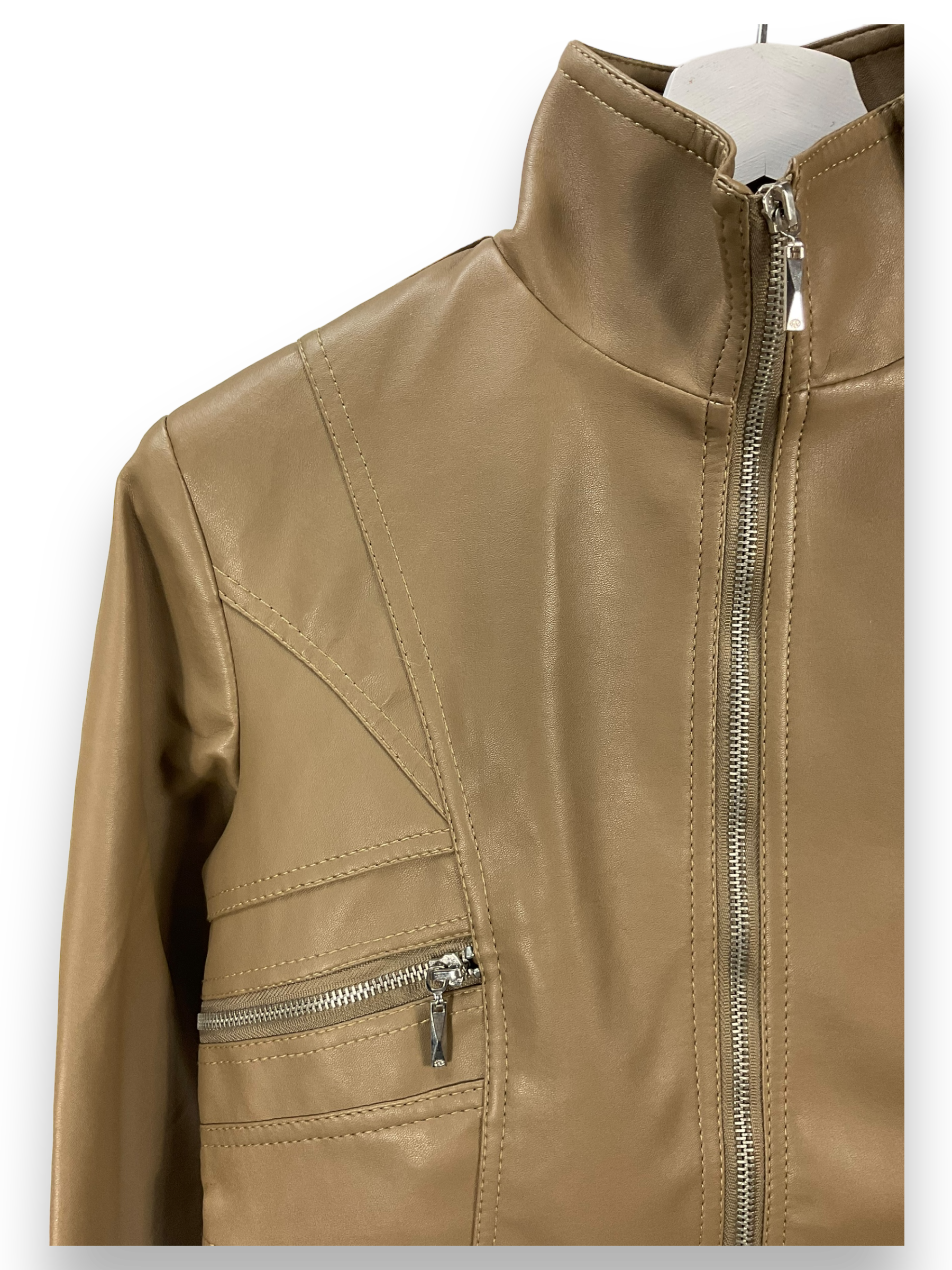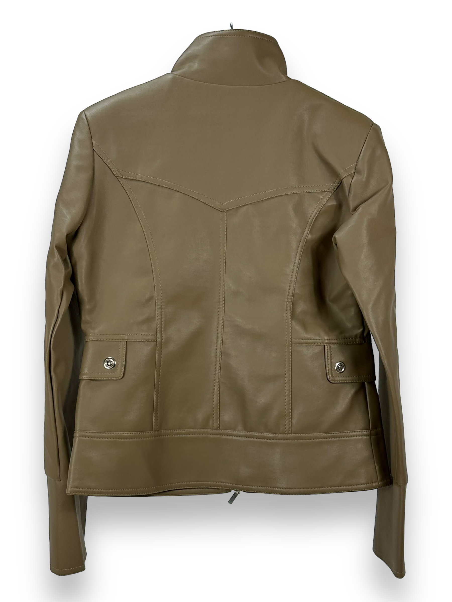 Diese braun-beige Lederjacke ist ein echtes Highlight für deinen Kleiderschrank! Mit ihrem zeitlosen Design und langen Ärmeln bietet sie vielseitige Kombinationsmöglichkeiten. Der Stehkragen verleiht der Jacke eine elegante Note, während der Reißverschluss vorne und an der Brust für einen modernen Akzent sorgt. Hergestellt aus hochwertigem Kunstleder, ist sie nicht nur stylish, sondern auch tierfreundlich.