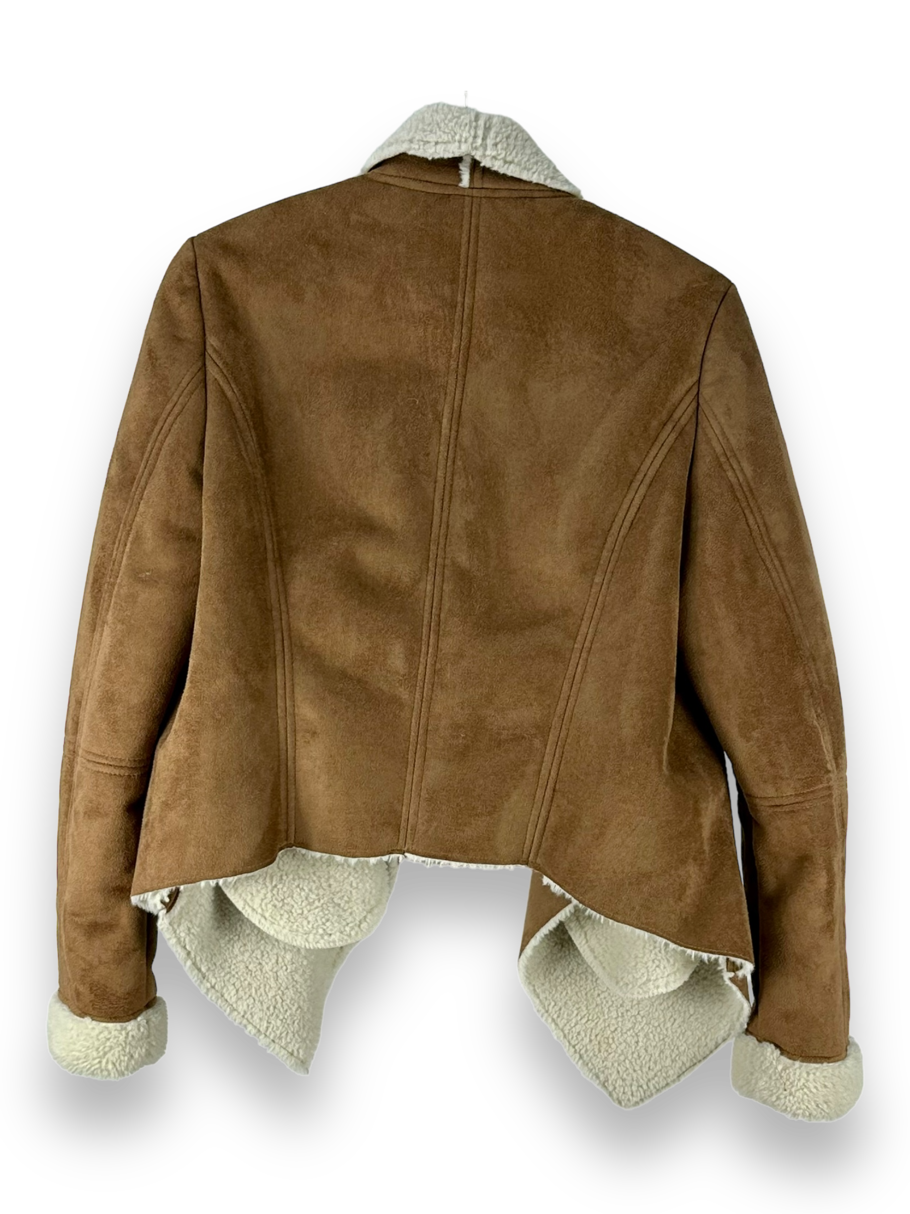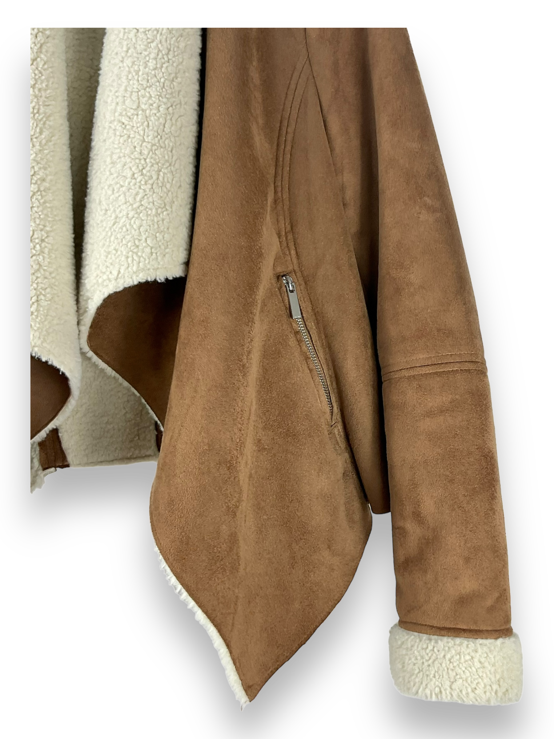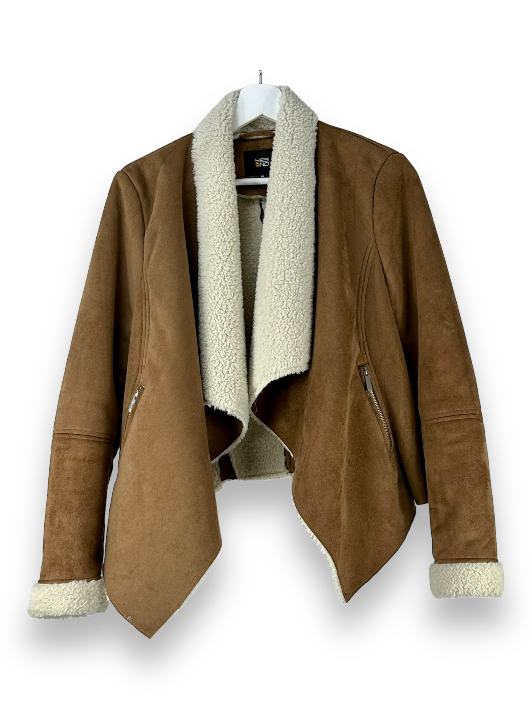 In einem eleganten Farbmix aus braun, cognac und weiss ist diese Jacke die perfekte Wahl für die kalte Jahreszeit oder den Übergang. Mit langen Ärmeln und einem unifarbenen Design in Kunstleder-Velours Optik strahlt sie eine zeitlose Eleganz aus.