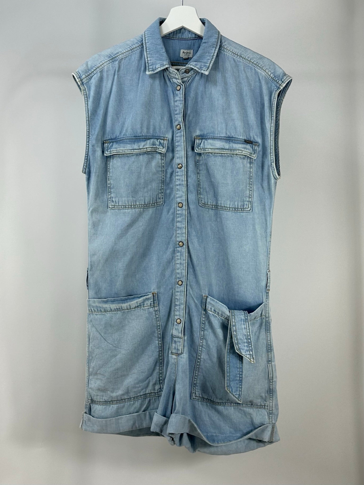 Der blaue Jumpsuit von Pepe Jeans vereint Stil und Komfort auf harmonische Weise. Gefertigt aus hochwertiger Baumwolle bietet dieser Jumpsuit ein angenehmes Tragegefühl und eine lässige Eleganz. Mit seinem unifarbenen Denim-Look strahlt er eine zeitlose Modernität aus. Der Jumpsuit ist ärmellos und kurz geschnitten, was eine luftige Atmosphäre schafft und Ihre Silhouette zur Geltung bringt. Die gerade bis leicht taillierte Passform sorgt für eine bequeme und dennoch schmeichelhafte Passung. Die praktischen Details wie die vielseitigen Taschen und die Druckknopfleiste verleihen dem Jumpsuit eine funktionale Note. Der beiliegende Taillengürtel setzt Akzente und betont die Taille auf elegante Weise. Mit dem Pepe Jeans Jumpsuit holen Sie sich ein vielseitiges Kleidungsstück, das mühelose Eleganz und Tragekomfort vereint.