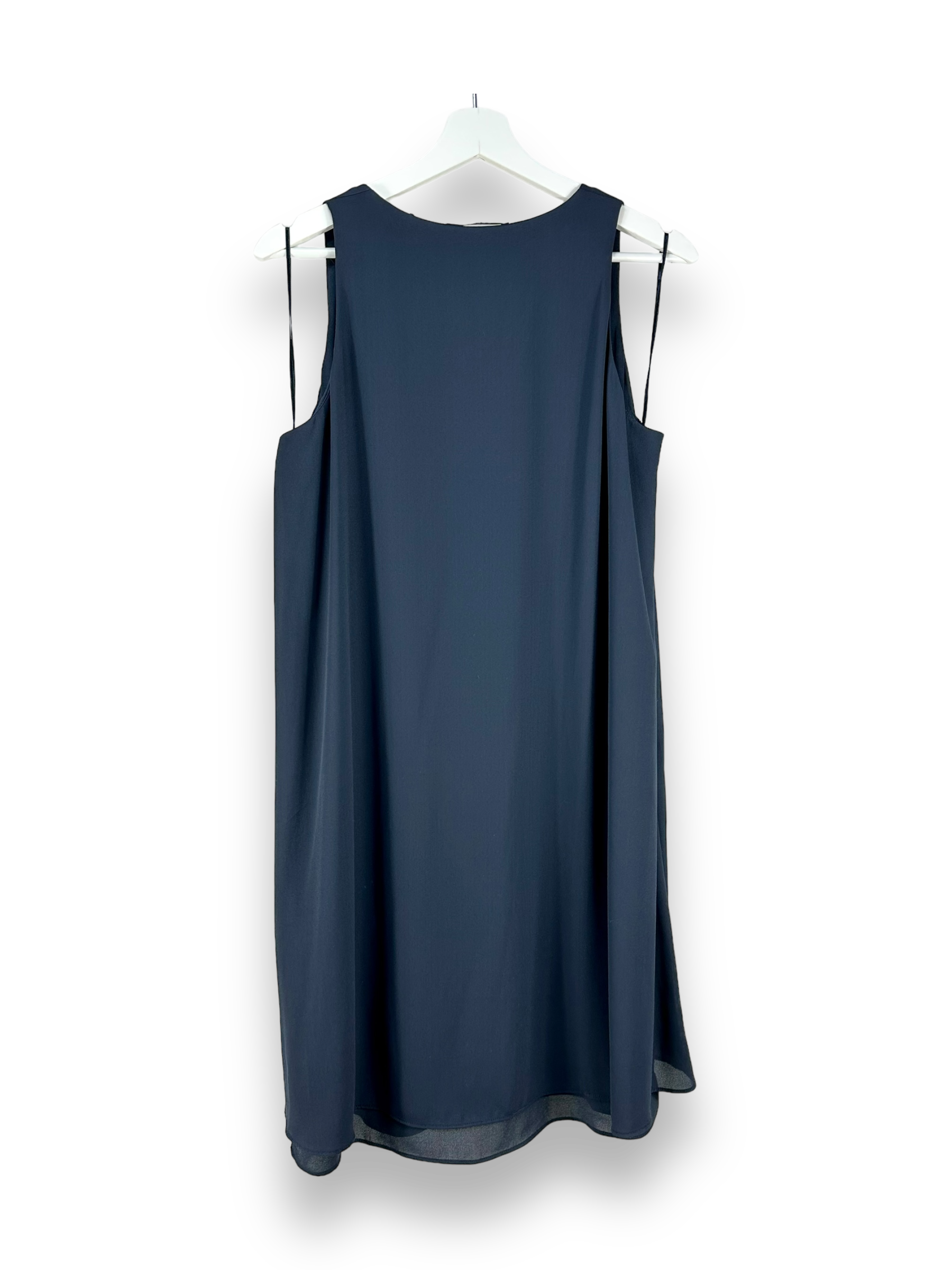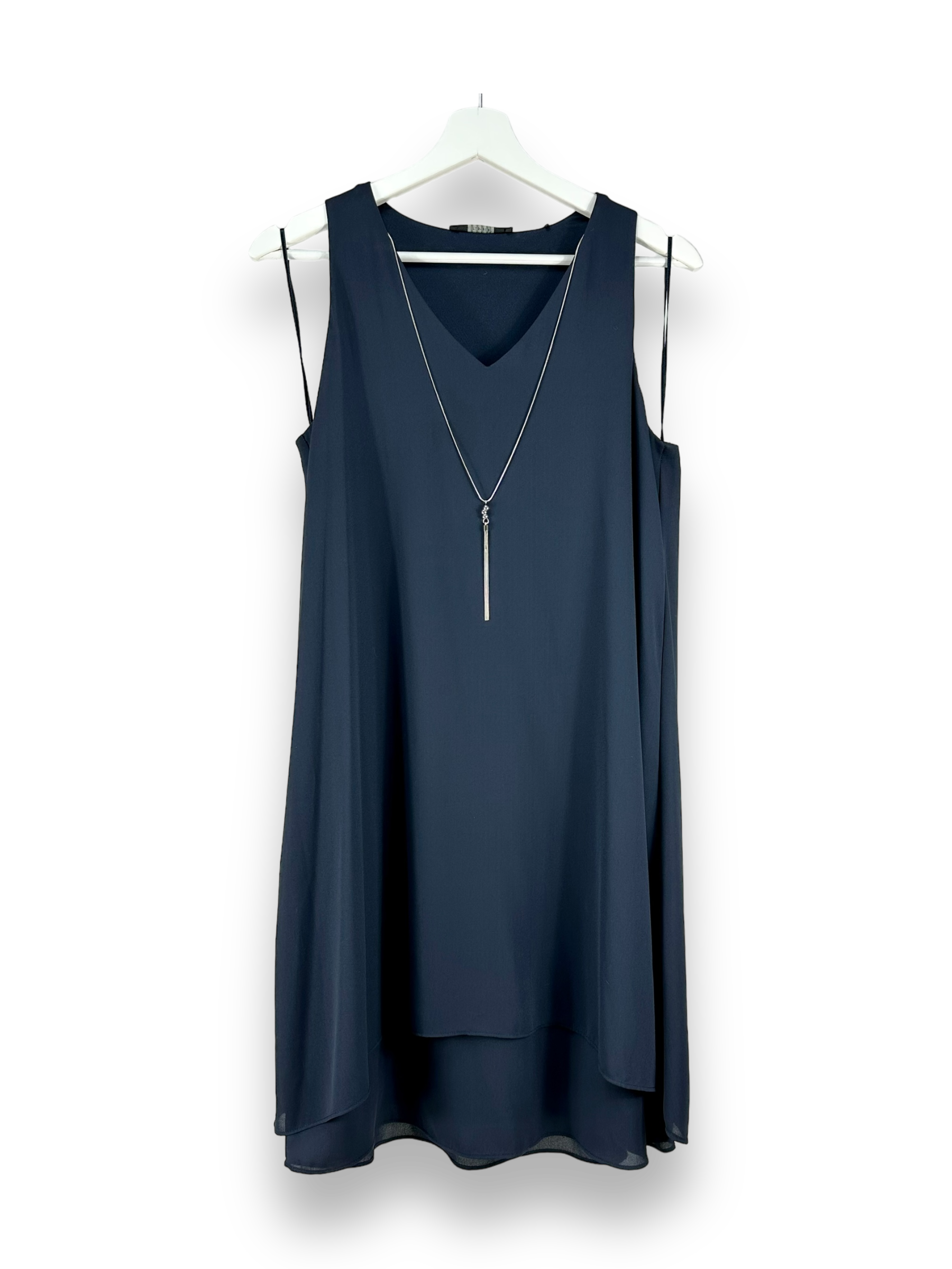 Das uni, dunkelblaue Kleid mit einer feinen Kette vorne ist oberschenkellang und hat einen geraden, leichten A-Schnitt. Es ist ärmellos und besteht aus drei Schichten. Man kann es super als leichtes Kleid in der Freizeit oder zu einem schönen Abendessen tragen.