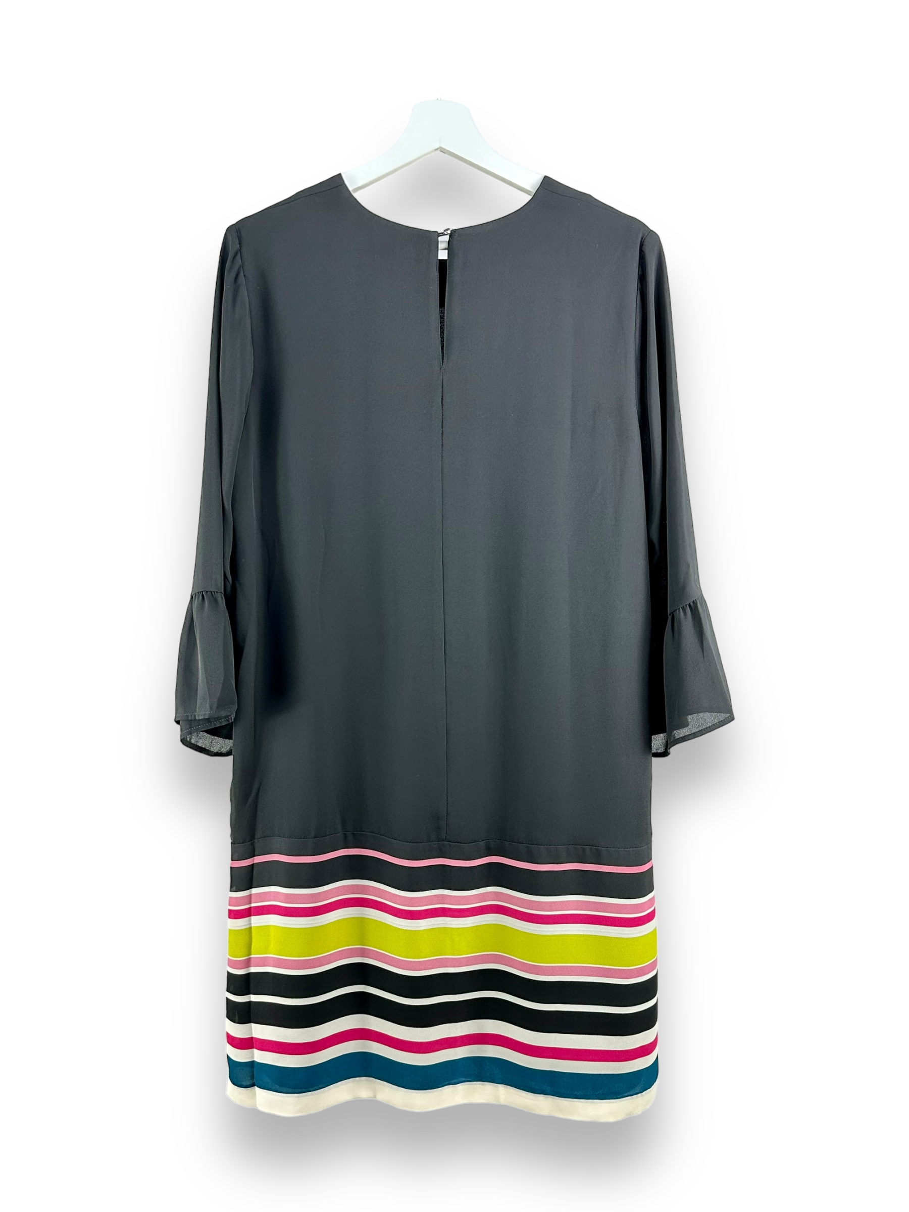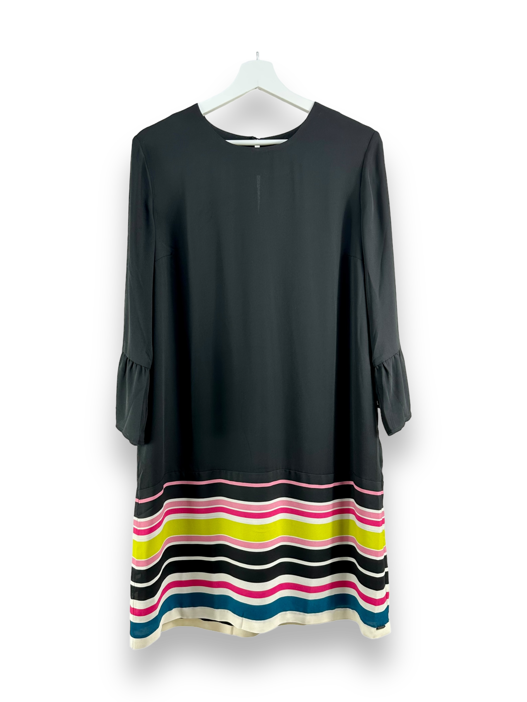 Hier haben wir ein lässiges Kleid von Pepe Jeans in schwarz mit mehrfarbigen, diversen Streifen unten. So kann es mit tollen farbigen Details kombiniert werden und man wird damit garantiert ein Hingucker sein. Es ist knielang und hat einen geraden Schnitt. Die Ärmel sind 3/4 lang mit Trompetenärmel. Das Kleid trägt zwei Schichten und hat hinten ein kleiner Knopf als Verschluss.