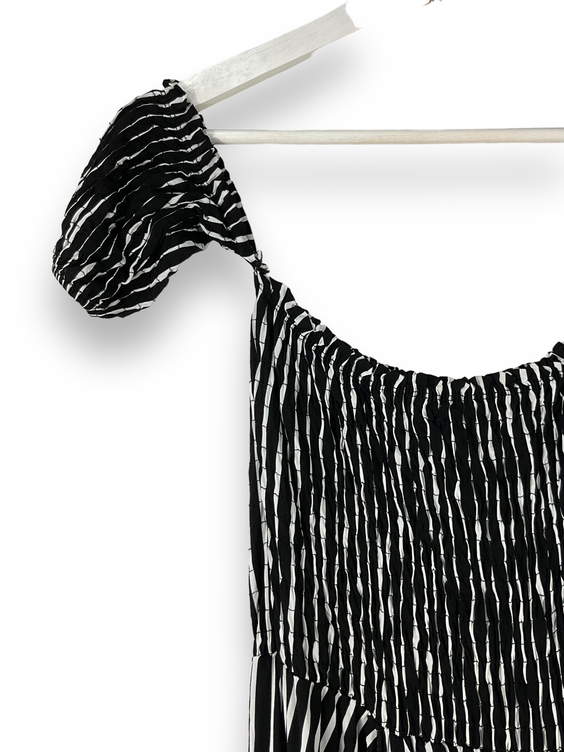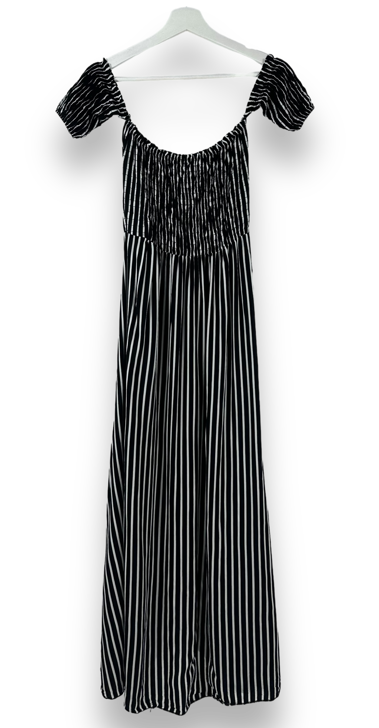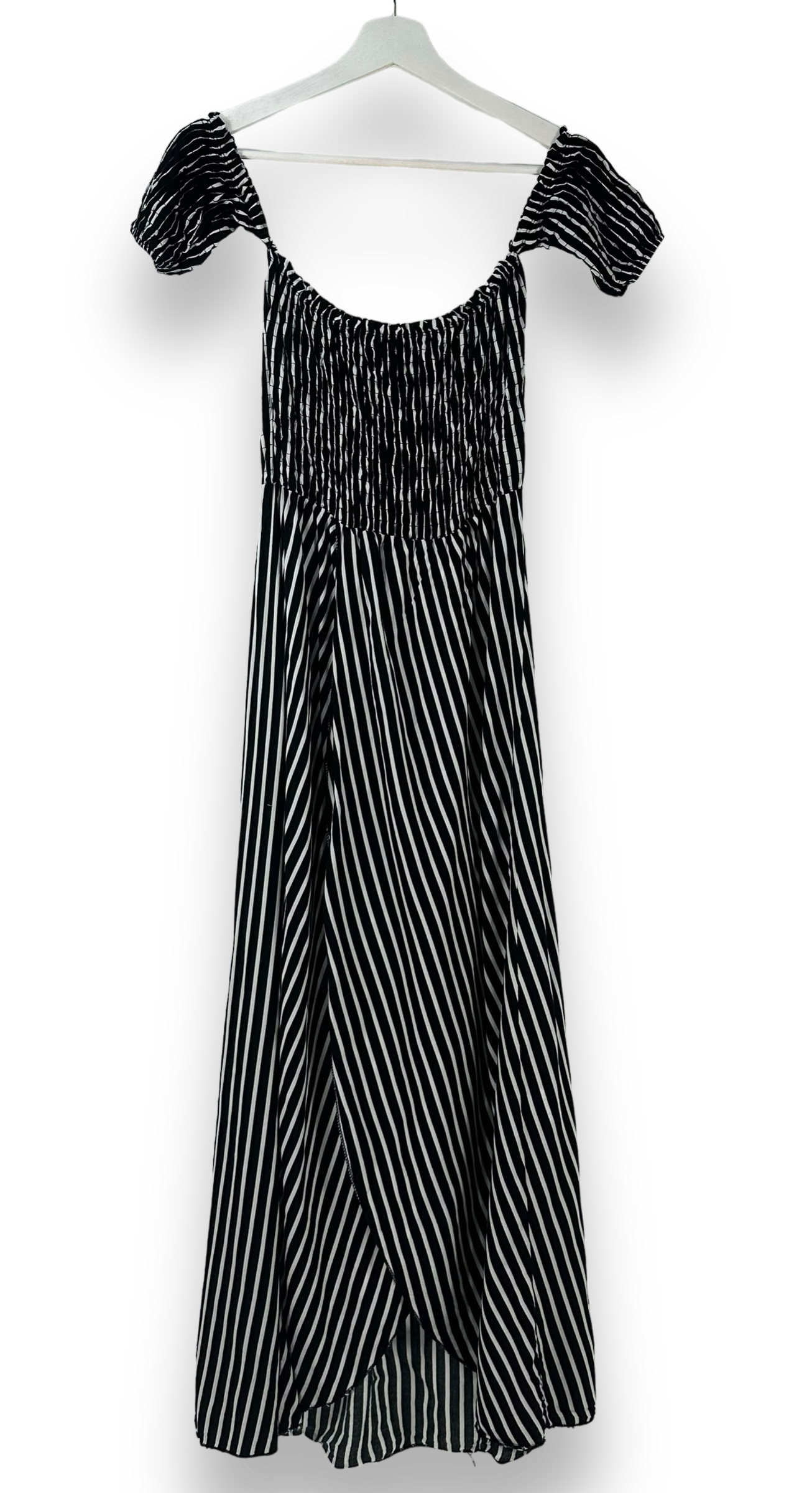 Das zeitlose Streifenmuster verleiht diesem Kleid eine klassische Note, während seine schulterfreie Optik für einen Hauch von Eleganz sorgt. Die leichte und luftige Beschaffenheit macht dieses Kleid perfekt für sonnige Tage. Unser Kleid befindet sich in gutem Zustand und wird dich stilvoll durch den Sommer begleiten.