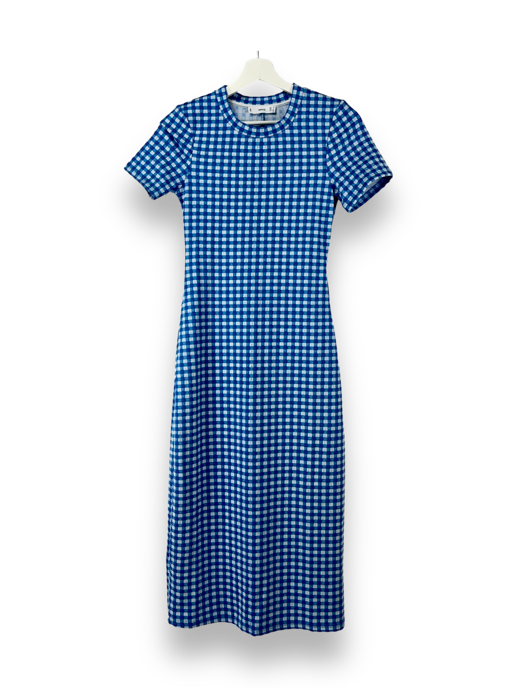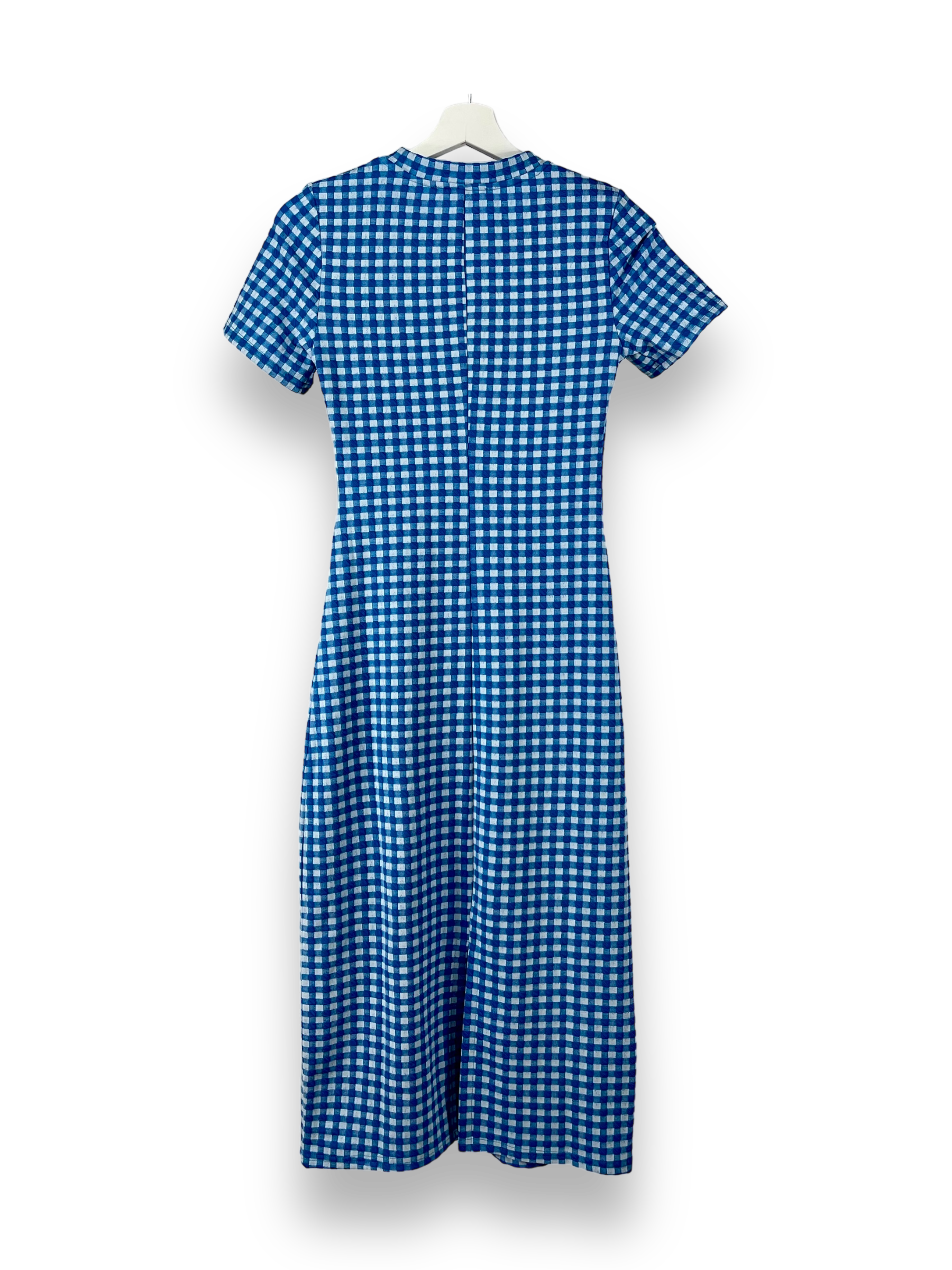 Fehlt dir noch ein lässiges Sommerkleid mit einem engen Schnitt und wadenlang. Das Kleid ist Blau und Weiss kariert und hat hinten einen Schlitz.