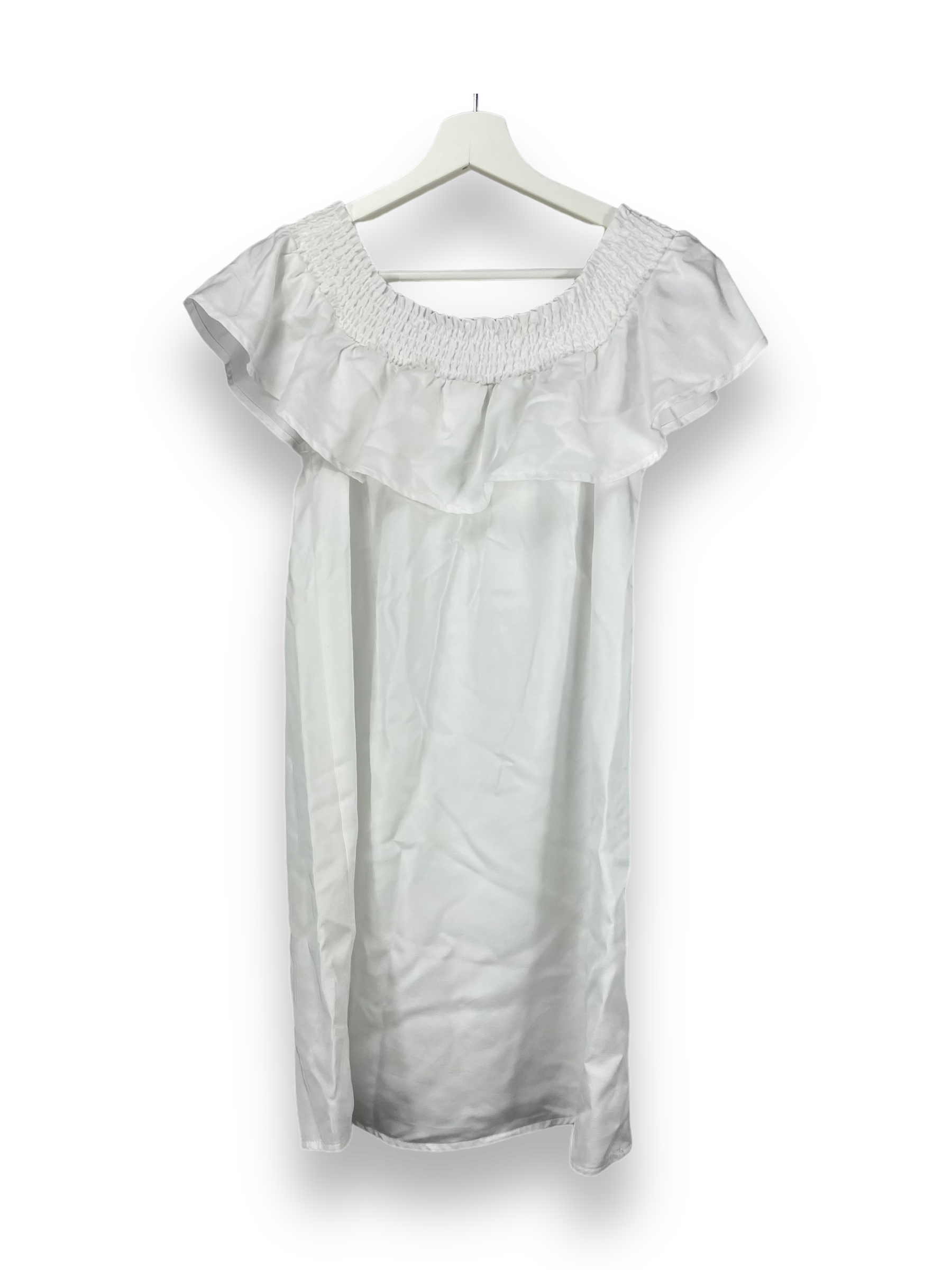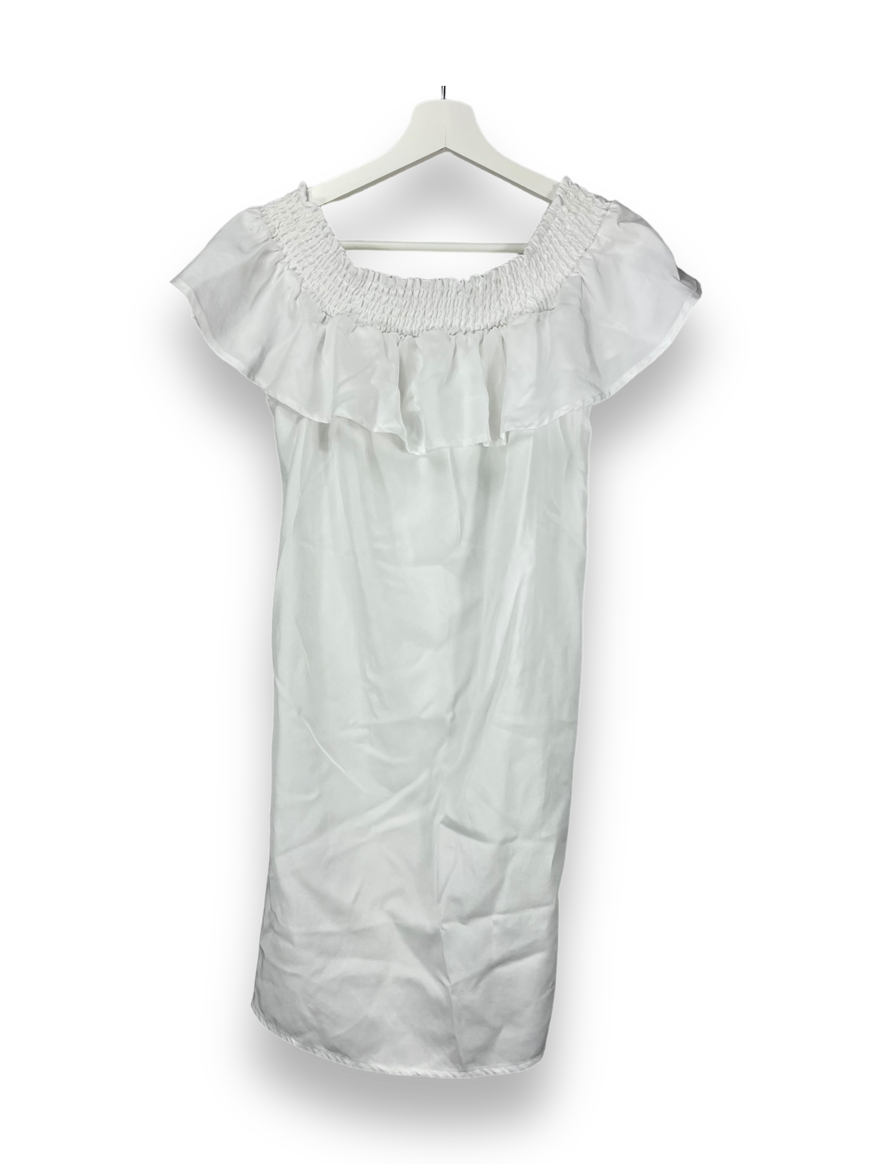 Hier haben wir ein lockeres Sommerkleid in weiss uni, dass knielang ist. Das Kleid kann ganz normal oder auch schulterfrei getragen werden.