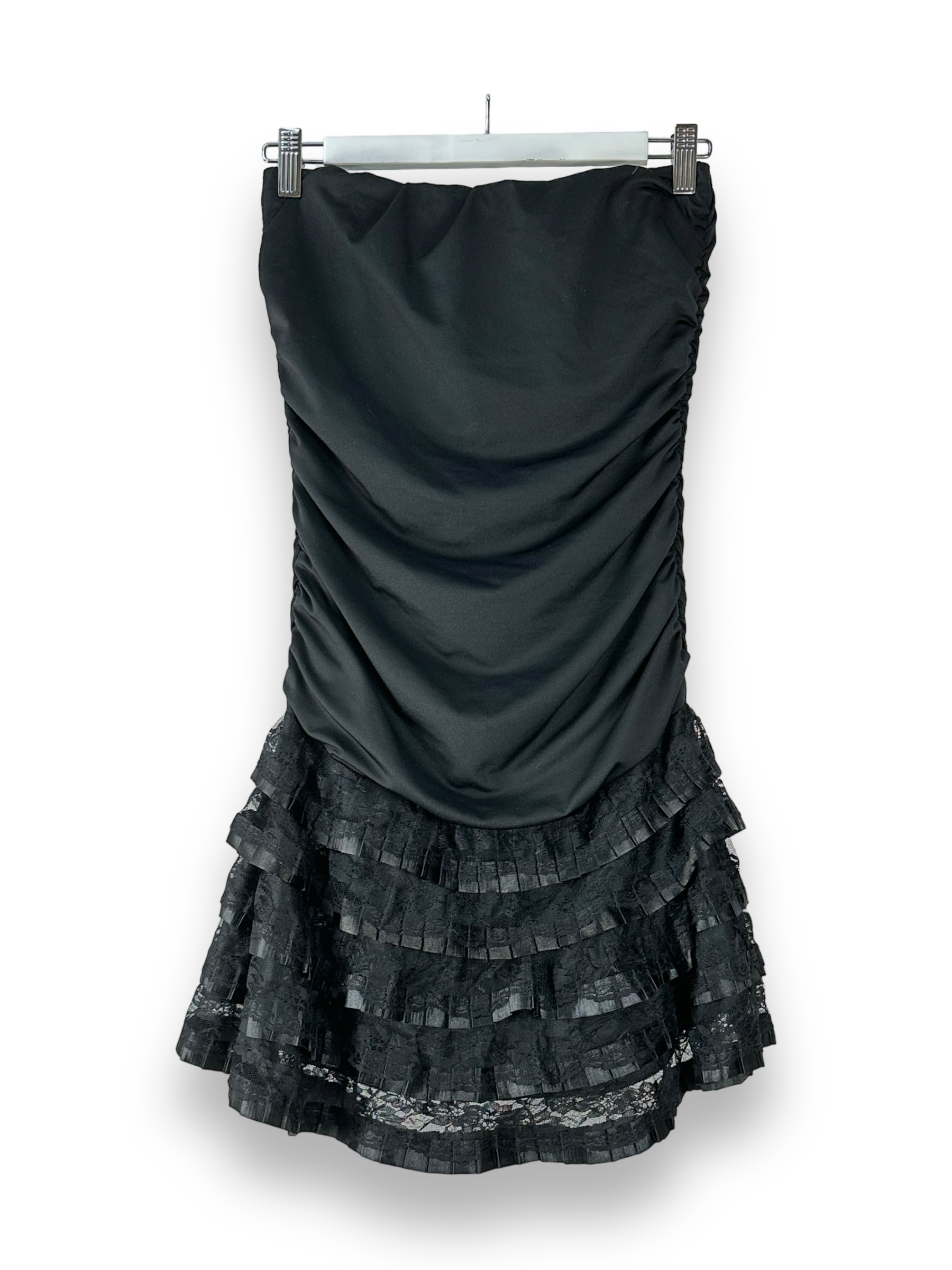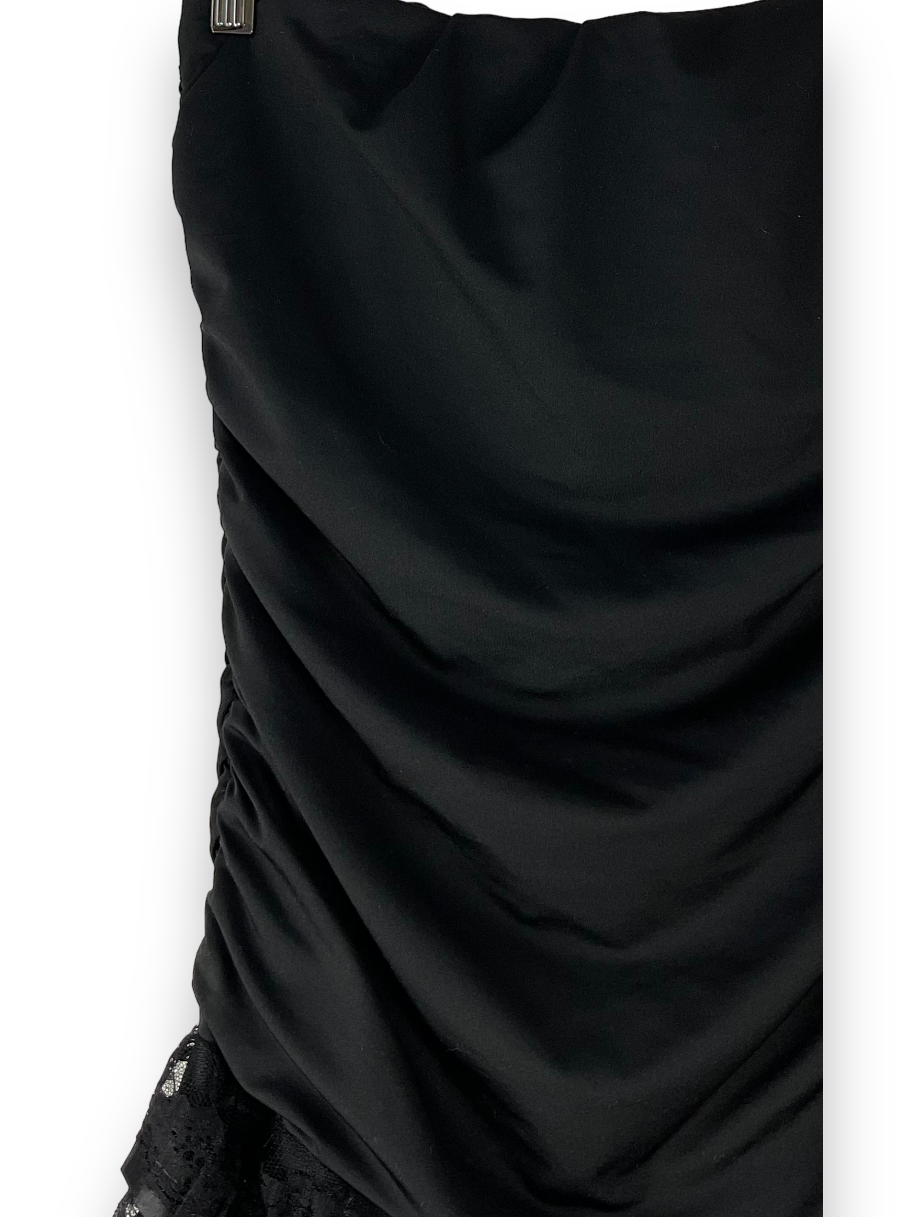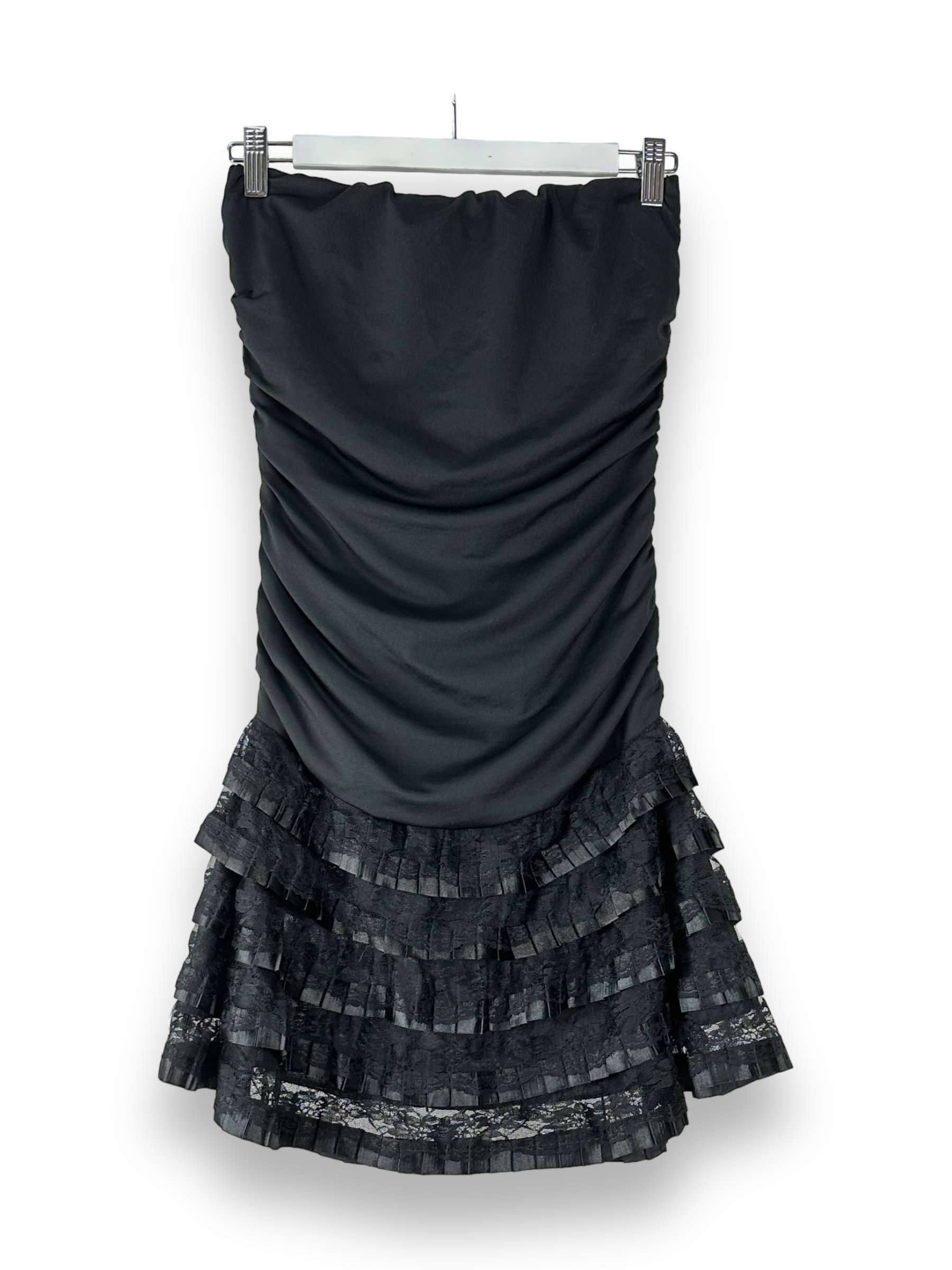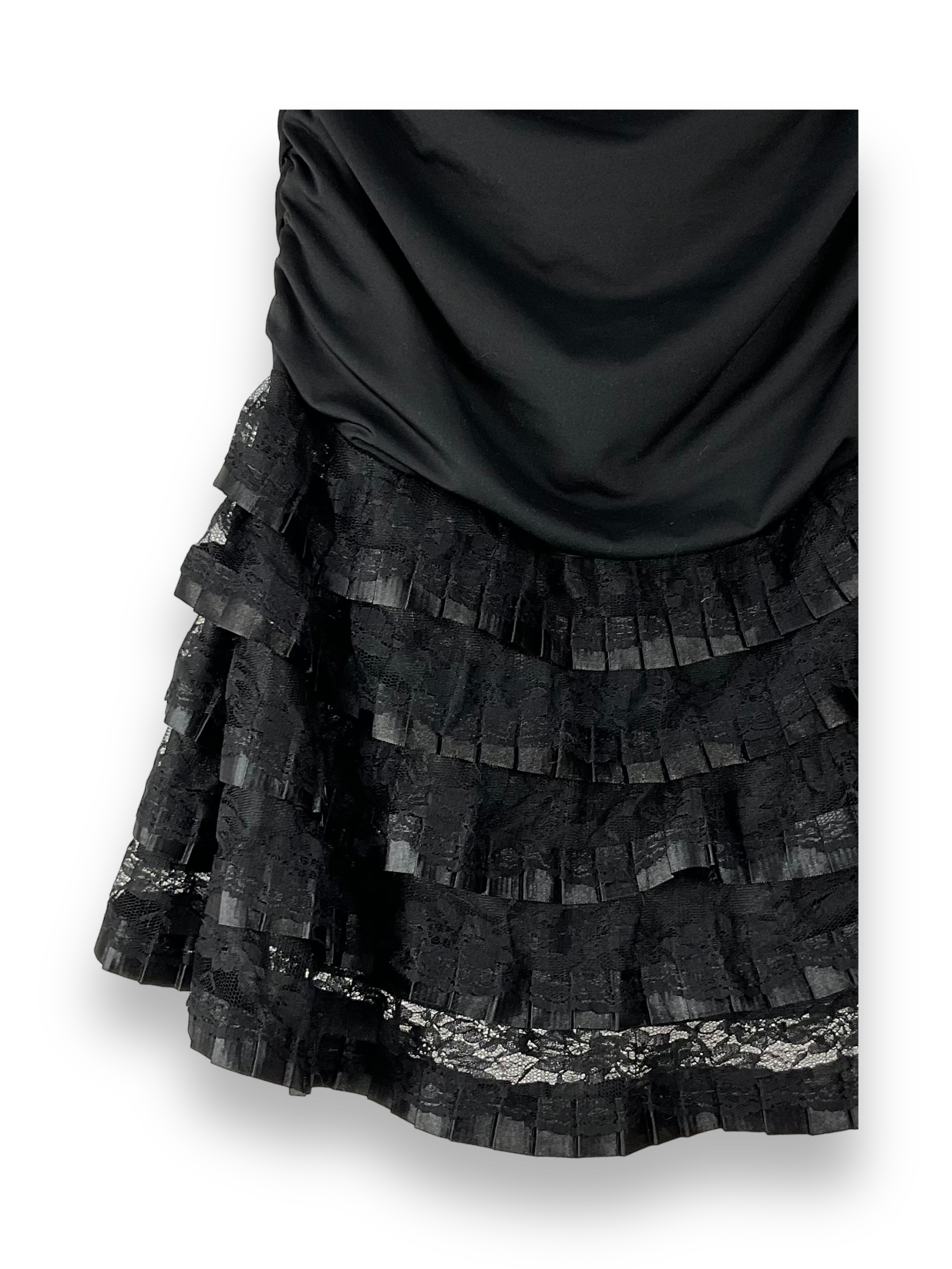 Dieses schwarze Jerseykleid ist die perfekte Wahl für festliche Anlässe und besondere Momente. Das schlichte und dennoch elegante Design dieses Kleides wird Dich begeistern. Das Kleid hat einen angenehmen Tragekomfort und eine gute Passform. Mit seiner kurzen Länge und dem schulterfreien Schnitt verleiht dieses Kleid eine verführerische Ausstrahlung. Die gerade und leicht taillierte Passform schmeichelt Deiner Figur, während die mehrschichtige Jupe Spitze und Plissee-Elemente dem Kleid eine besondere Raffinesse verleihen. Ein Gummiband an der Brust und den Seiten sorgt für einen sicheren Sitz und hohen Tragekomfort. Dieses Jerseykleid ist in einem guten Zustand und wird Dir einen atemberaubenden Look für besondere Anlässe bieten. Egal, ob auf einer Party, einem Abendessen oder einem anderen Event, Du wirst sicherlich im Mittelpunkt der Aufmerksamkeit stehen.