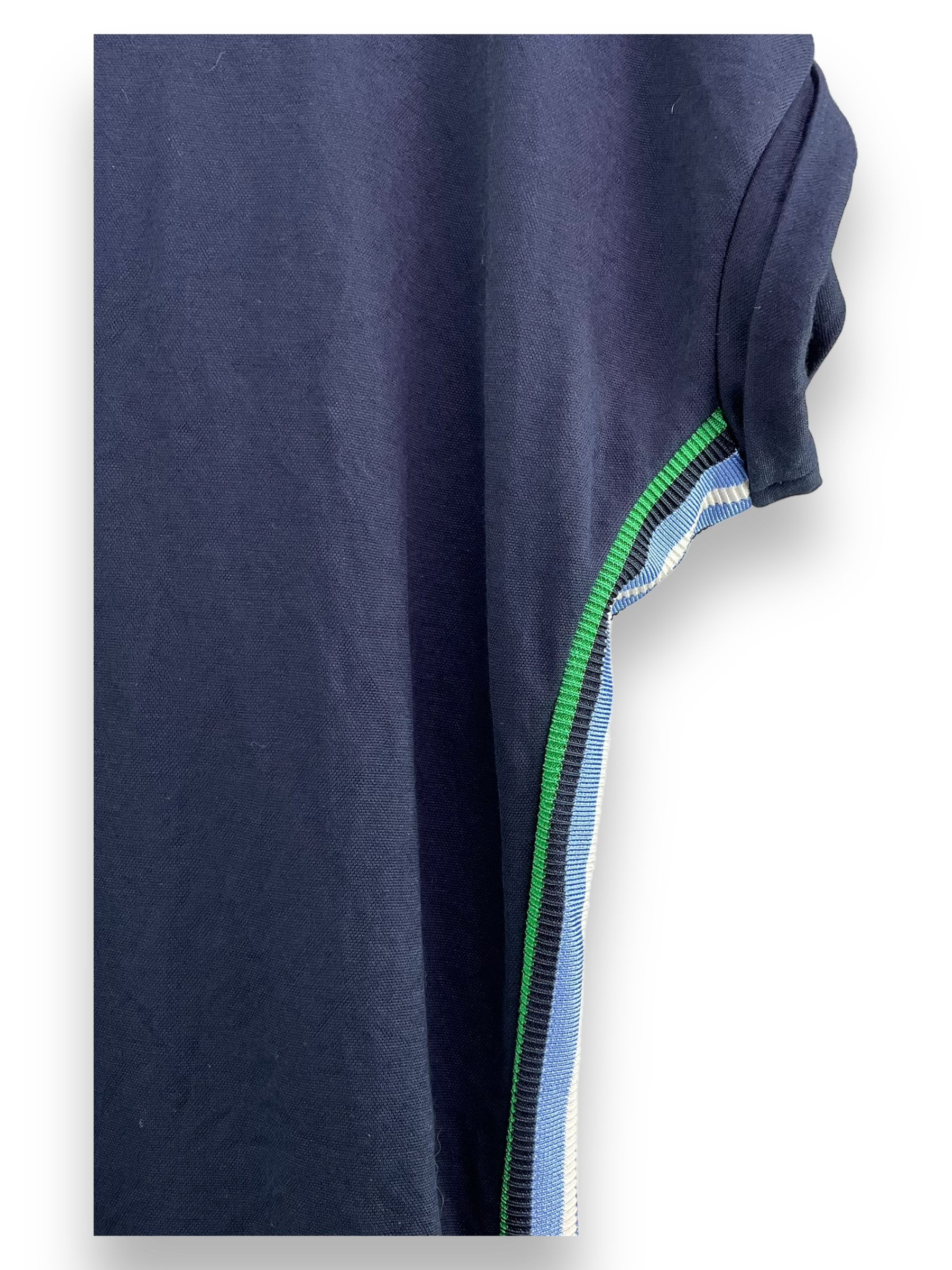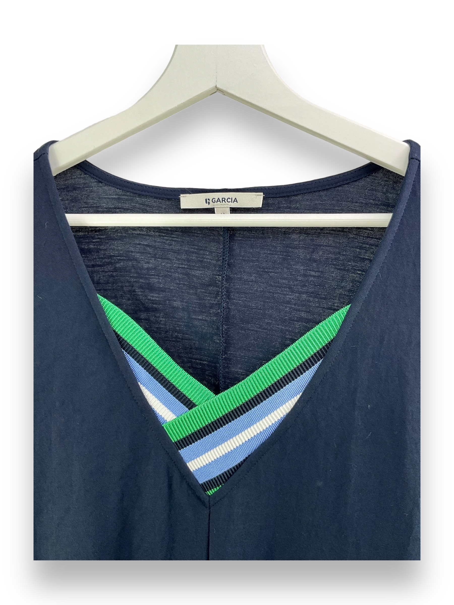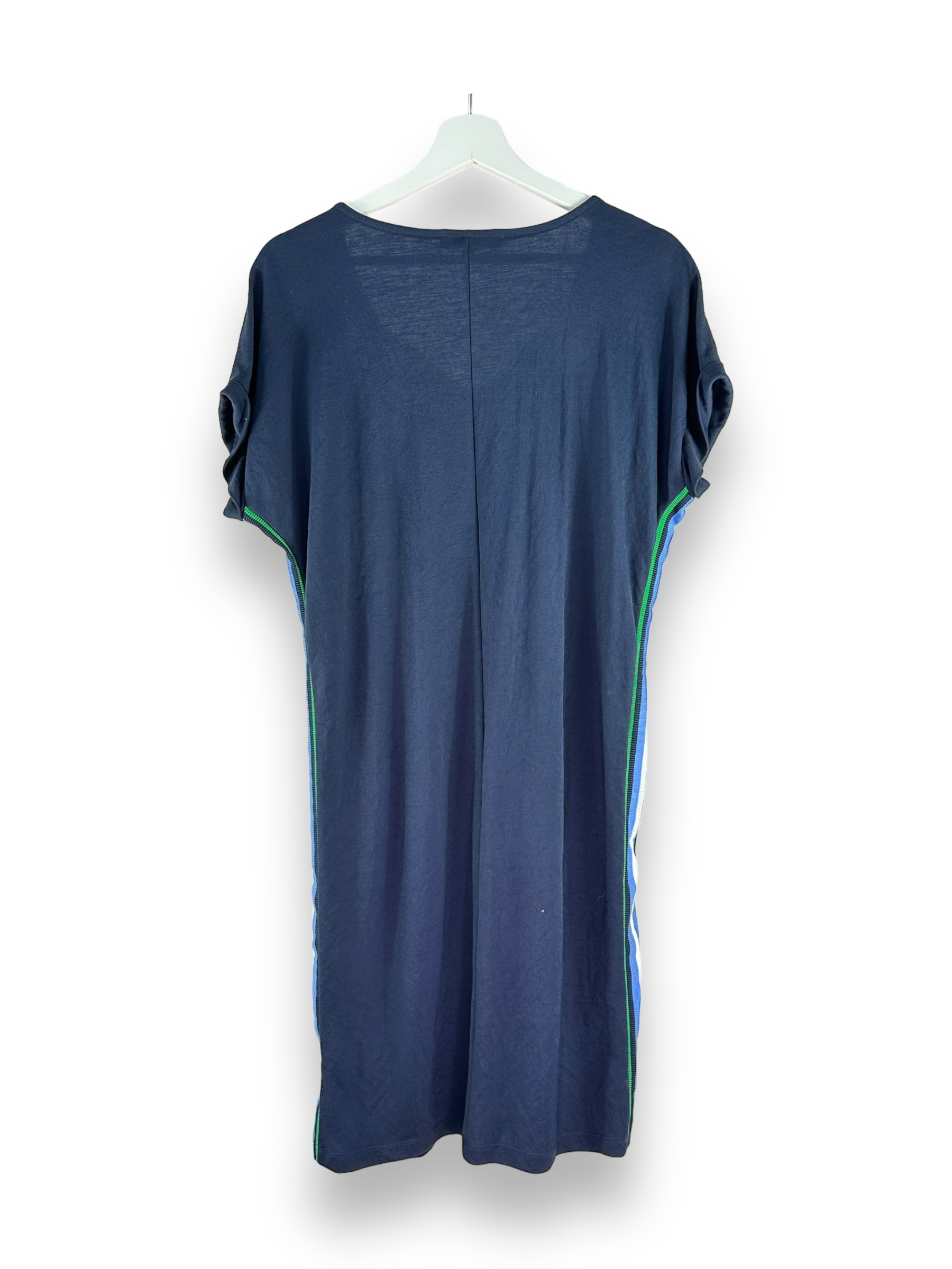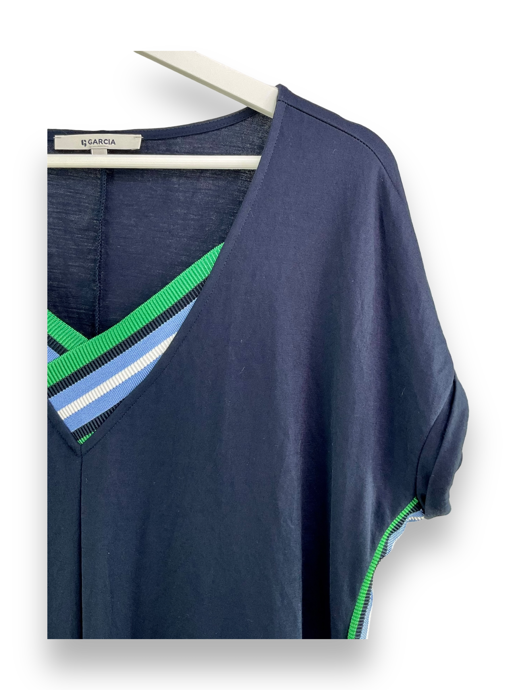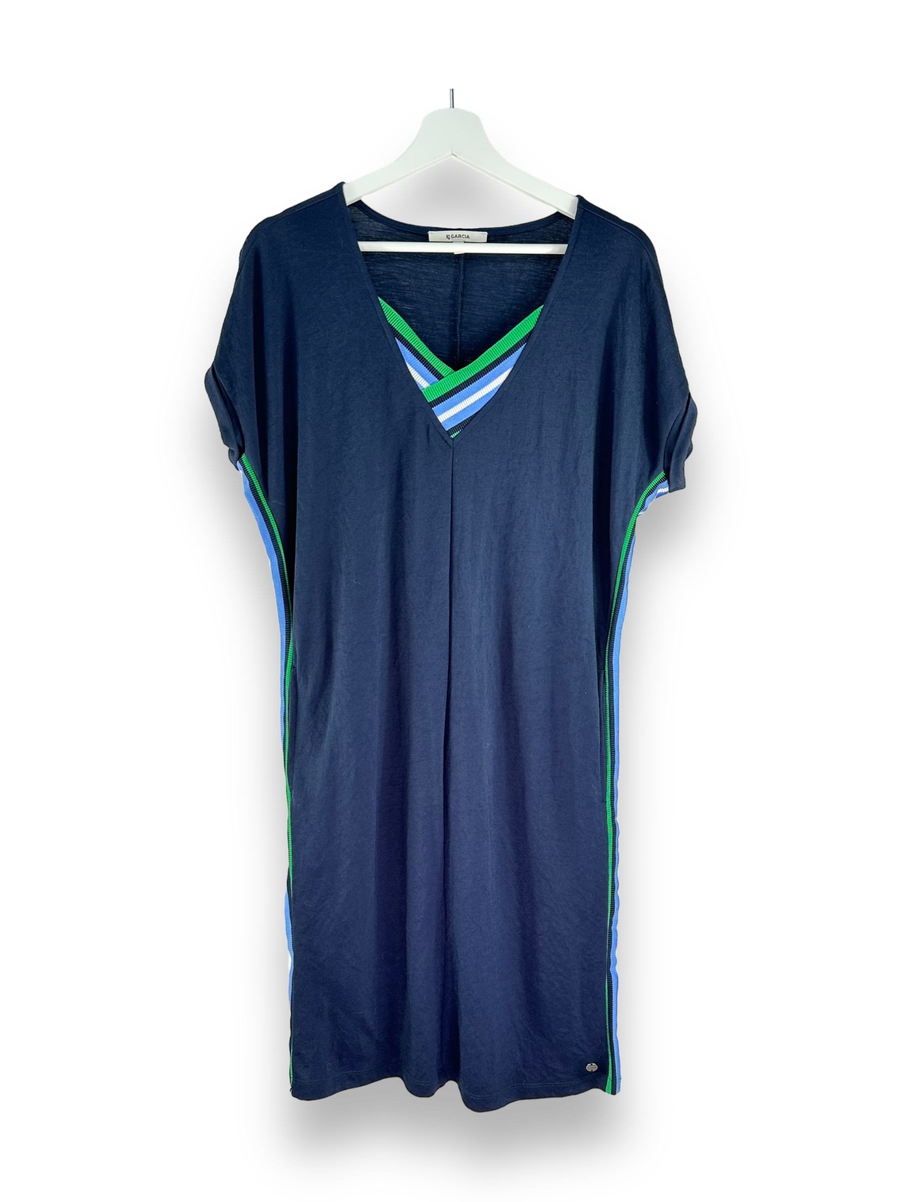 Das edle Kleid von GARCIA in Jersey ist uni dunkelblau mit blau, grün, weissen Gallonstreifen, so wie dem selben V-Ausschnitt. Es ist knielang mit einem geraden Schnitt und kurzen Ärmeln.