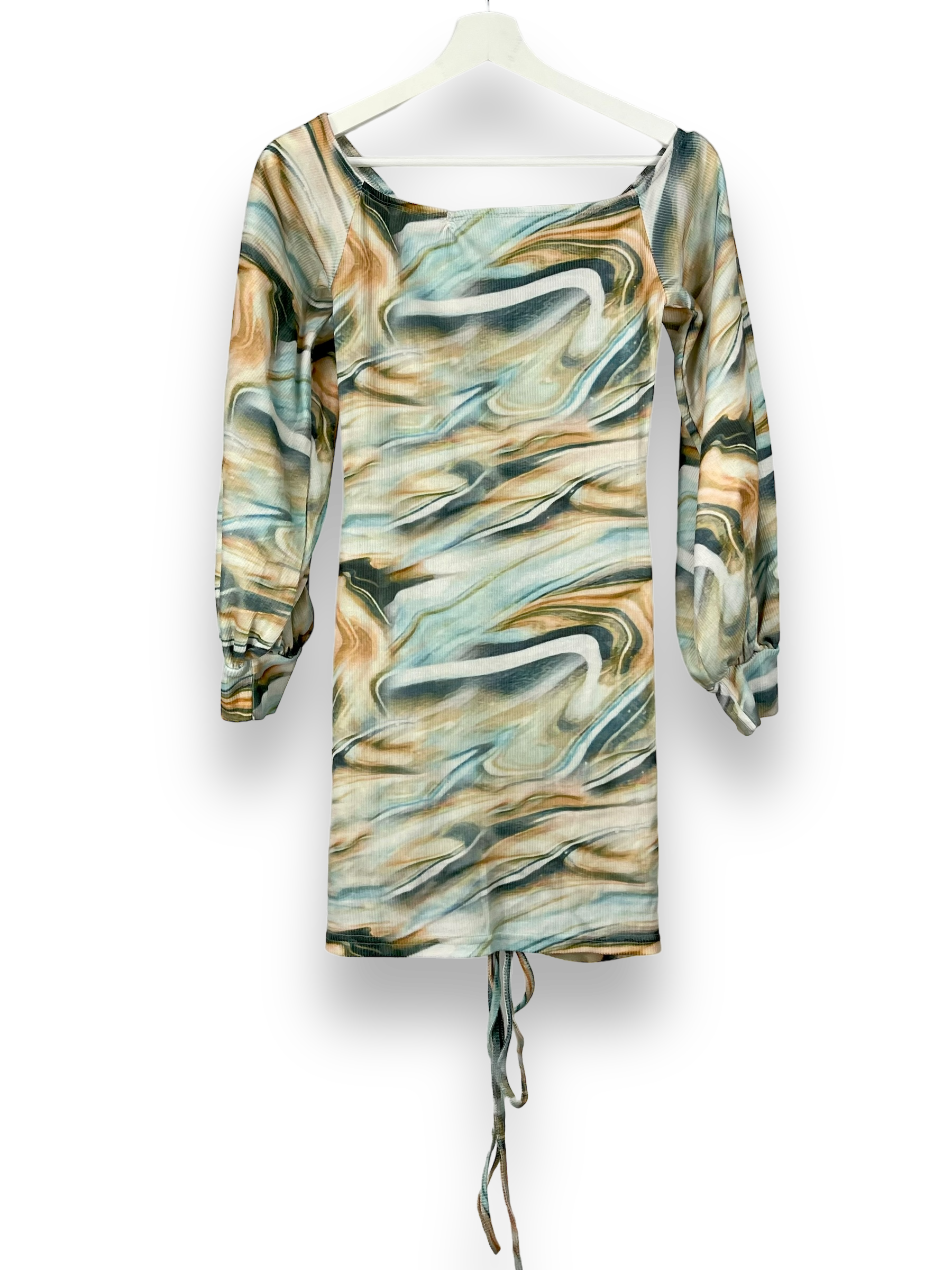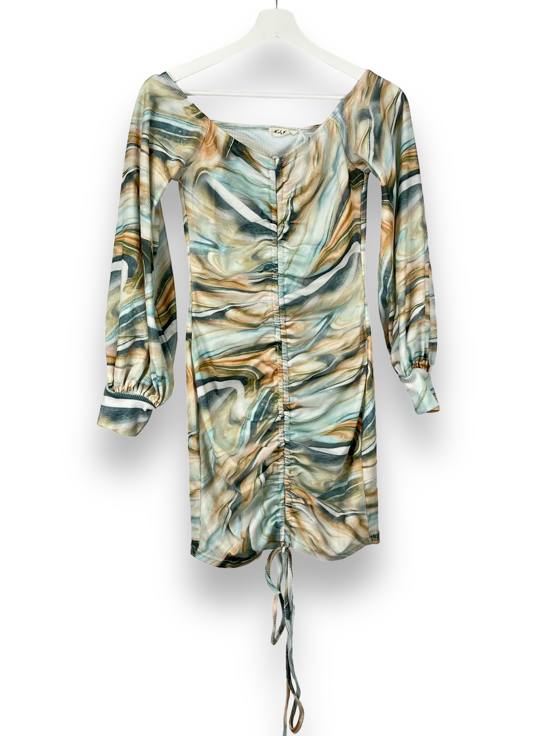 Hier haben wir ein tolles Jerseykleid in verschiedenen Farben wie blau und grün. Es ist langarm und oberschenkellang. Über das ganze Kleid hat es ein tolles Muster und vorne lässt es sich binden und leicht zusammen ziehen.