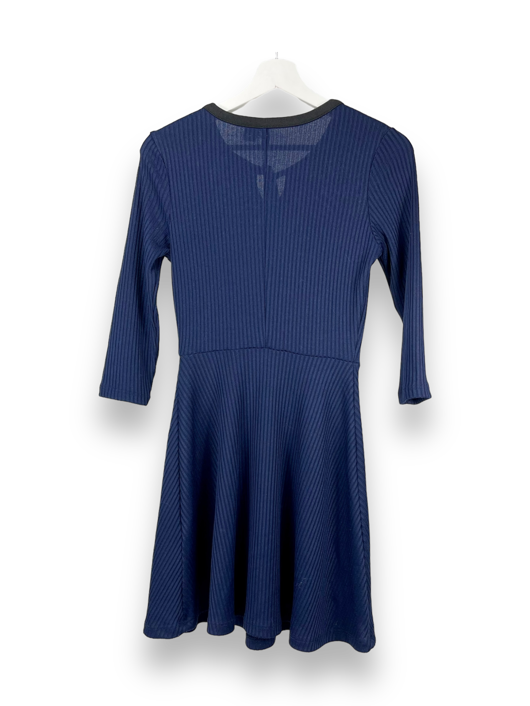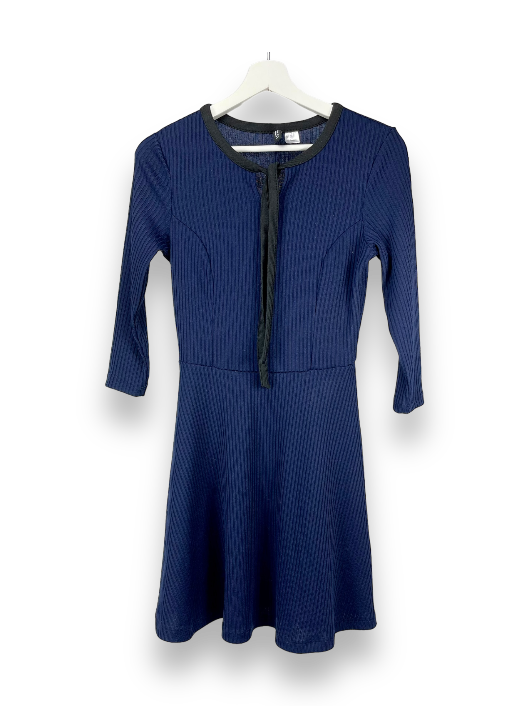 Das Jerseykleid von H&M ist super bequem und hat einen tollen Schnitt. Es ist oberschenkellang und kann vorne zu gebunden werden. Das Kleid ist dunkelblau uni, hat aber feine schwarze Details und Abschlüsse.