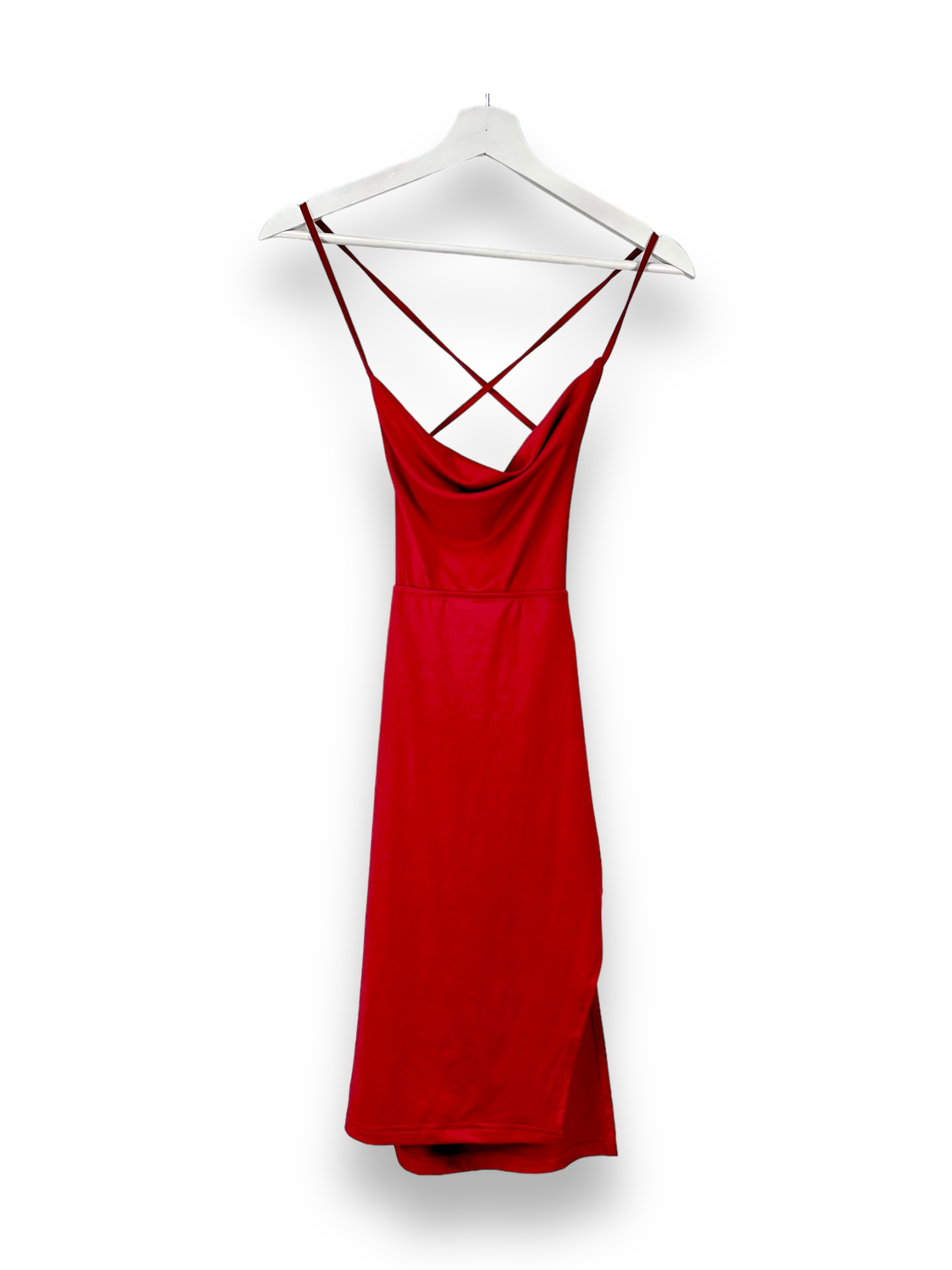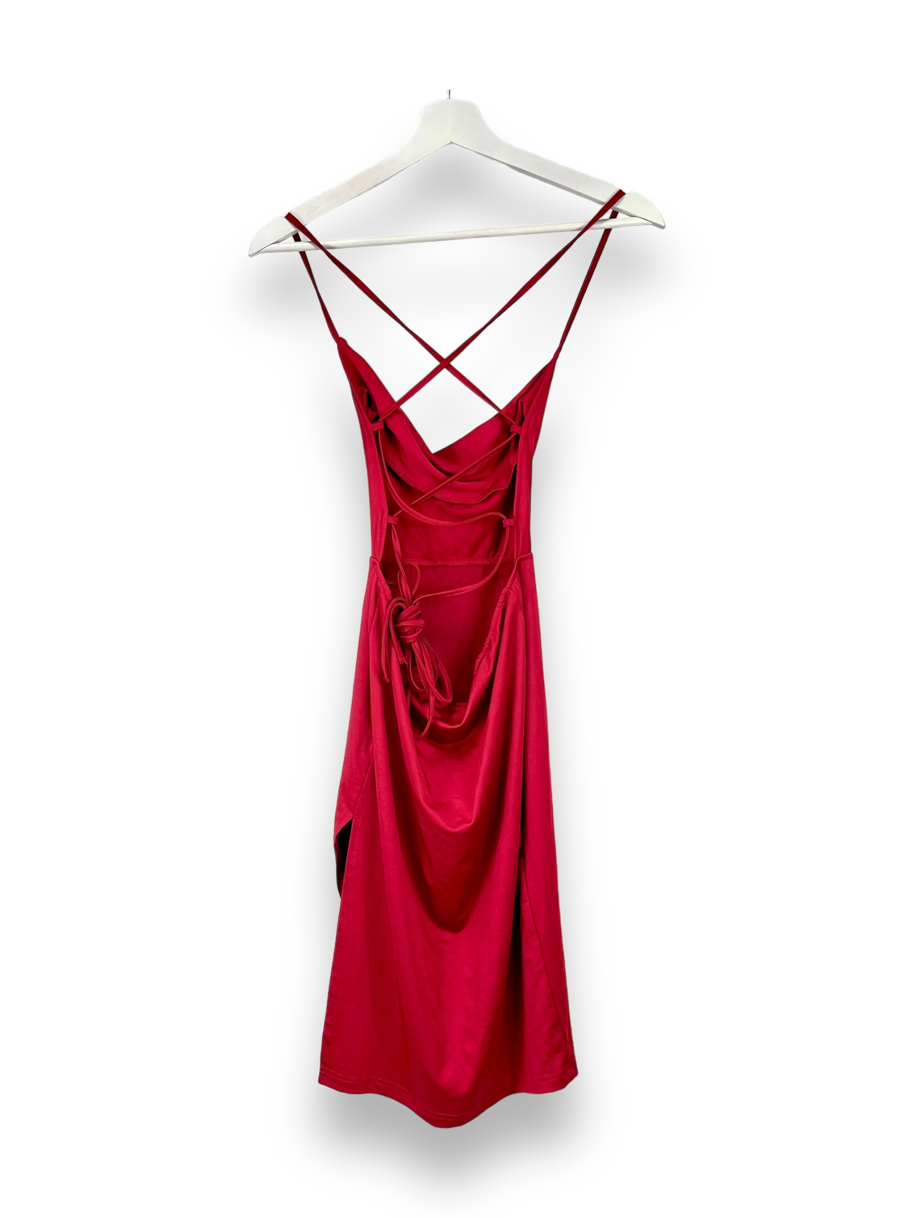 Das elegante Jerseykleid in rot kann toll in der Freizeit oder für einen etwas spezielleren Anlass getragen werden. Es ist oberschenkellang, ärmellos und lässt sich toll auf verschiedene Varianten binden.