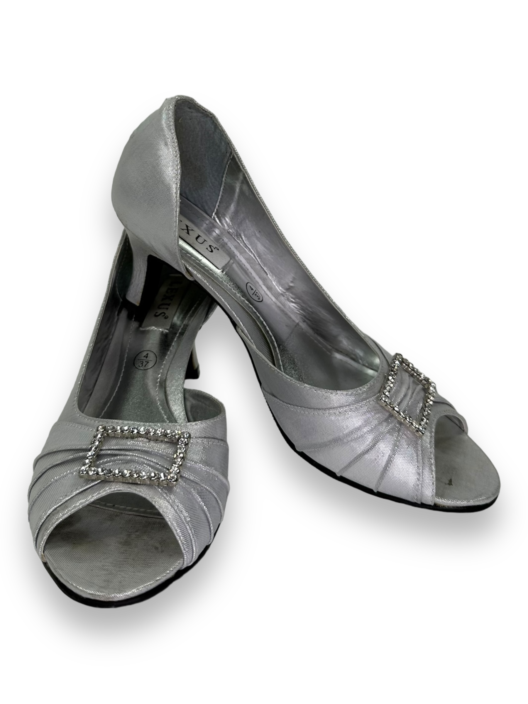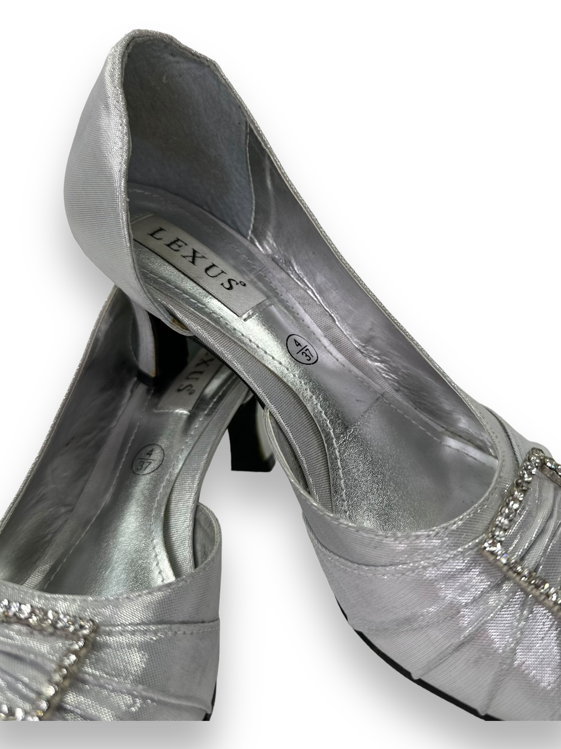 Die Peeptoes von LEXUS in einem altmodischen Touch sind schimmernd, glänzend und passend zur Clutch. Innen und vorne ist der Schuh offen und als tolles Detail hat es eine Brosche aus Strasssteinen.