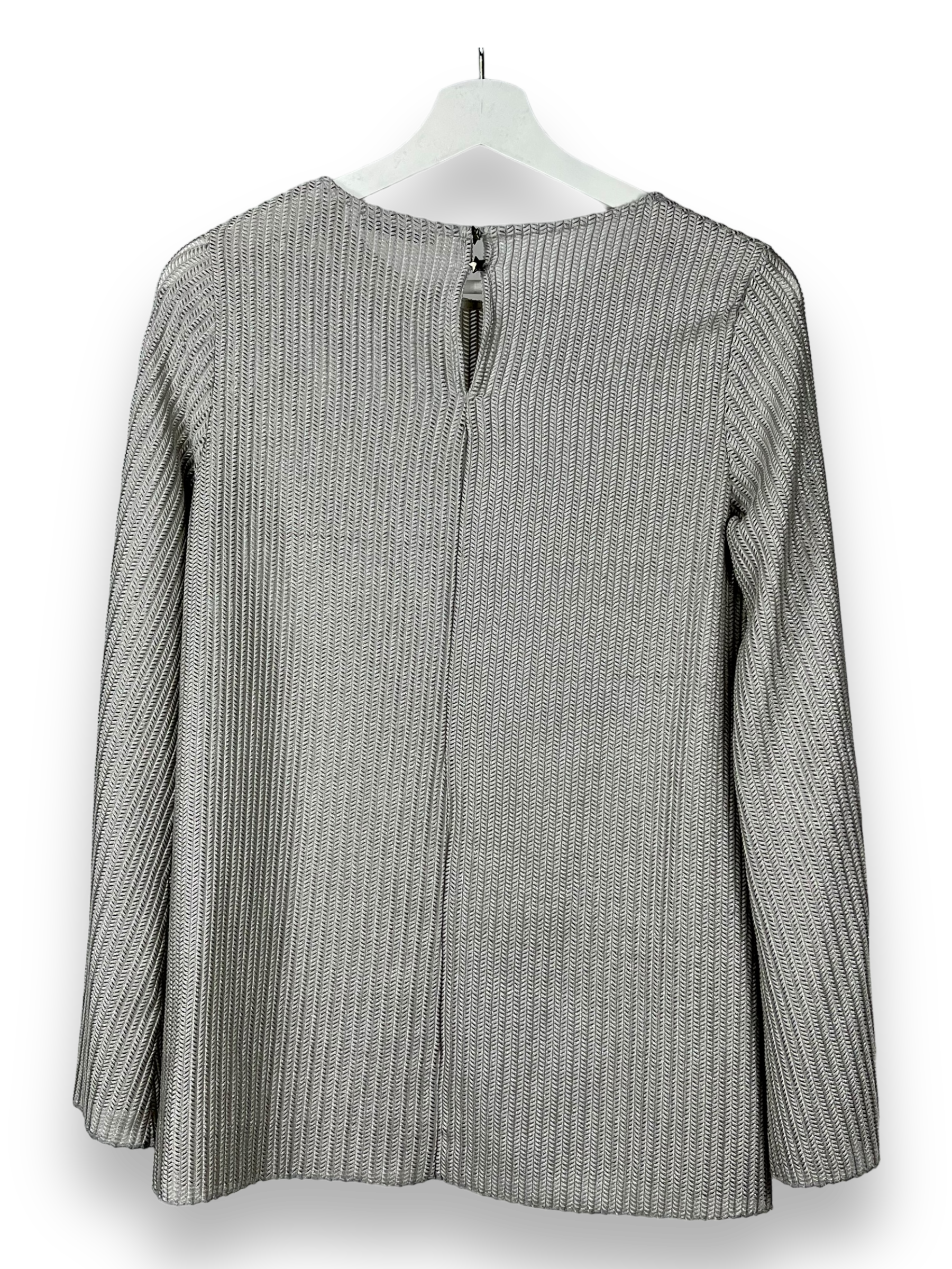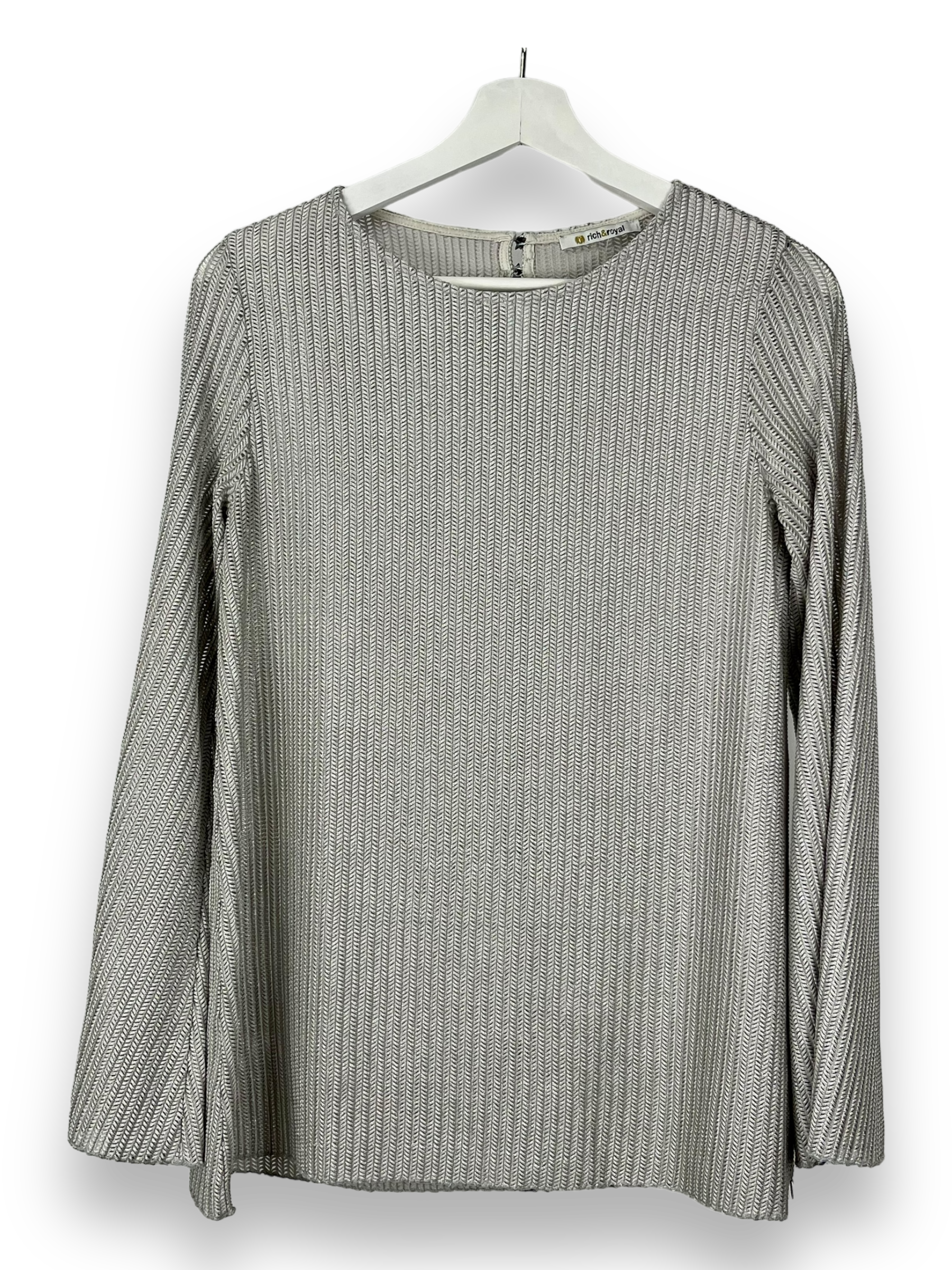 Fehlt dir noch ein silbernes Shirt im Kleiderschrank? Dann könnte dir dieses Langarmshirt von Rich&Royal gefallen. Es besteht aus einem etwas spezielleren Stoff mit feinen Löchlein. Die Ärmel haben eine Trompeten-Form und machen das ganze noch ein wenig aussergewöhnlicher.