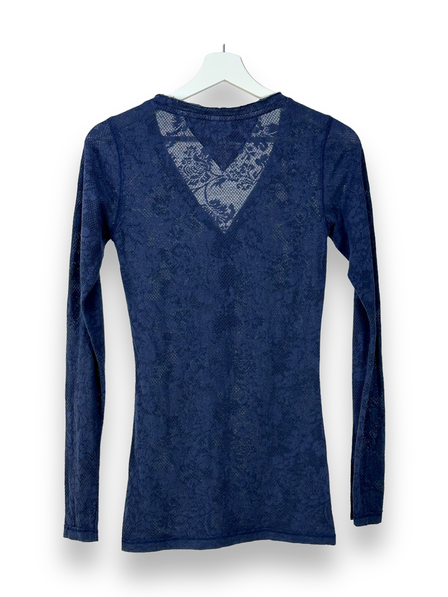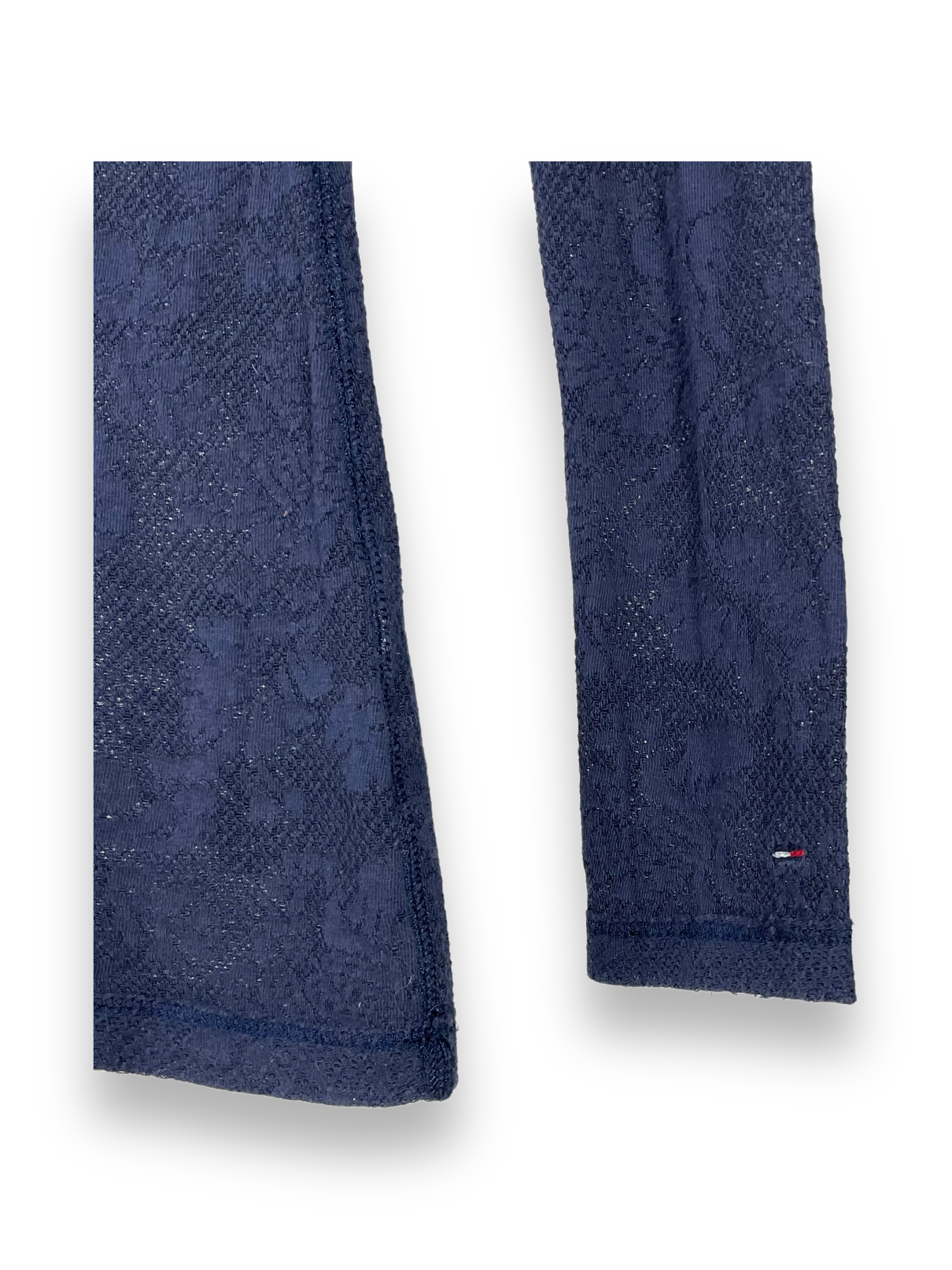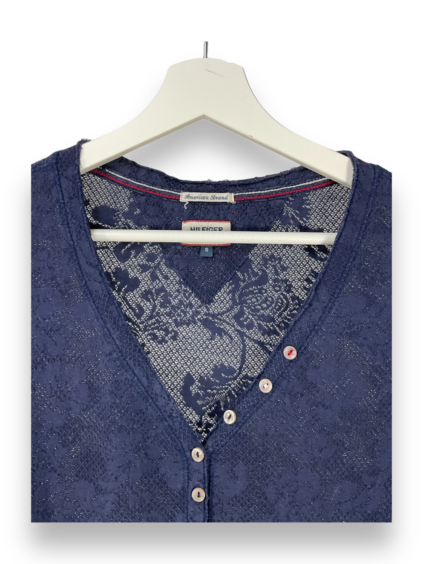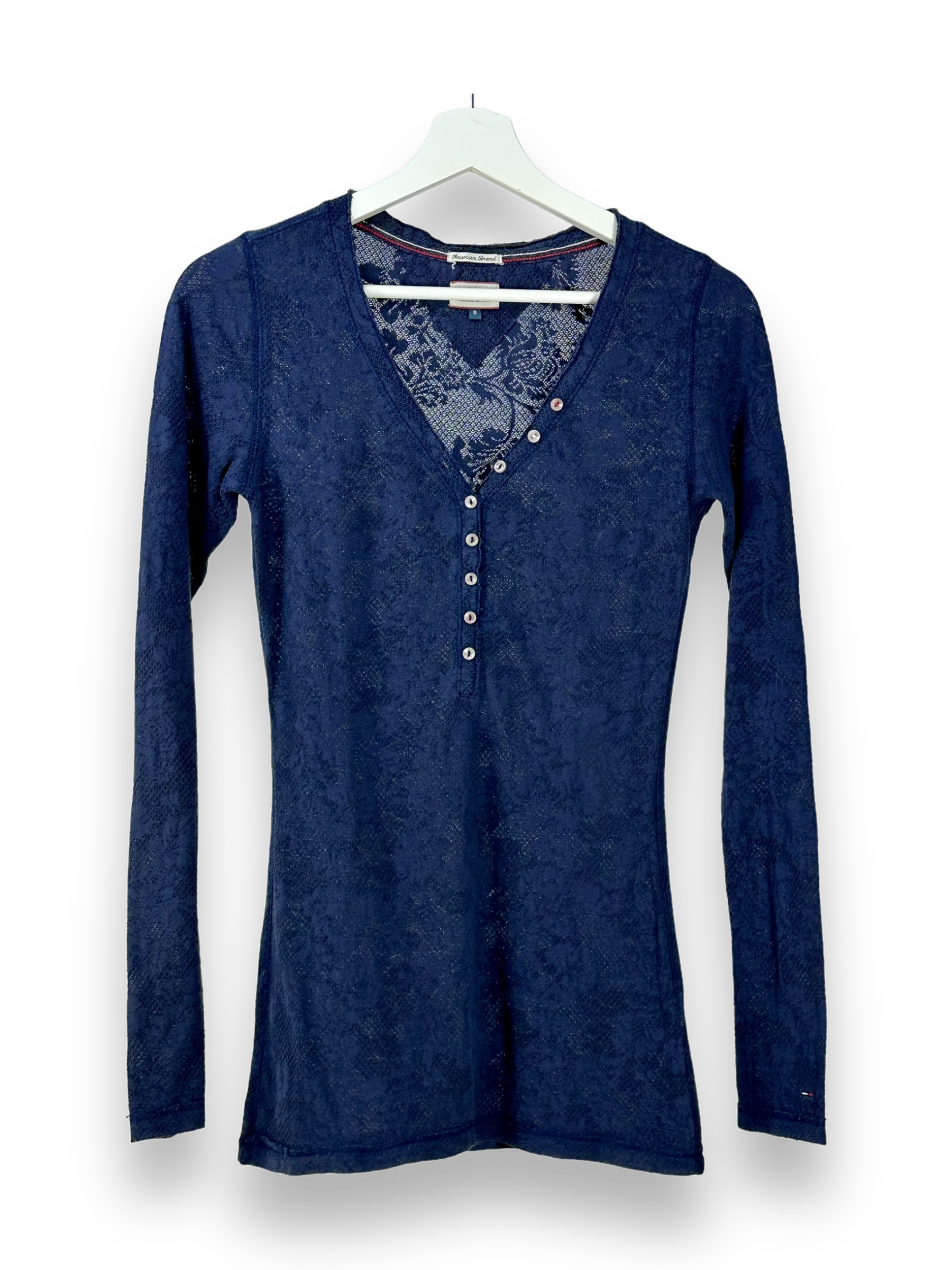 Stilvoll und raffiniert: Das dunkelblaue Langarmshirt von Tommy Hilfiger. Mit einem schmalen Schnitt betont es elegant Ihre Silhouette. Das unifarbene Design wird durch subtile Spitzenverzierungen aufgewertet, die dem Shirt eine delikate Transparenz verleihen. Der V-Ausschnitt mit Knöpfen verleiht dem Shirt eine moderne Note. Mit der Länge und Weite bietet das Shirt eine angenehme Passform. Ein vielseitiges Kleidungsstück, perfekt für unterschiedliche Anlässe.