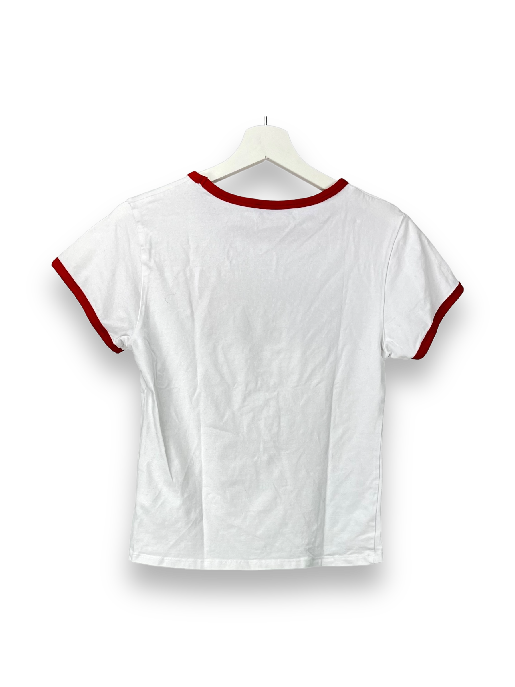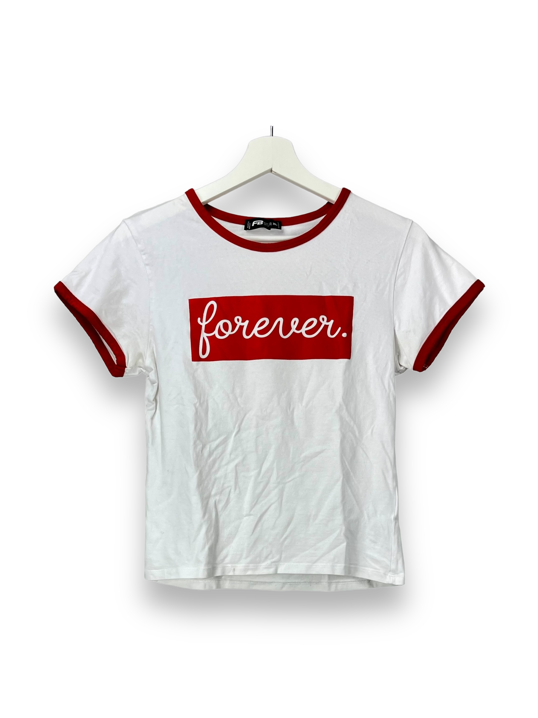 Hier haben wir ein schönes kurzarm T-Shirt mit roten Abschlüssen am Arm und Kragen so wie vorne einem Druck mit dem Wort "forever."