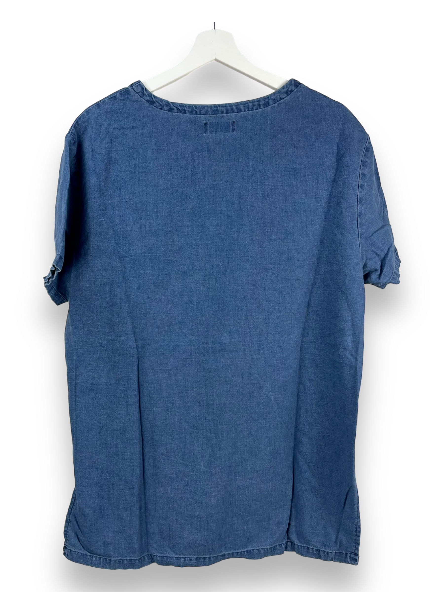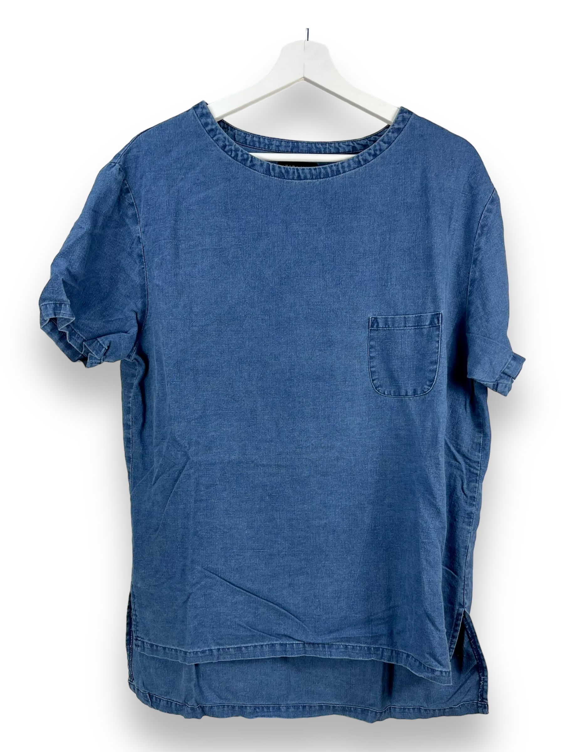 Wie sieht es aus, mal etwas neues auszuprobieren? Hier hätten wir ein lässiges Jeansshirt in blau, was toll zu kombinieren ist. Es hat einen lockeren, geraden Schnitt und vorne auf der Brust eine Brusttasche.