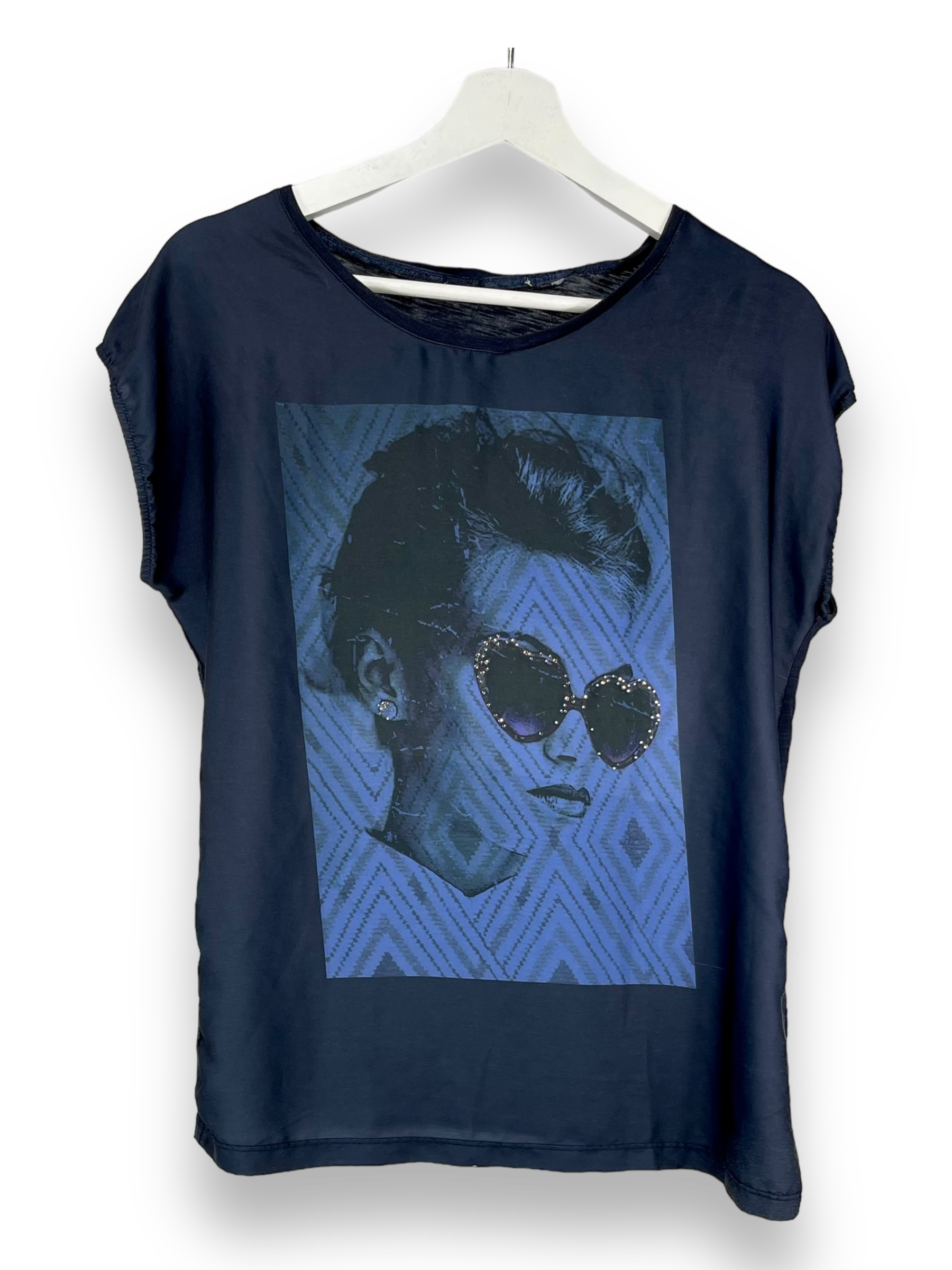 Das Rich&Royal T-Shirt ist kurzarm und hat vorne ein Bild welches mit Strasssteinen verziert ist.