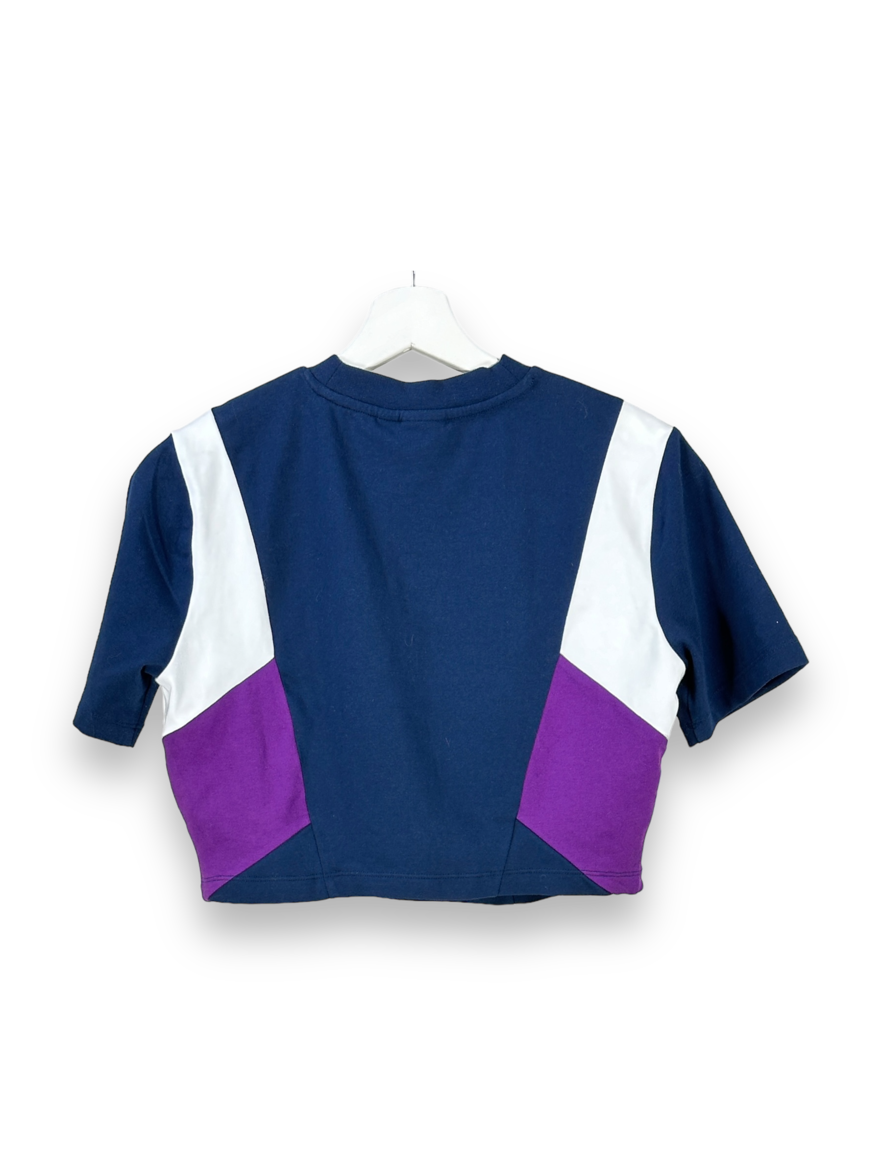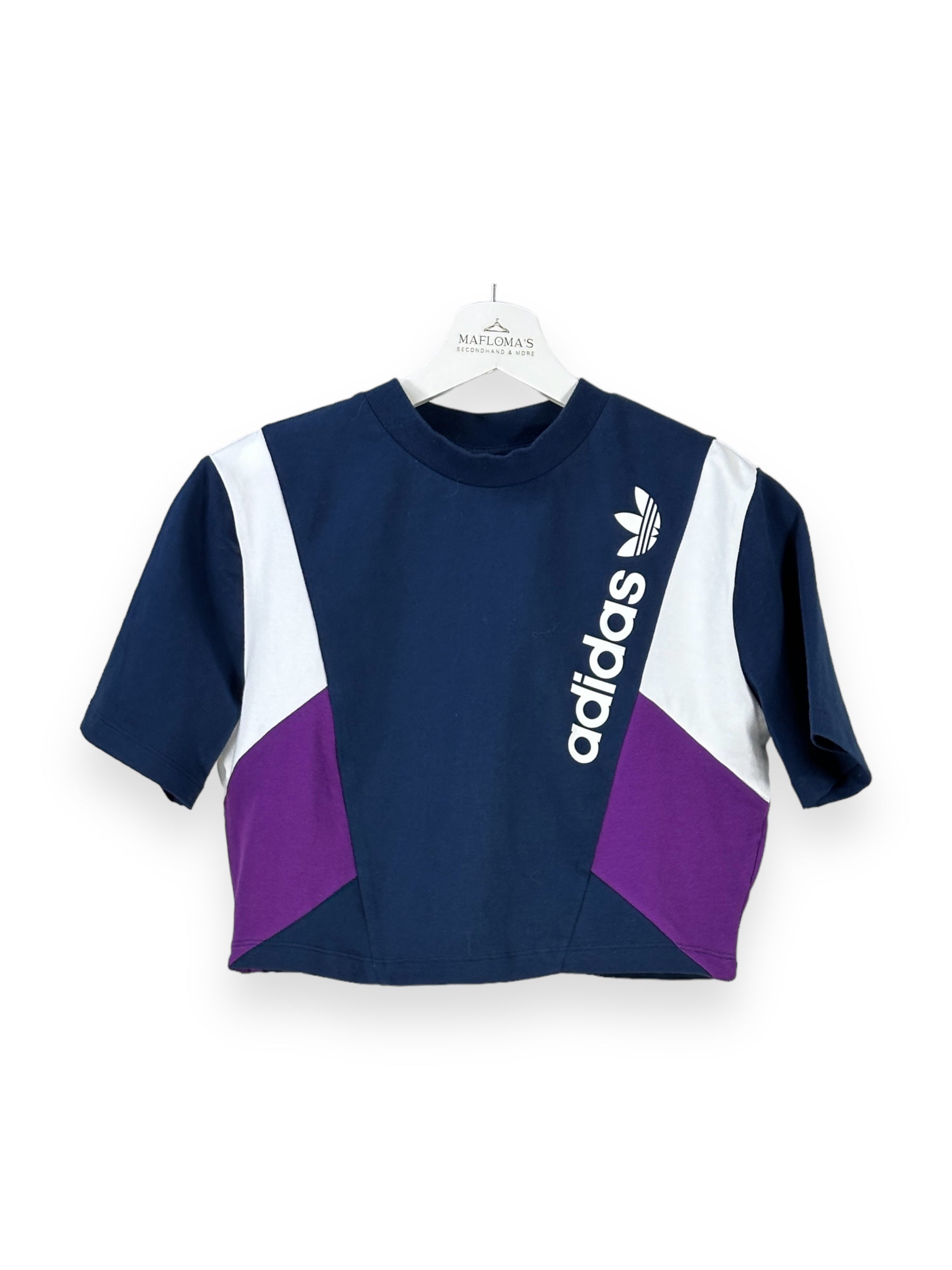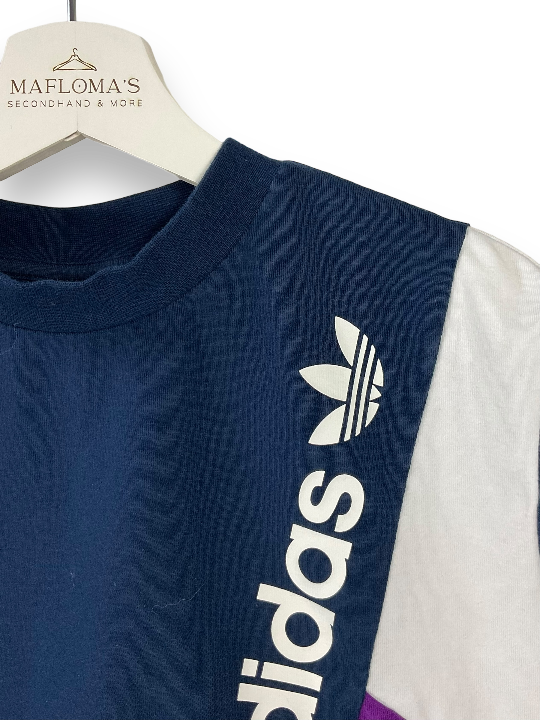 Entdecke dieses lässige T-Shirt von Adidas in einem trendigen Dunkelblau mit violetten und weissen Akzenten. Das Shirt ist kürzer geschnitten und hat einen lockeren, bequemen Sitz, der perfekt für einen entspannten Tag oder ein sportliches Outfit ist.