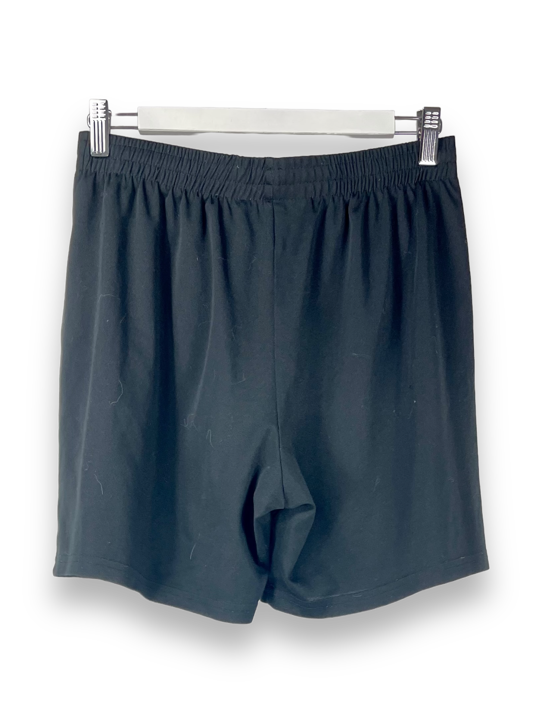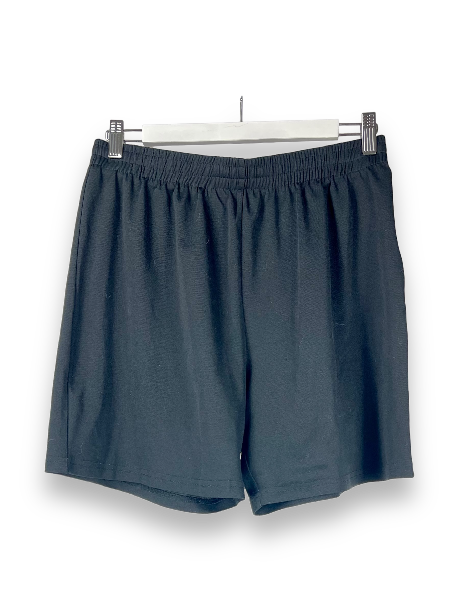Hier haben wir eine einfache, uni Sporthose in schwarz. Die Hose hat am Bund einen Gummizug und innen noch einen Bändel, um die Hose zu zu schnüren.