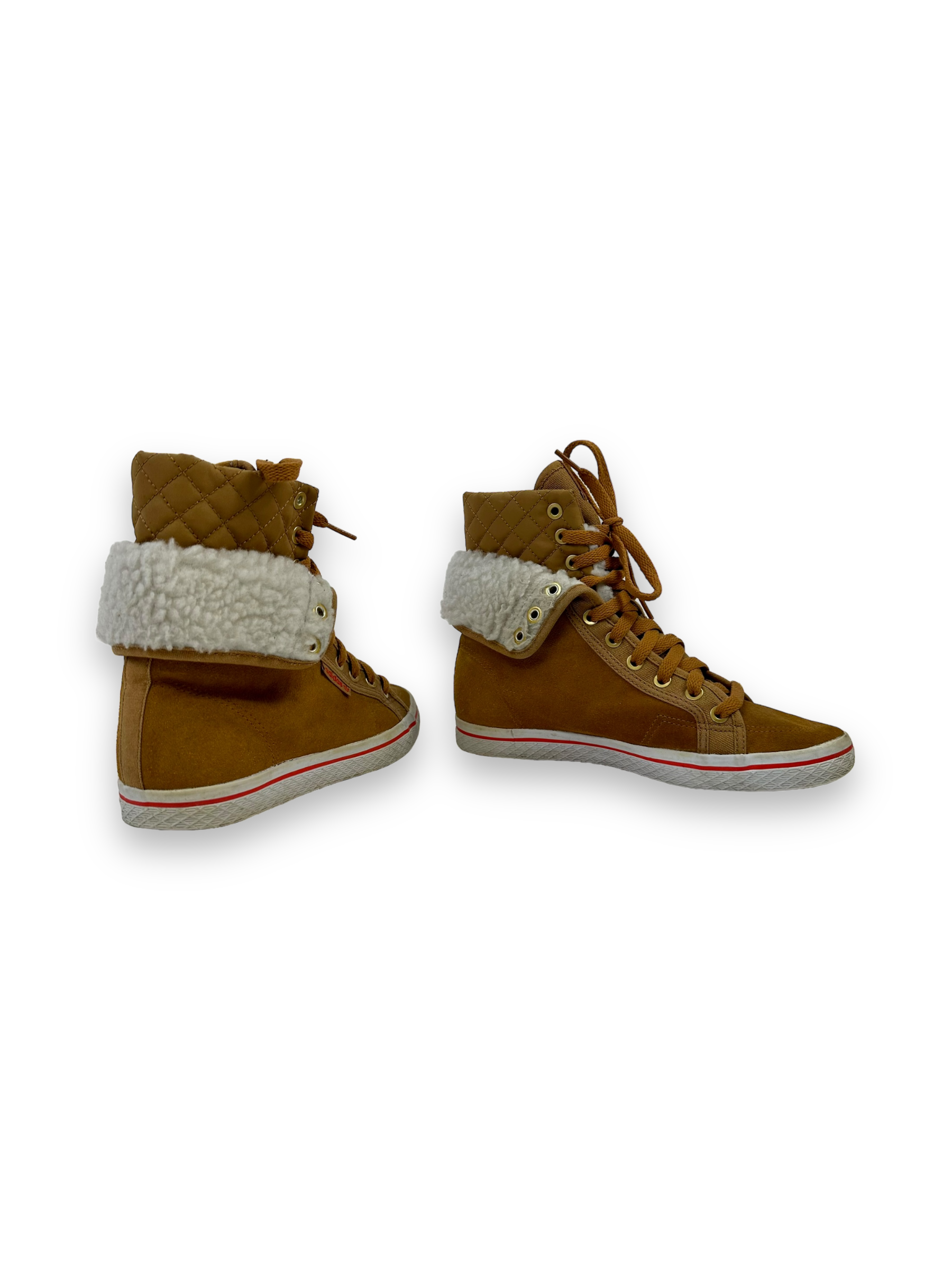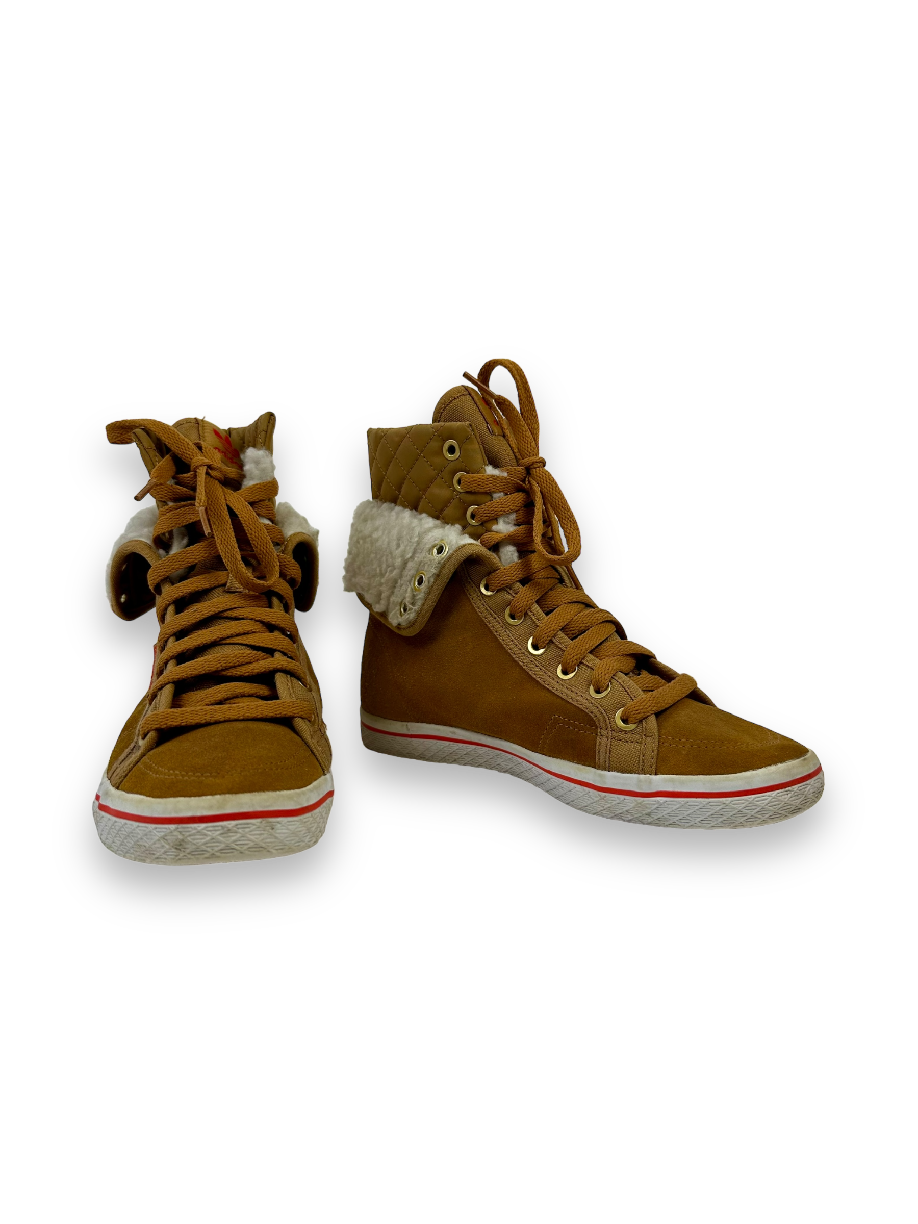 Diese Winterboots in Sneaker High-Stil sind die perfekte Wahl, um sowohl Stil als auch Wärme während der kälteren Monate zu garantieren. Die Farbkombination aus Braun, Ockerbraun und Weiss verleiht den Boots eine natürliche und trendige Ausstrahlung. Die Boots reichen bis zum Knöchel und sind aus Kunstleder in Velours-Optik gefertigt, was ihnen eine moderne Note verleiht. Das Innenfutter sorgt für wohlige Wärme, während die umklappbare Option zusätzlichen Stil und Anpassungsmöglichkeiten bietet. Die Qualität der Winterboots wird als sehr gut bewertet, was auf ihre sorgfältige Verarbeitung, das gefütterte Inneren und die vielseitige Verwendbarkeit hinweist. Egal ob für den täglichen Gebrauch oder winterliche Spaziergänge, diese Winterboots sind eine stilvolle und funktionale Ergänzung zu deiner Garderobe.
