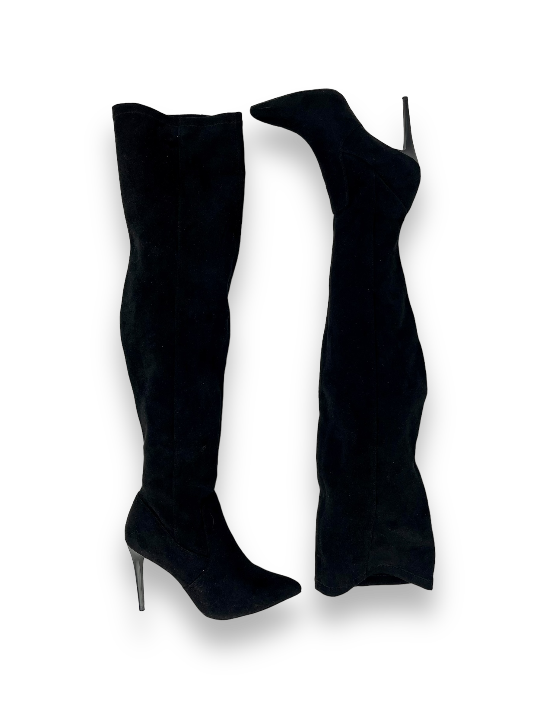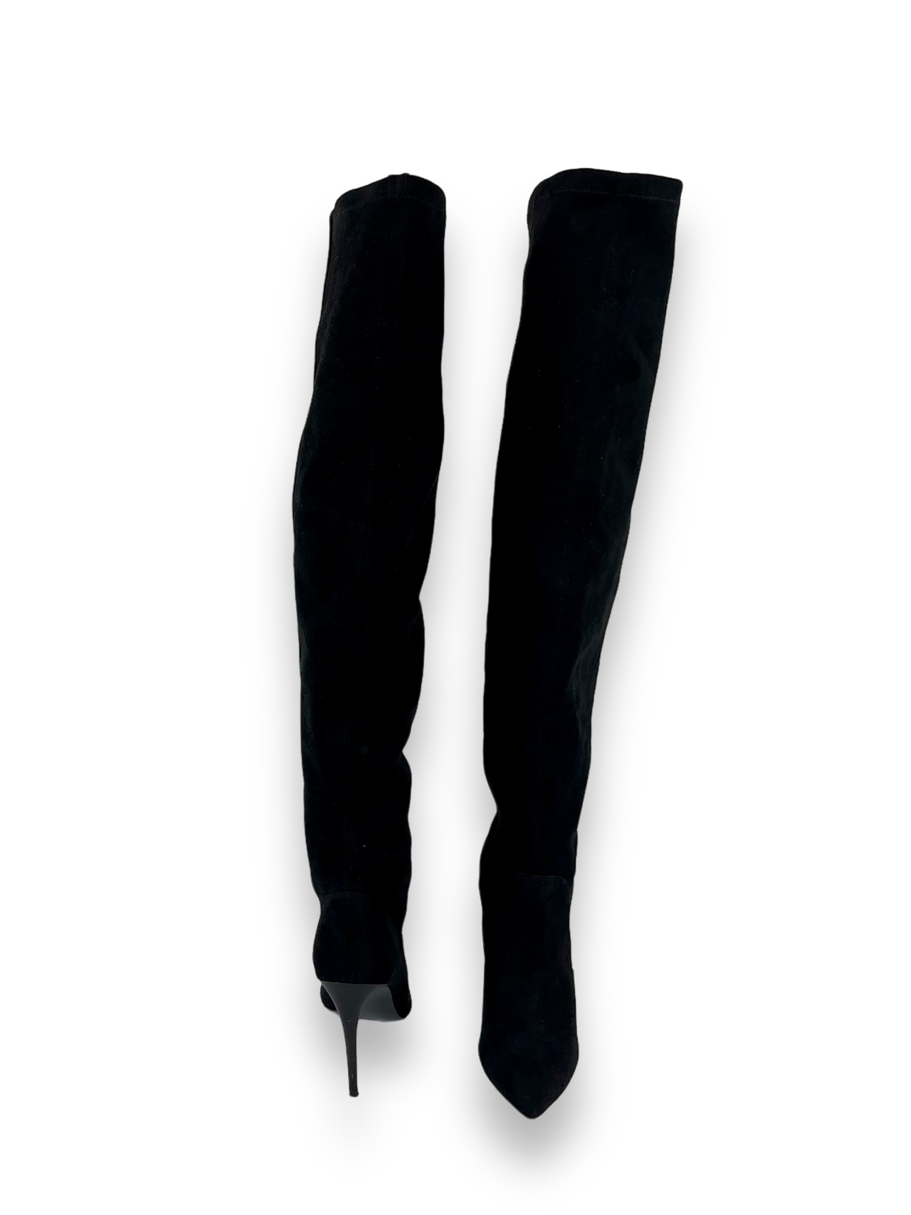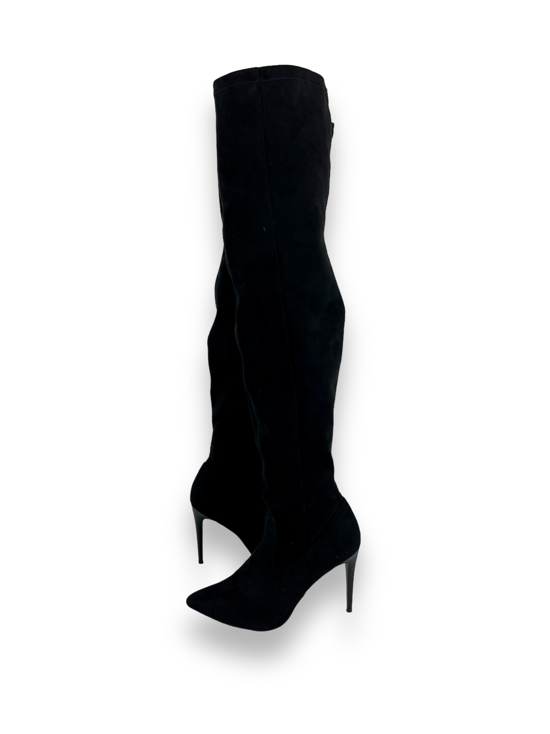 Die Overknees von New Look kommen in schwarz mit einer schönen Velours-Optik. Sie bringen einen edlen Bleistiftabsatz mit einer Höhe von ca. 10cm.