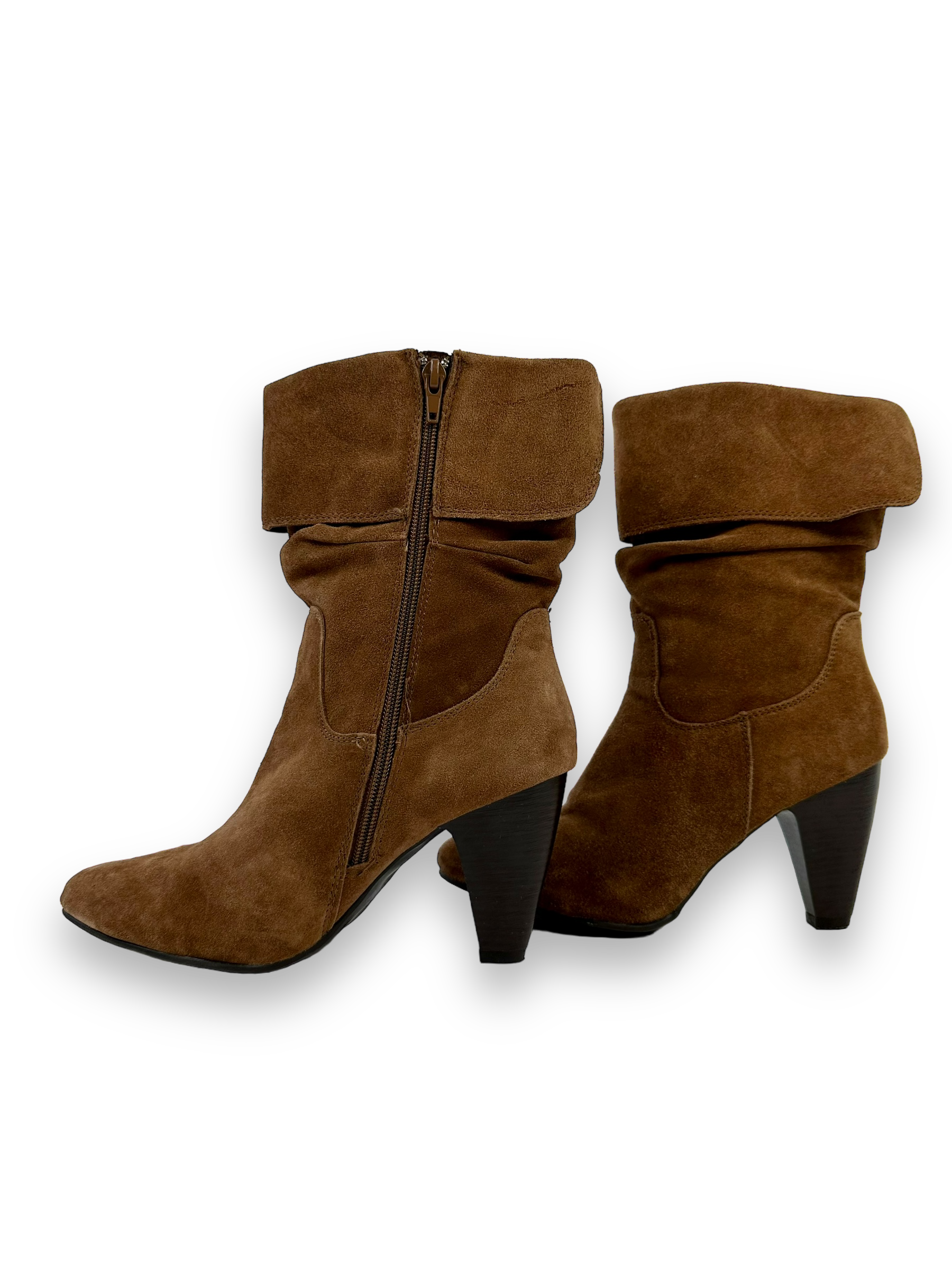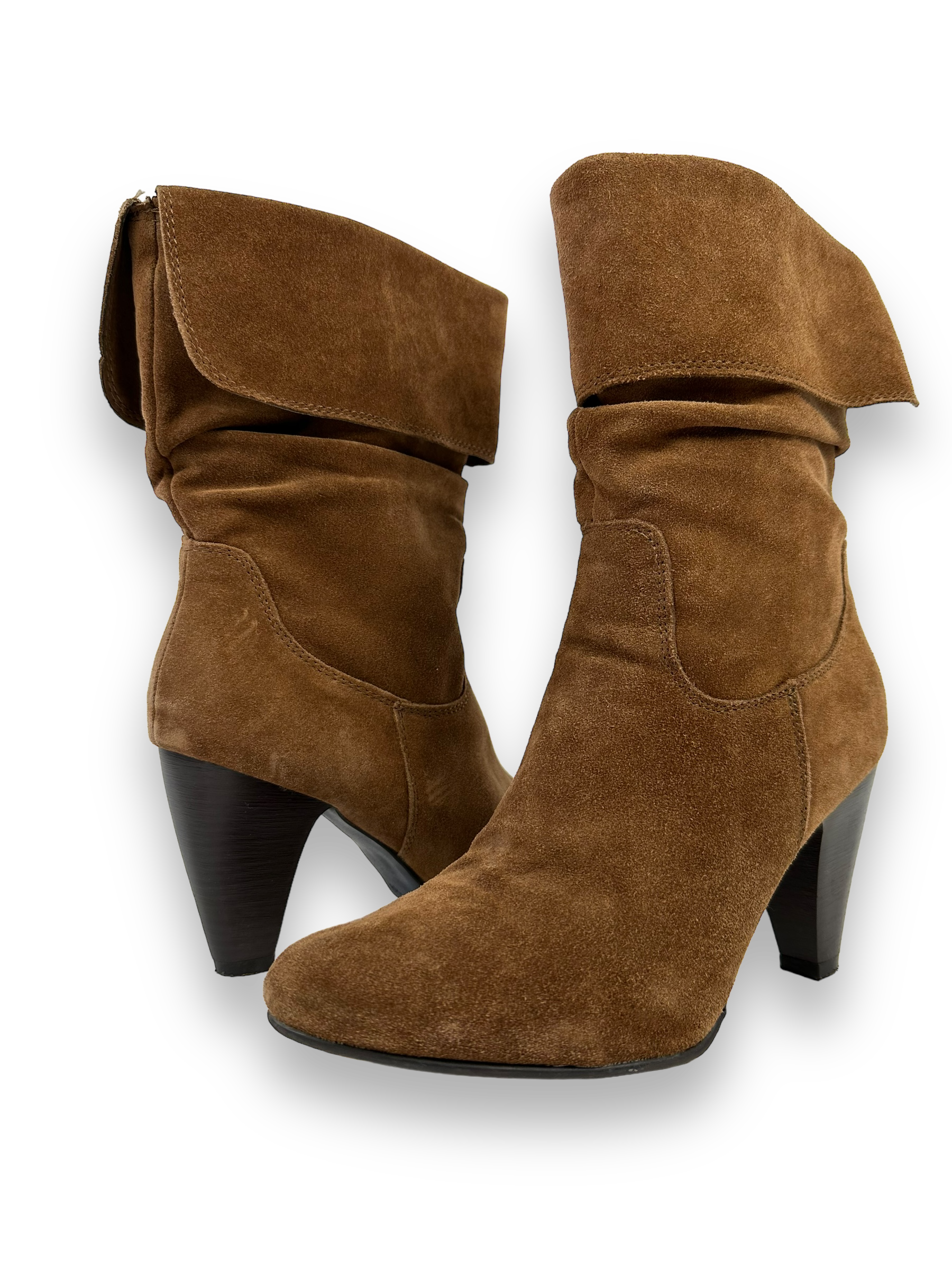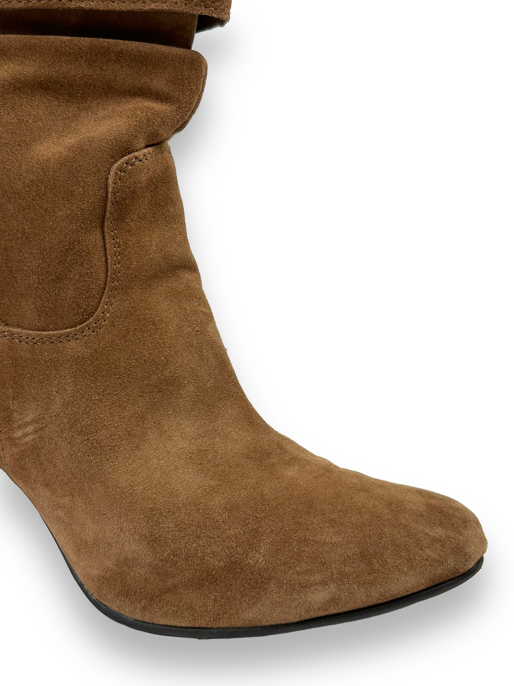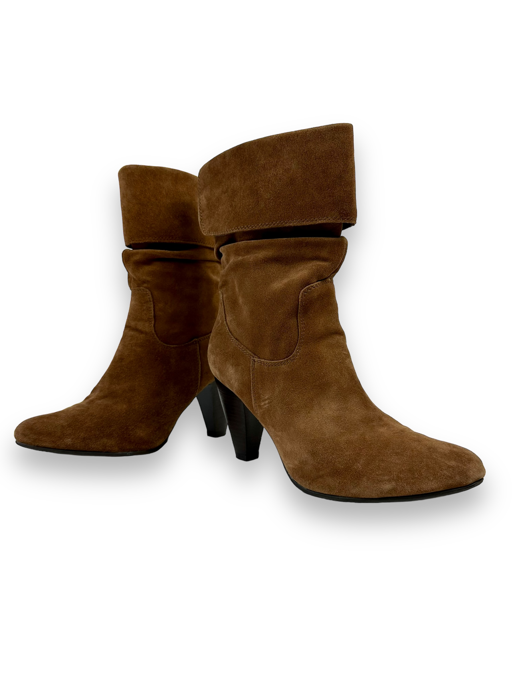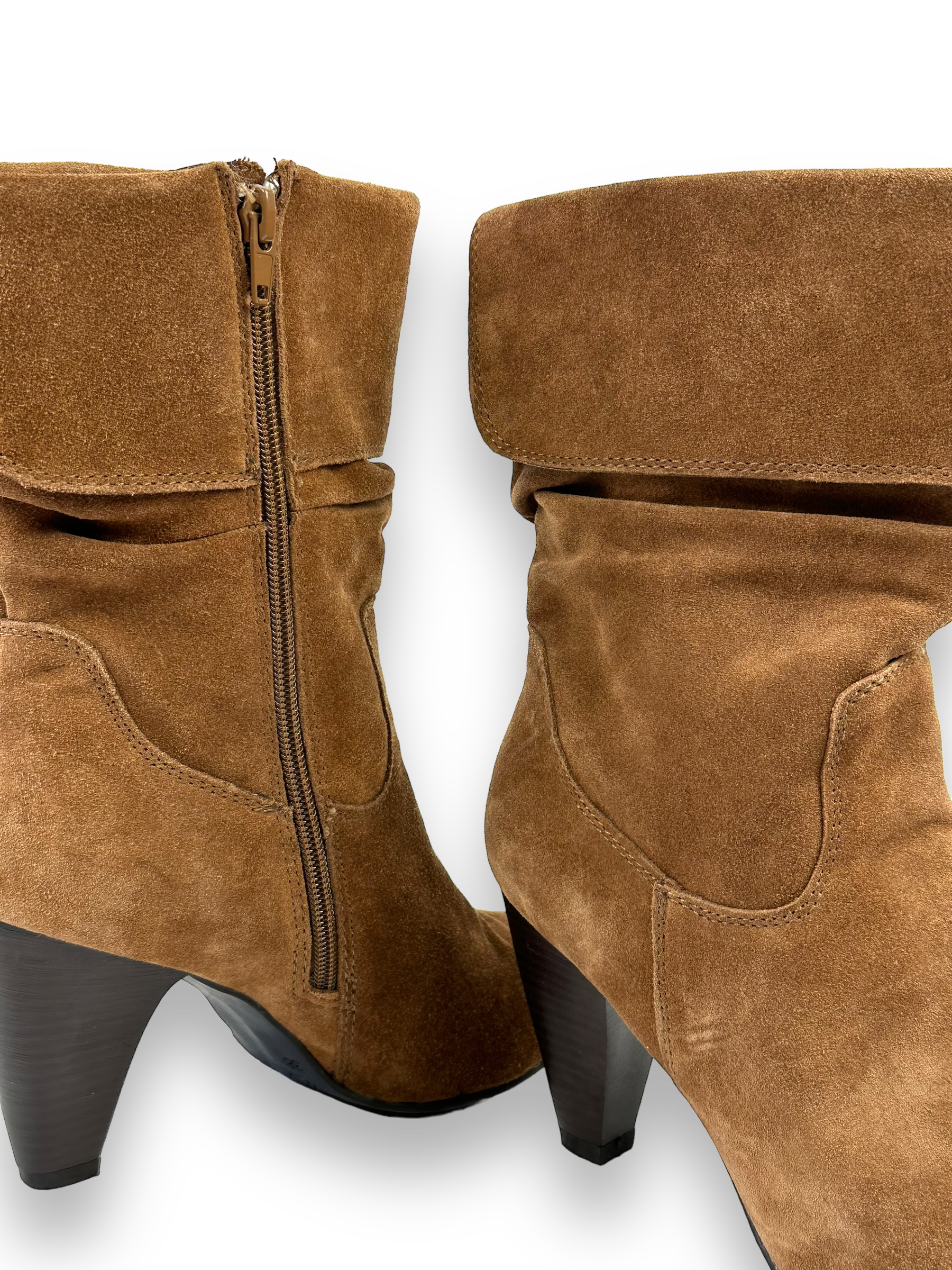 Diese High Heel Stiefelette kombiniert stilvolles Design mit einem Hauch von Eleganz. Das Lehmbraun verleiht dem Schuh eine natürliche und vielseitige Note. Hergestellt aus Kunstleder, bietet diese Stiefelette nicht nur Stil, sondern auch Langlebigkeit und Komfort. Mit einem bequemen Blockabsatz ist dieser Schuh sowohl für längere Tragezeiten als auch für schickere Anlässe geeignet. Die Stiefelette reicht bis zur Wade und ist aus Kunstleder in Velours-Optik gefertigt, was ihr eine moderne Ästhetik verleiht. Ein Reißverschluss an der Innenseite erleichtert das An- und Ausziehen. Die Qualität des Schuhs wird als gut bewertet, was auf seine Verarbeitung, Passform und vielseitige Verwendbarkeit hinweist. Diese High Heel Stiefelette ist eine elegante Wahl für Frauen, die Stil und Bequemlichkeit schätzen.