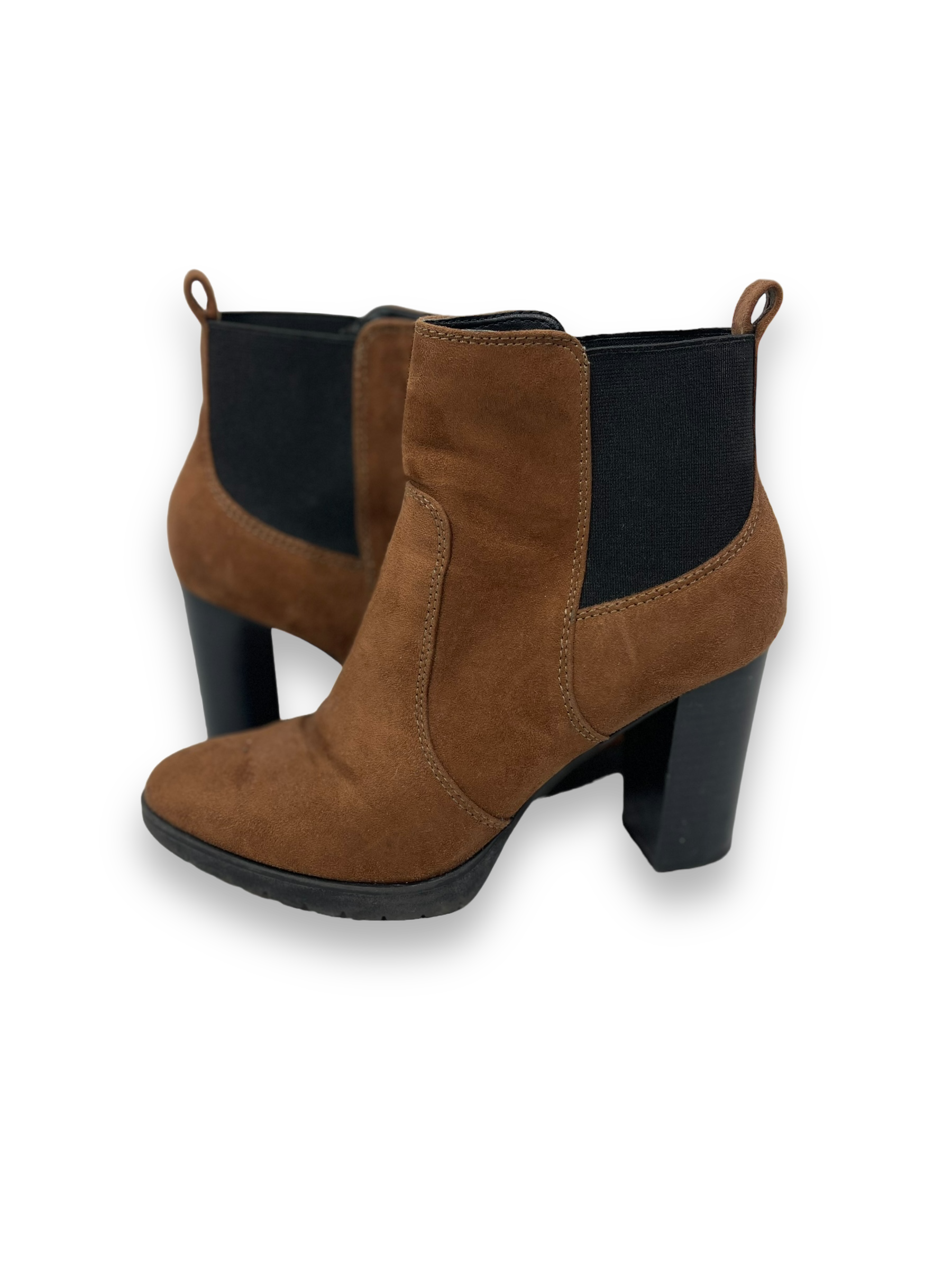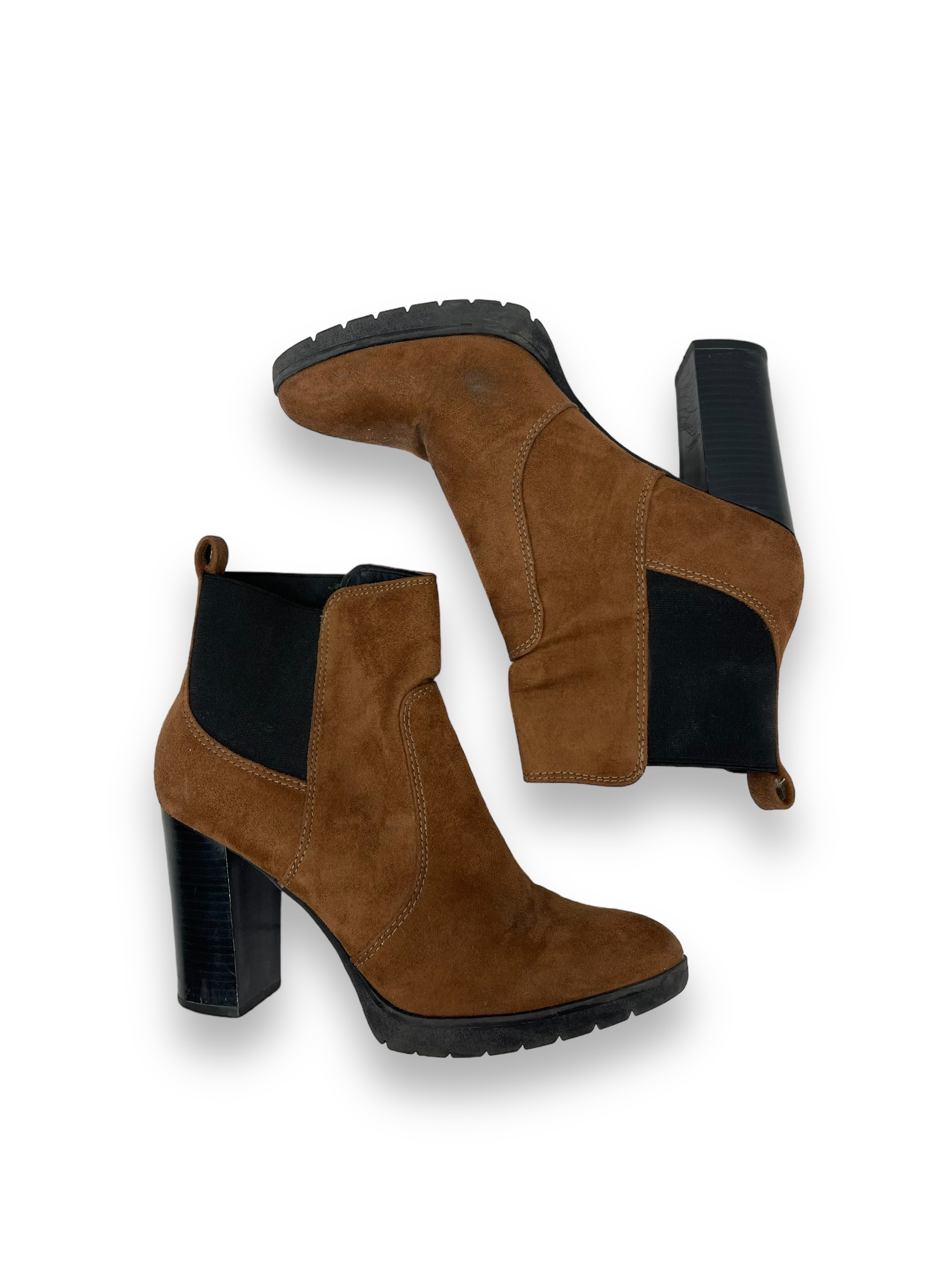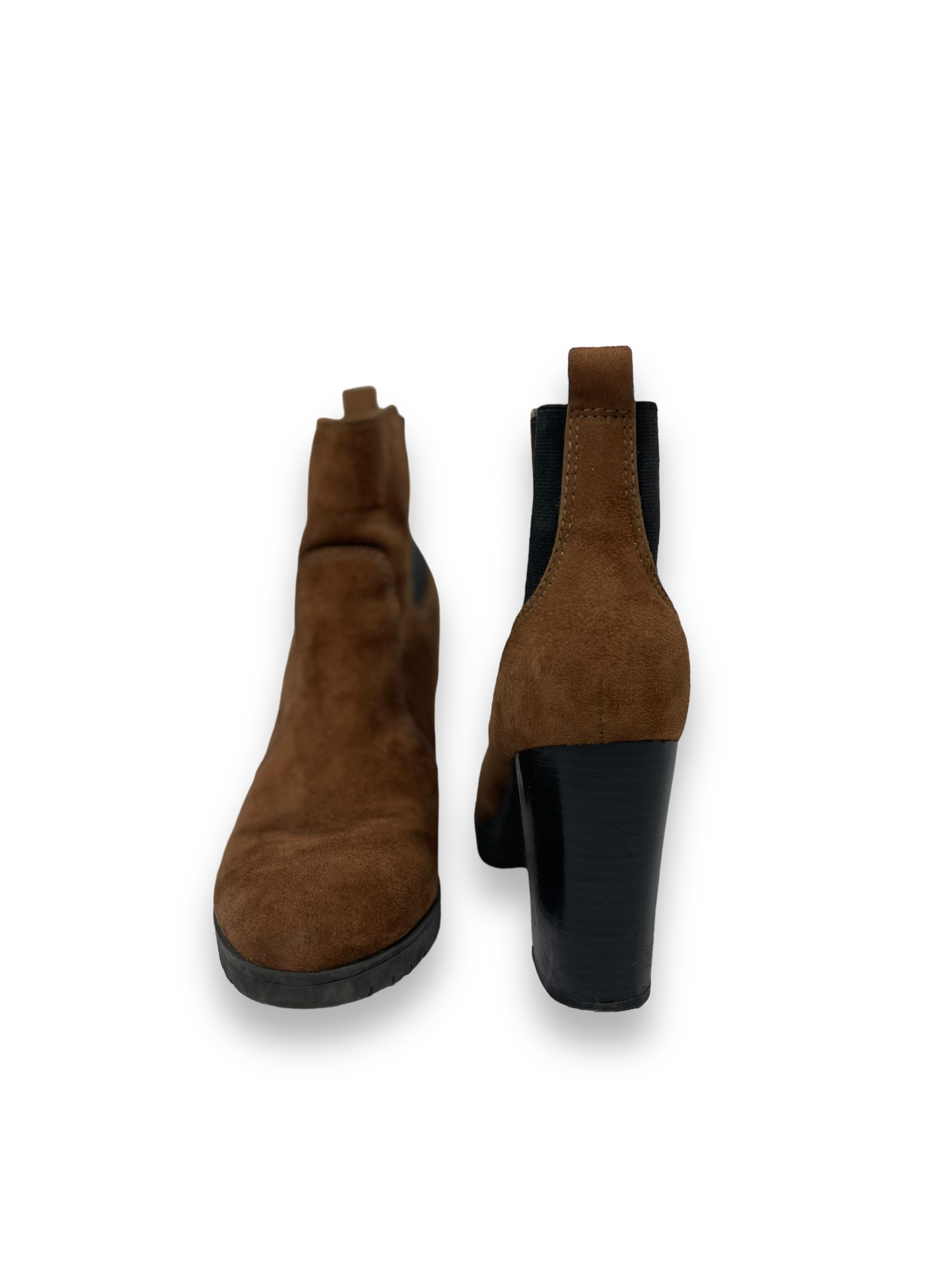 Als Ankle Boots werden Stiefeletten bezeichnet, die lediglich bis zum Fussknöchel (Ankle) reichen und diesen umschliessen. Hier haben wir einen Stiefeletten mit einem Absatz und vorne mit einem feinen Plateau. Rechts und links am Knöchel hat es einen Gummizug, damit man besser in den Schuh kommt. Der komplette Schuh ist aus einem Velours-Leder und befindet sich in einem guten Zustand.