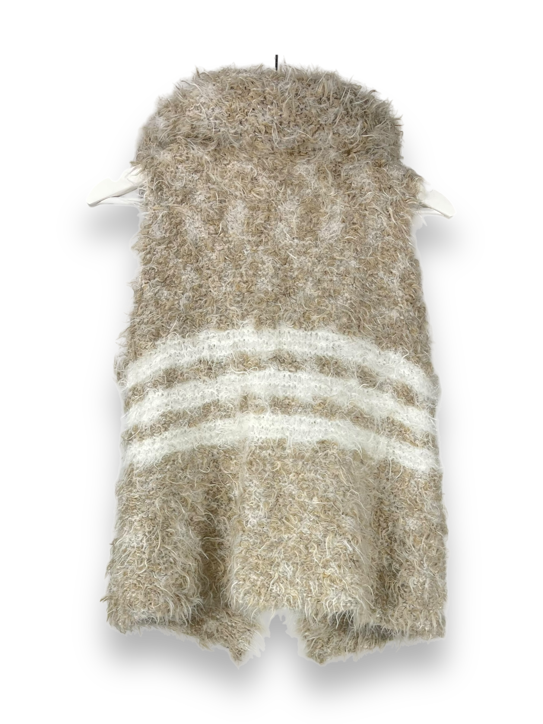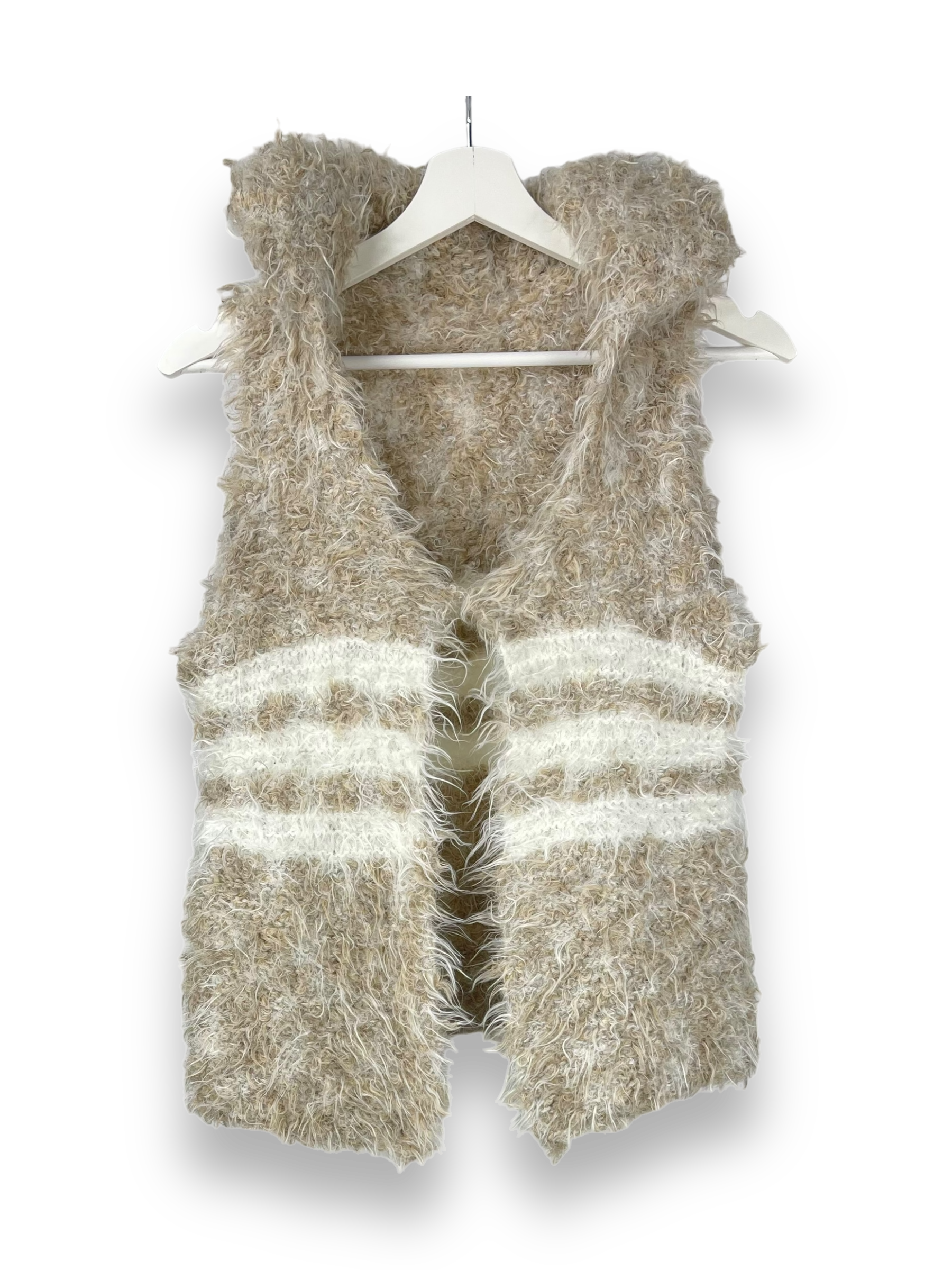 Hier haben wir ein selbstgemachtes Strickgilet in beige und weiss. Vorne als Verschluss hat es ein feines Häkchen und hinten einen Kragen.