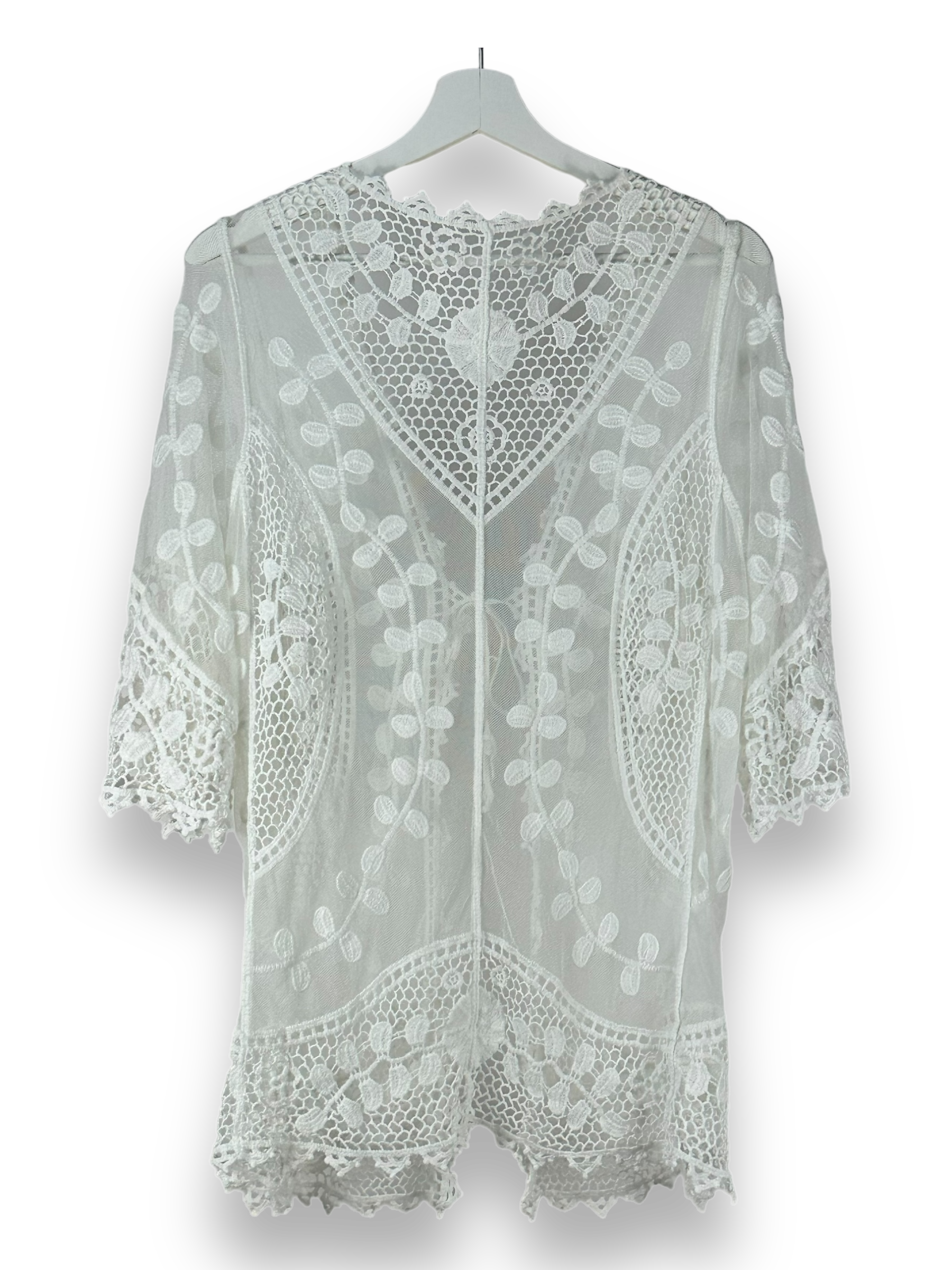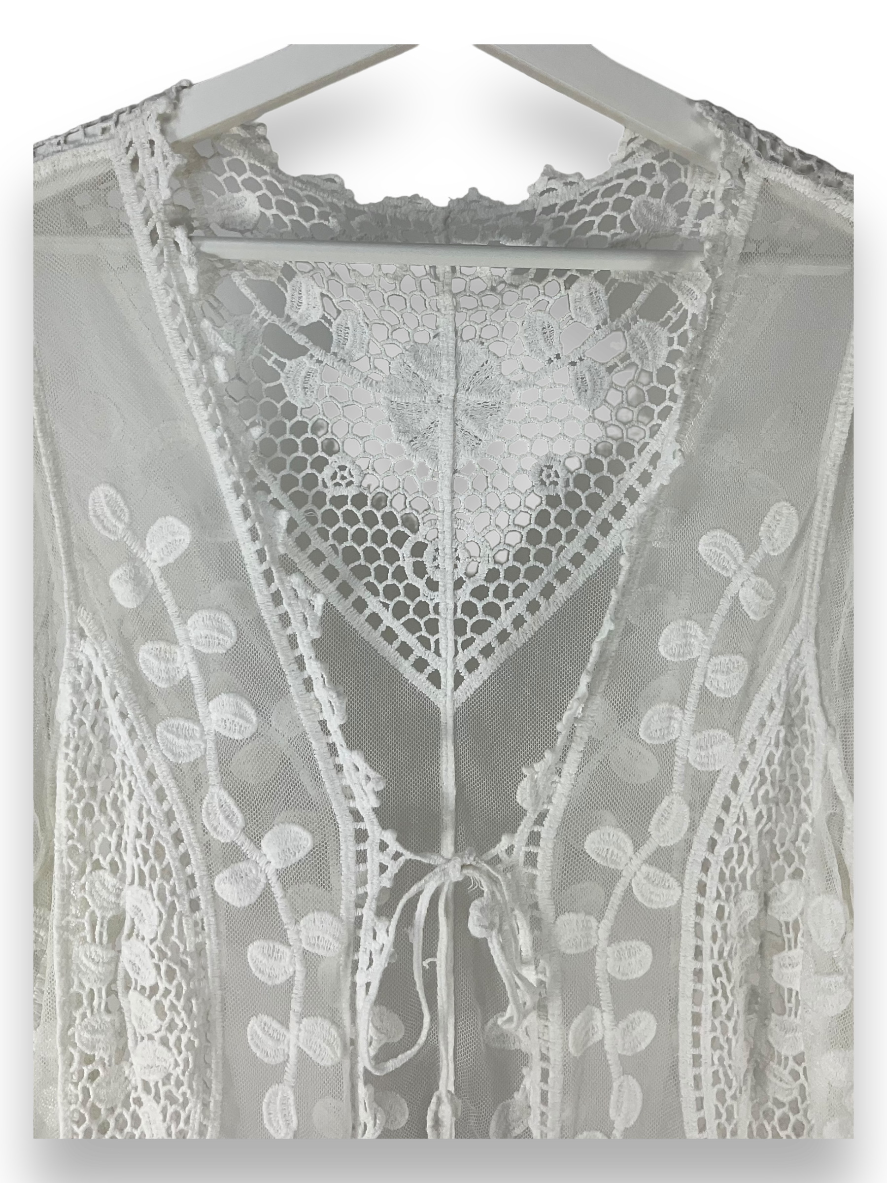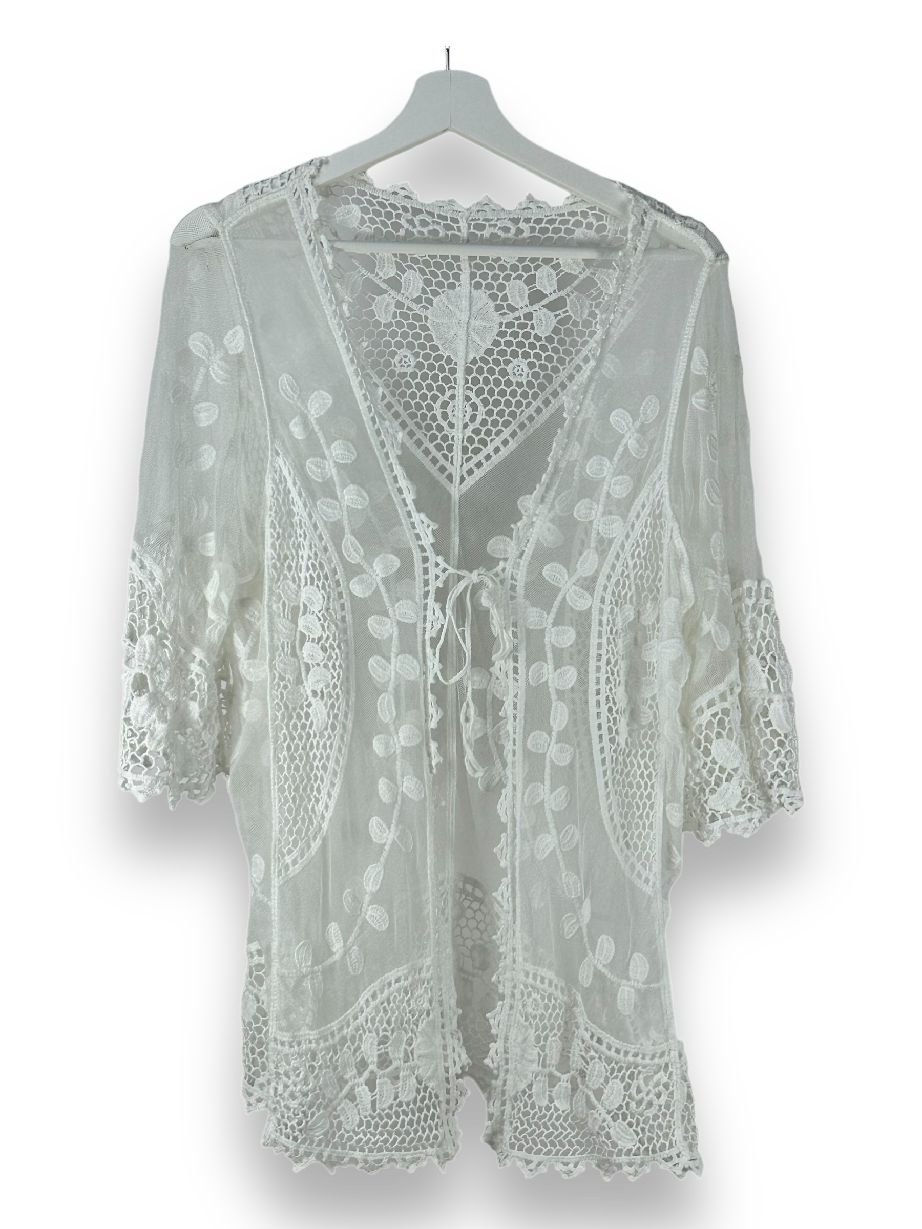 Das Besondere an dieser Strickjacke ist die aufwendige Lochspitze, die sie zu einem einzigartigen Modeaccessoire macht. Sie verleiht deinem Look eine subtile Raffinesse und Eleganz. Die Möglichkeit, sie vorne zu binden, bietet dir die Flexibilität, deinen Stil individuell anzupassen. Diese Strickjacke befindet sich in gutem Zustand und wird sicherlich eine Bereicherung für deine Garderobe sein. Egal, ob du sie über einem schicken Kleid, einem Top oder einem Badeanzug trägst, diese Jacke wird dir einen Hauch von Luxus und Eleganz verleihen.