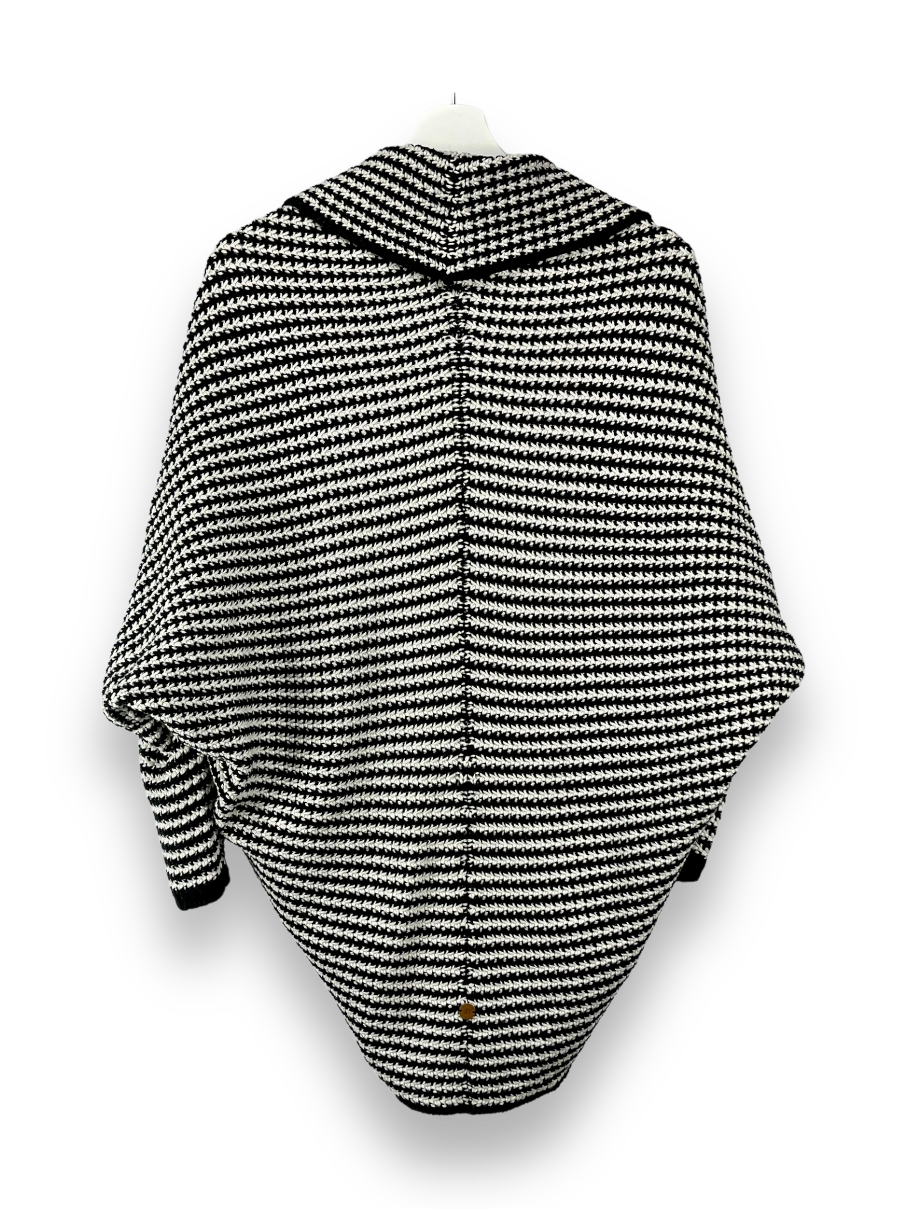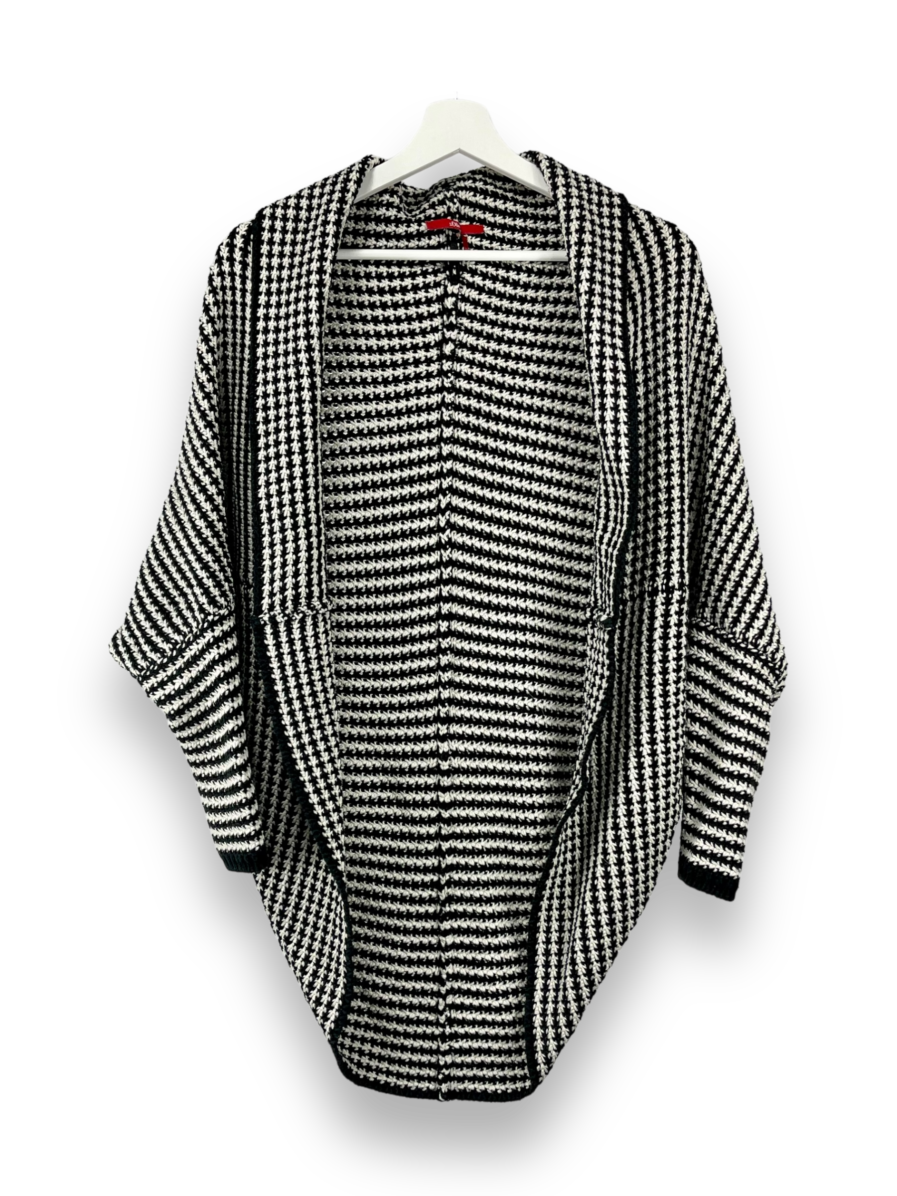 Hier haben wir eine Strickjacke von s. Oliver in weiss und schwarz gestreift. Sie ist rund und locker gestrickt und hat 3/4 lange Ärmel.