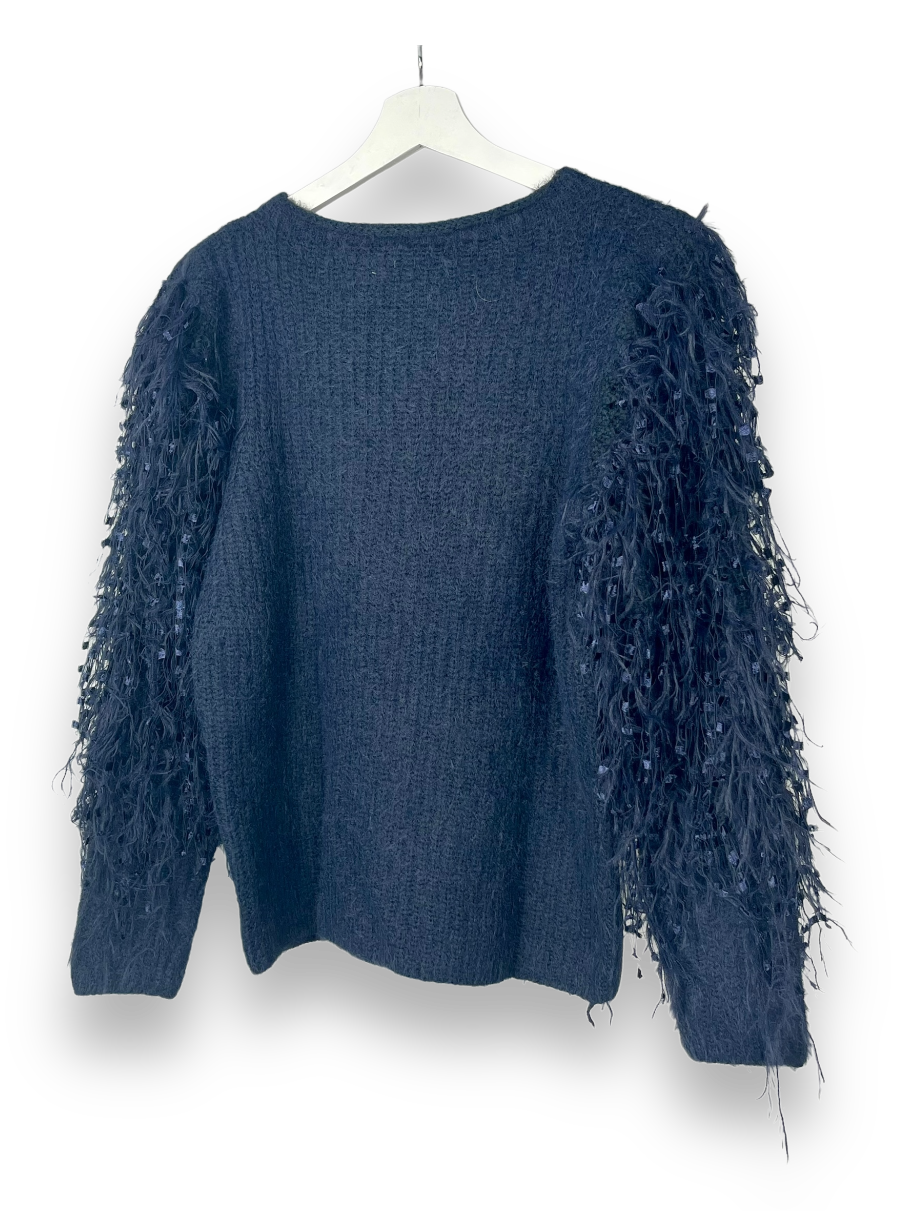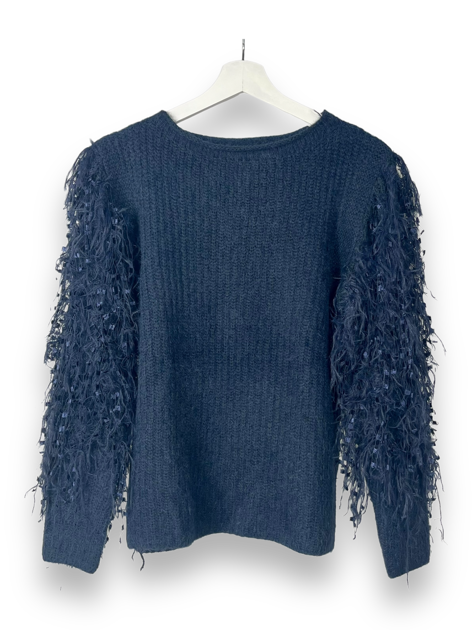 Hier haben wir einen tollen Strickpullover von Molly Bracken in dunkelblau, welcher aussergewöhnliche Fransen an den Ärmeln entlang hat.