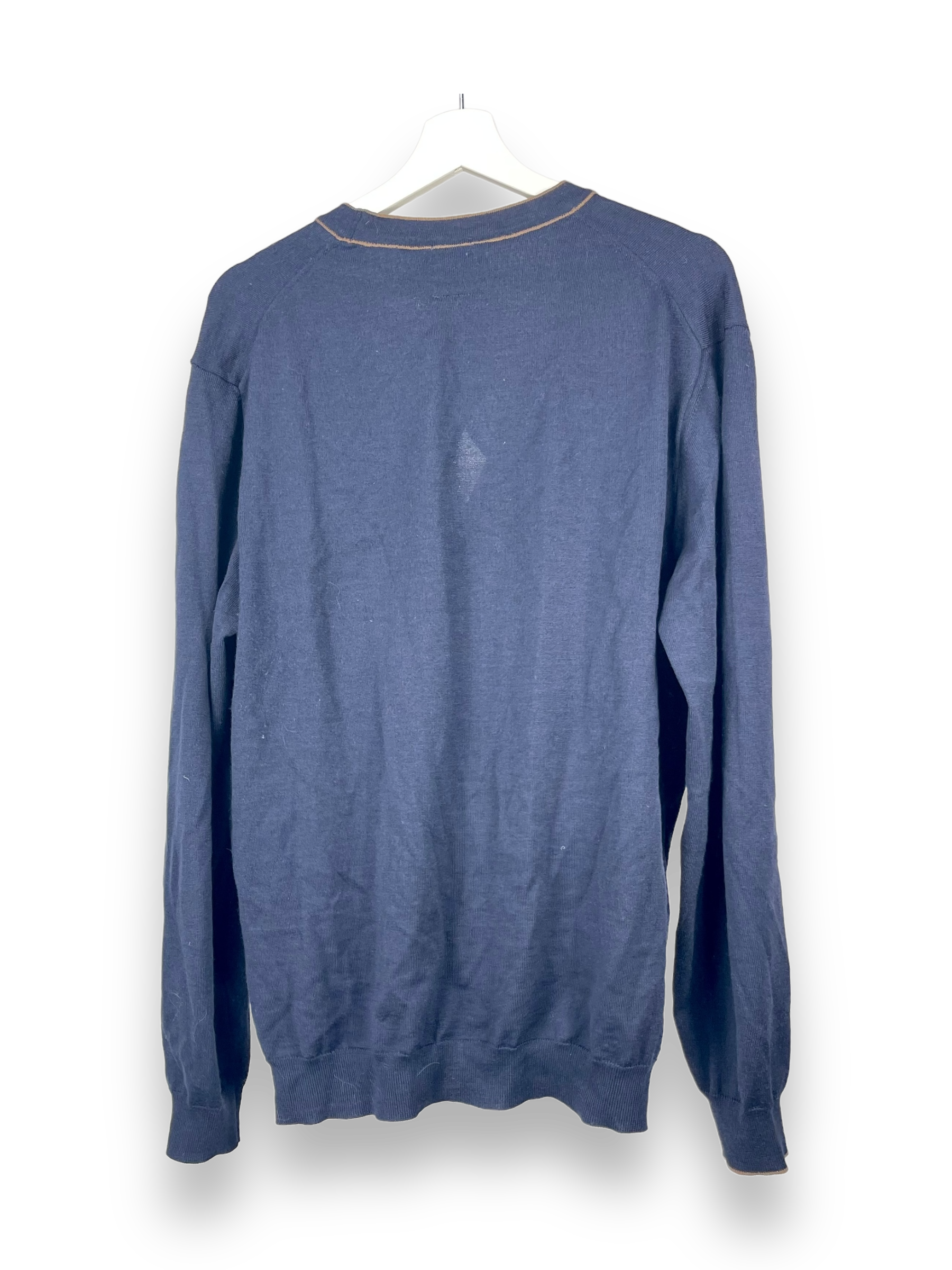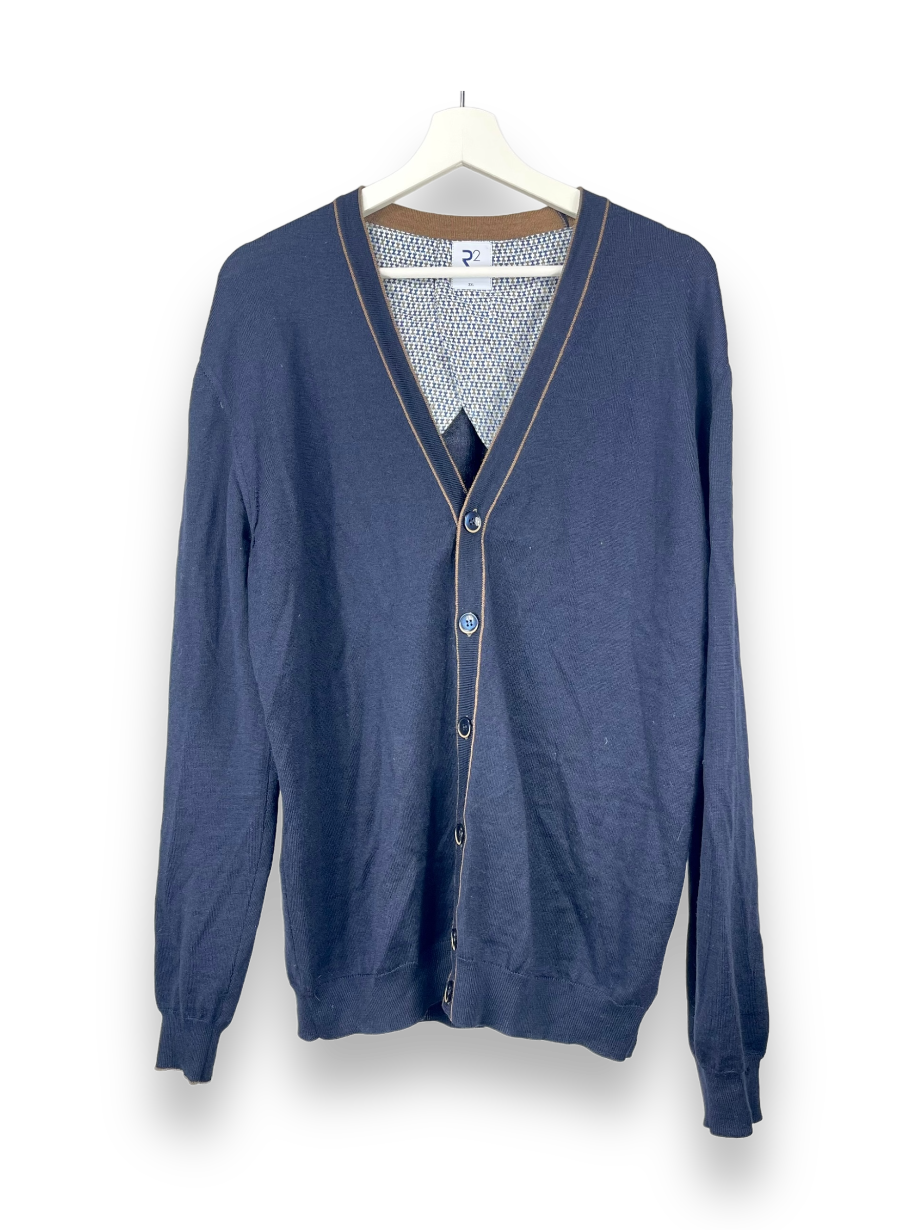 Die R2 Strickjacke ist auch hochwertiger Schurwolle hergestellt. Sie ist komplett dunkelblau, hat aber zusätzlich feine, braune Details. Vorne hat es eine Knopfleiste damit man den Cardigan offen oder zu tragen kann.