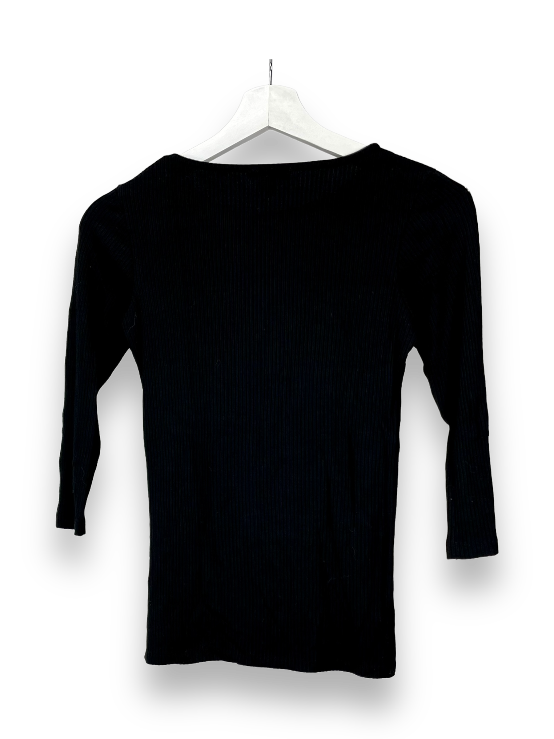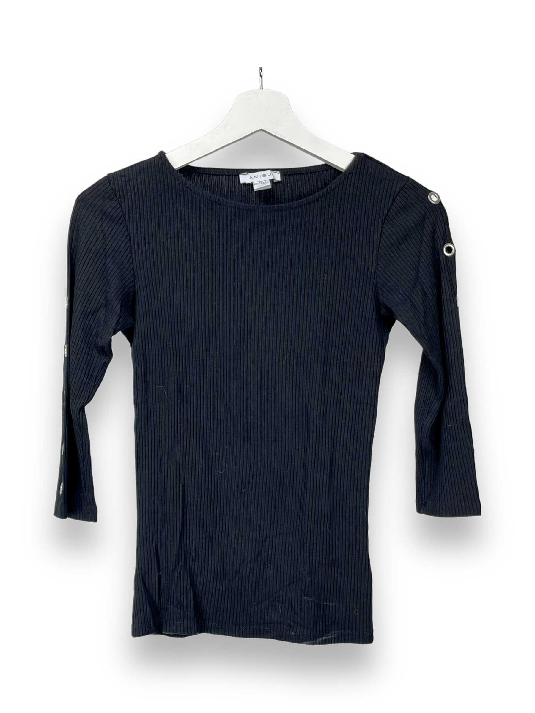 Hier haben wir ein Sweatshirt in uni schwarz mit 3/4 langen Ärmel. Als Details hat es an den Ärmeln entlang, Nieten mit kleinen Löchern, die das ganze Shirt noch ein wenig spezieller machen.