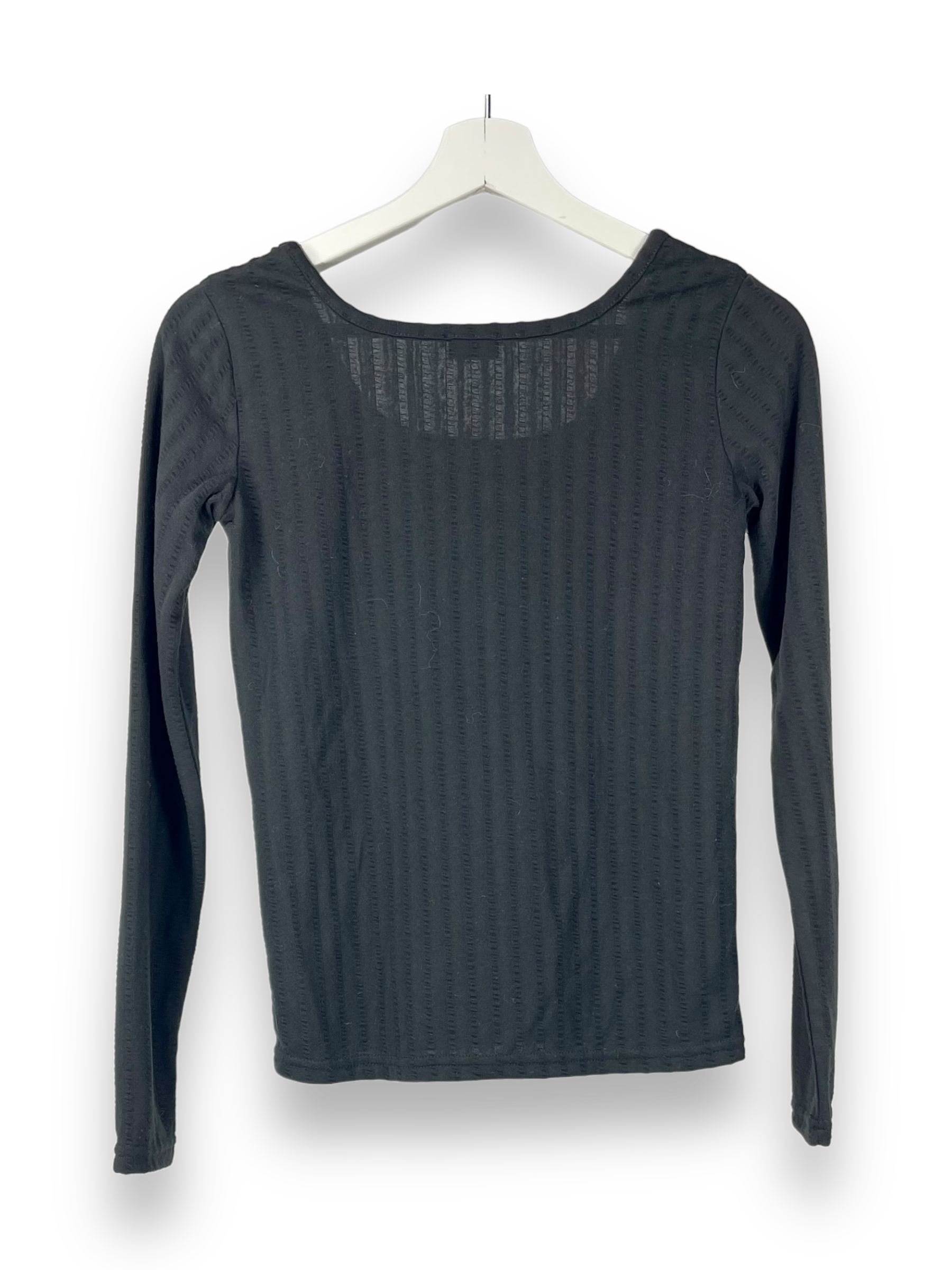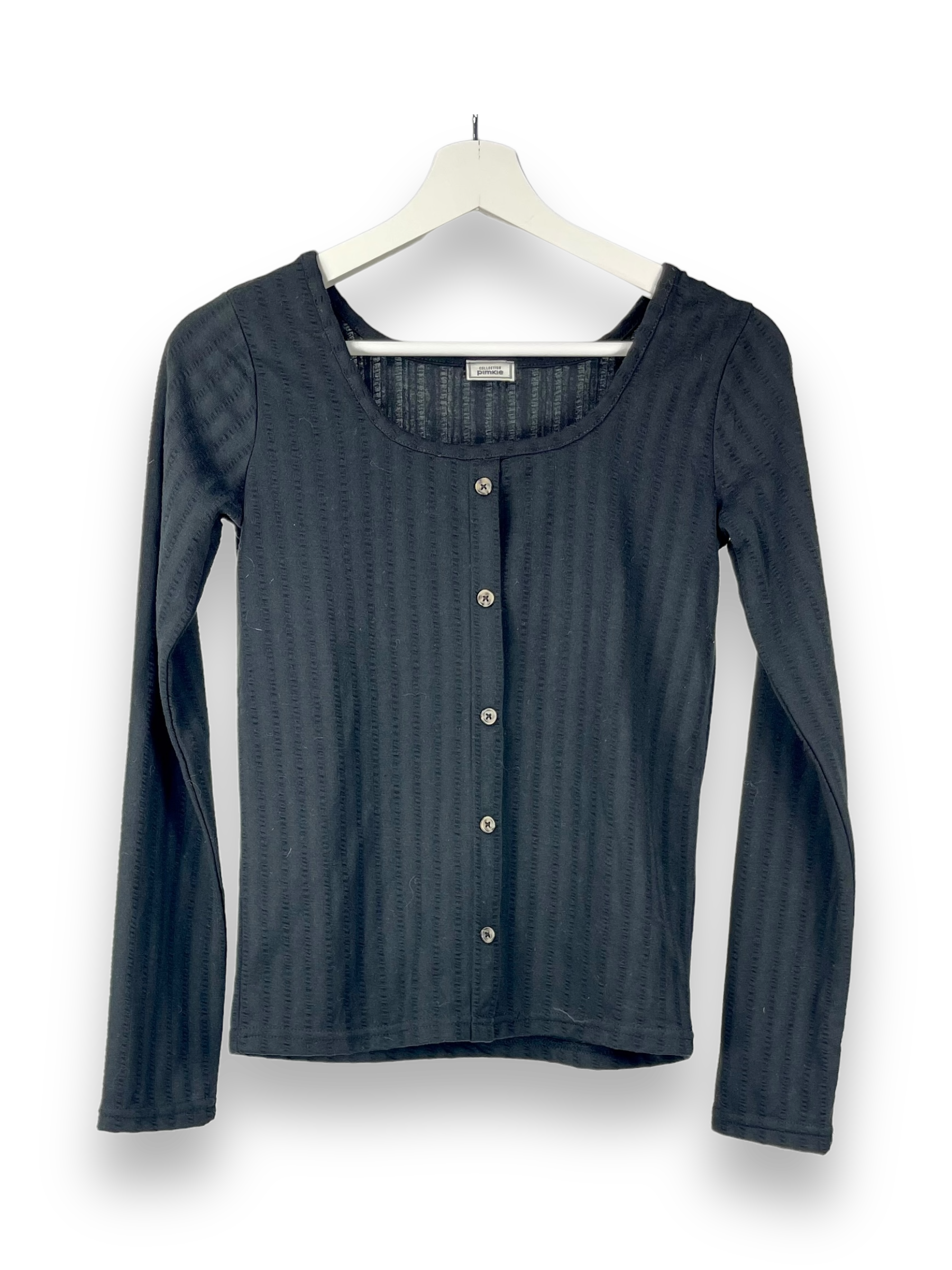 Das Sweatshirt von Pimkie ist uni schwarz und hat vorne als Muster eine Knopfleiste von oben nach unten, welche nicht geöffnet werden kann.