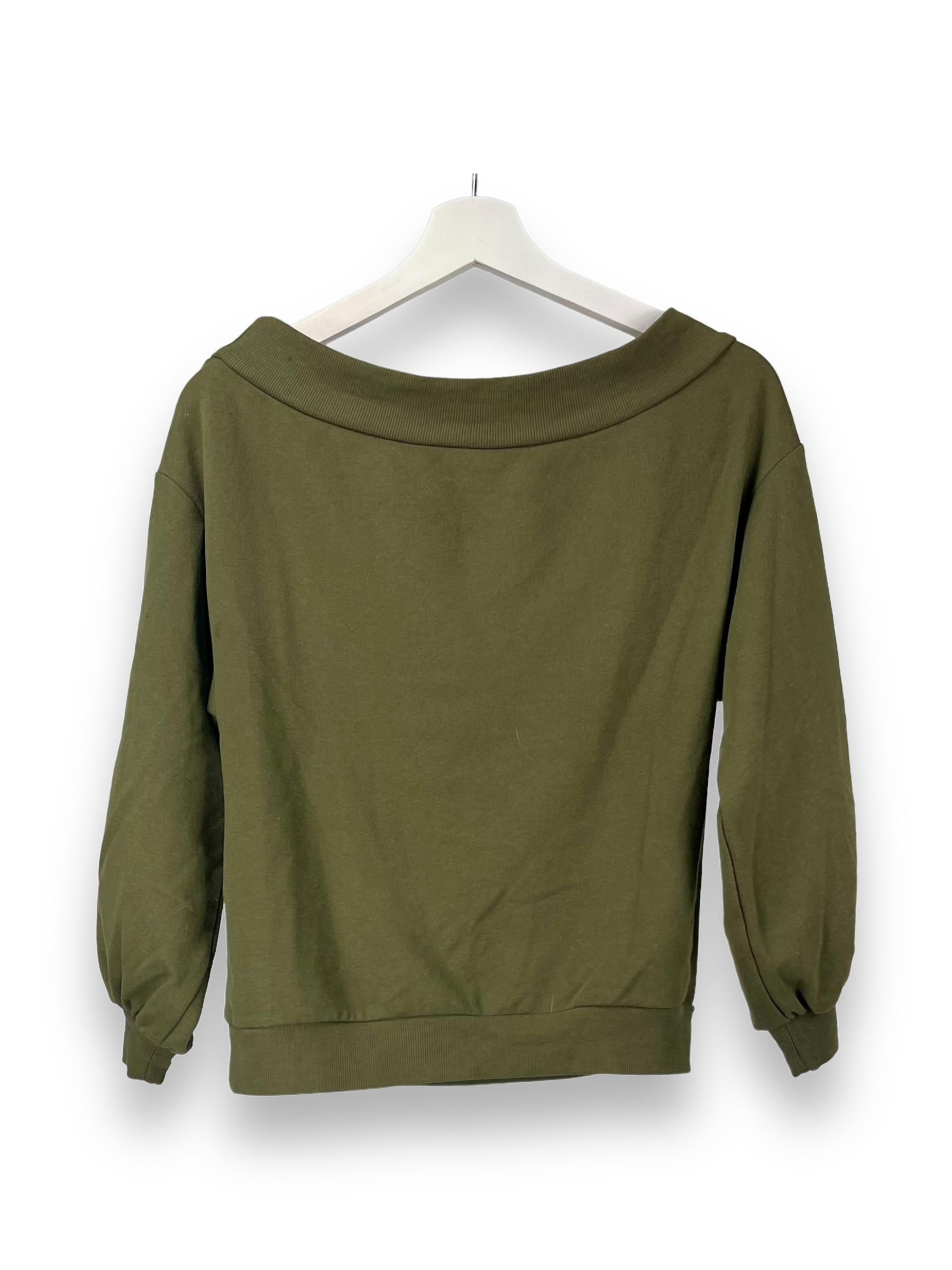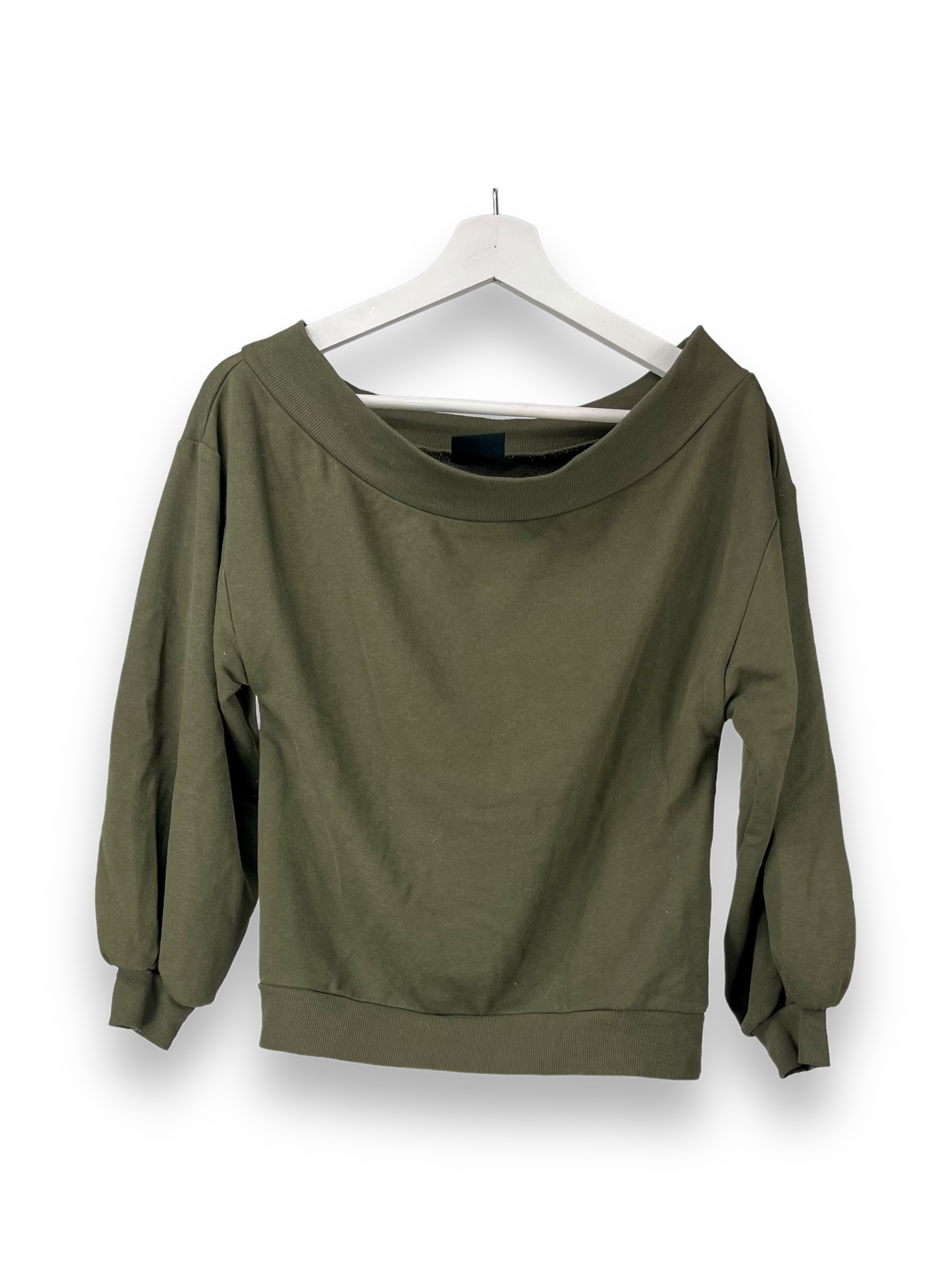 Die Farbe Oliv benennt ein stark abgedunkeltes Grün oder Gelbgrün. Hier haben wir ein Sweatshirt in einem etwas dunkleren oliv. Der Schnitt ist gerade / locker mit 3/4 langen Ärmel. Das Sweatshirt kann auch schulterfrei getragen werden, da es oben einen Bund hat für einen besseren Halt.