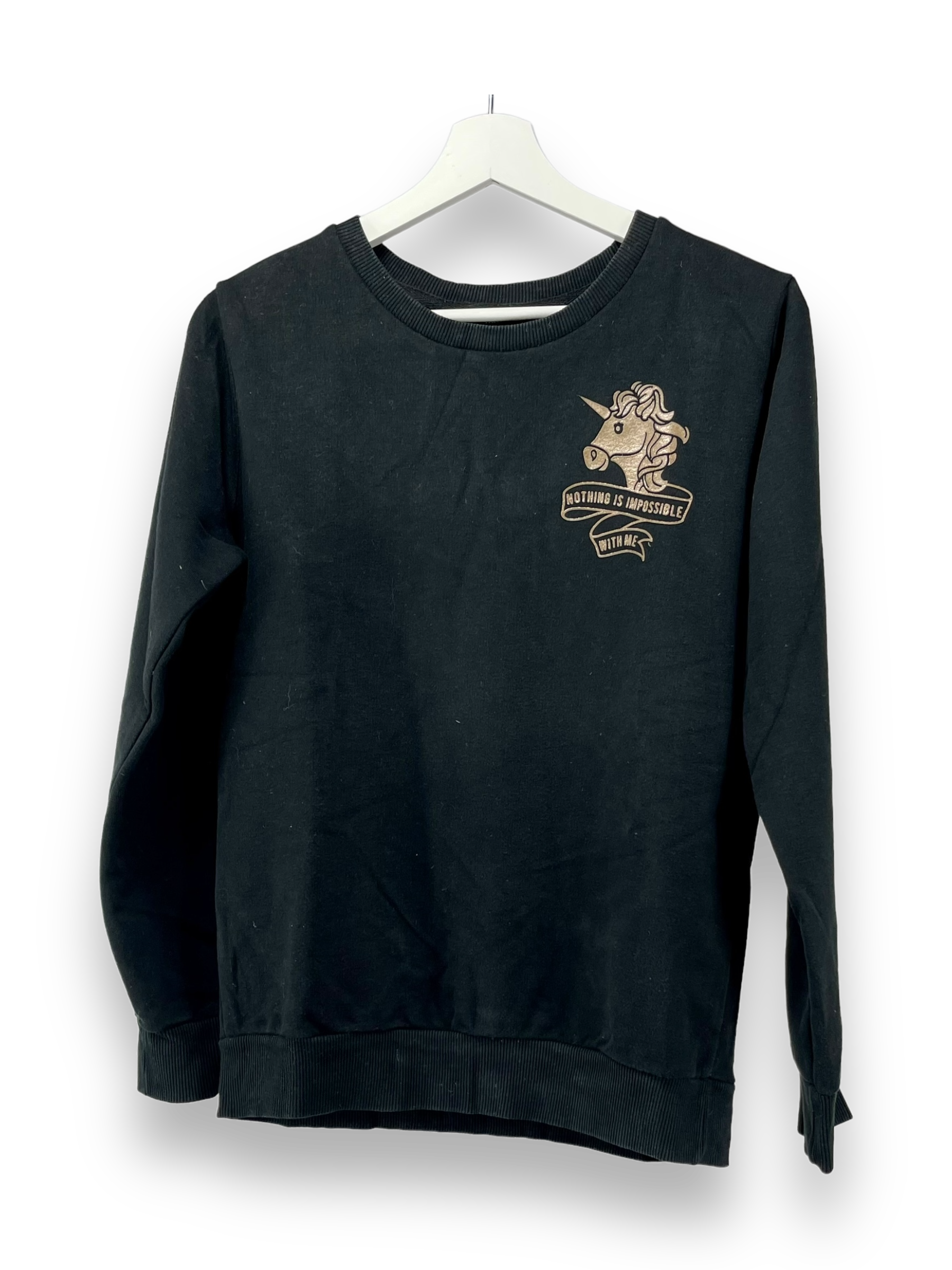 Das Einhorn ist ein Fabelwesen von Pferde- oder Ziegengestalt mit einem geraden Horn auf der Stirnmitte. Hier haben wir ein Sweatshirt mit einem Einhorn-Stick auf der Brust in gold / bronze. Ansonsten ist der Hoodie uni schwarz mit einem normalen, geraden Schnitt.