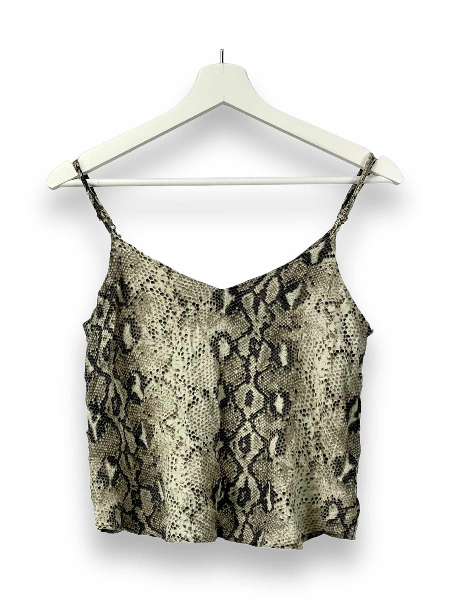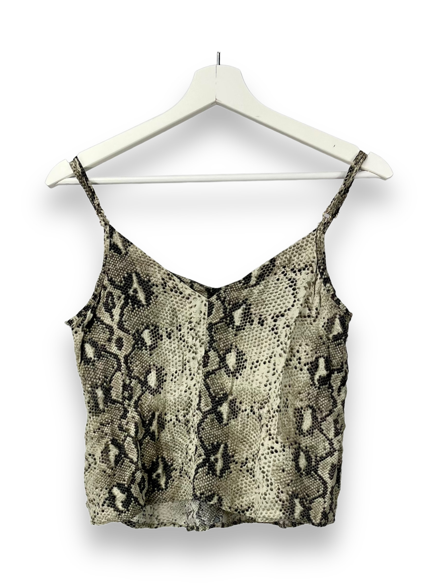 Die wäre es mit einem Top mit einem Schlangenprint? Hier haben wir eins ein beige und schwarz. Es ist ärmellos mit feinen Spaghettiträger und hat einen geraden Schnitt.