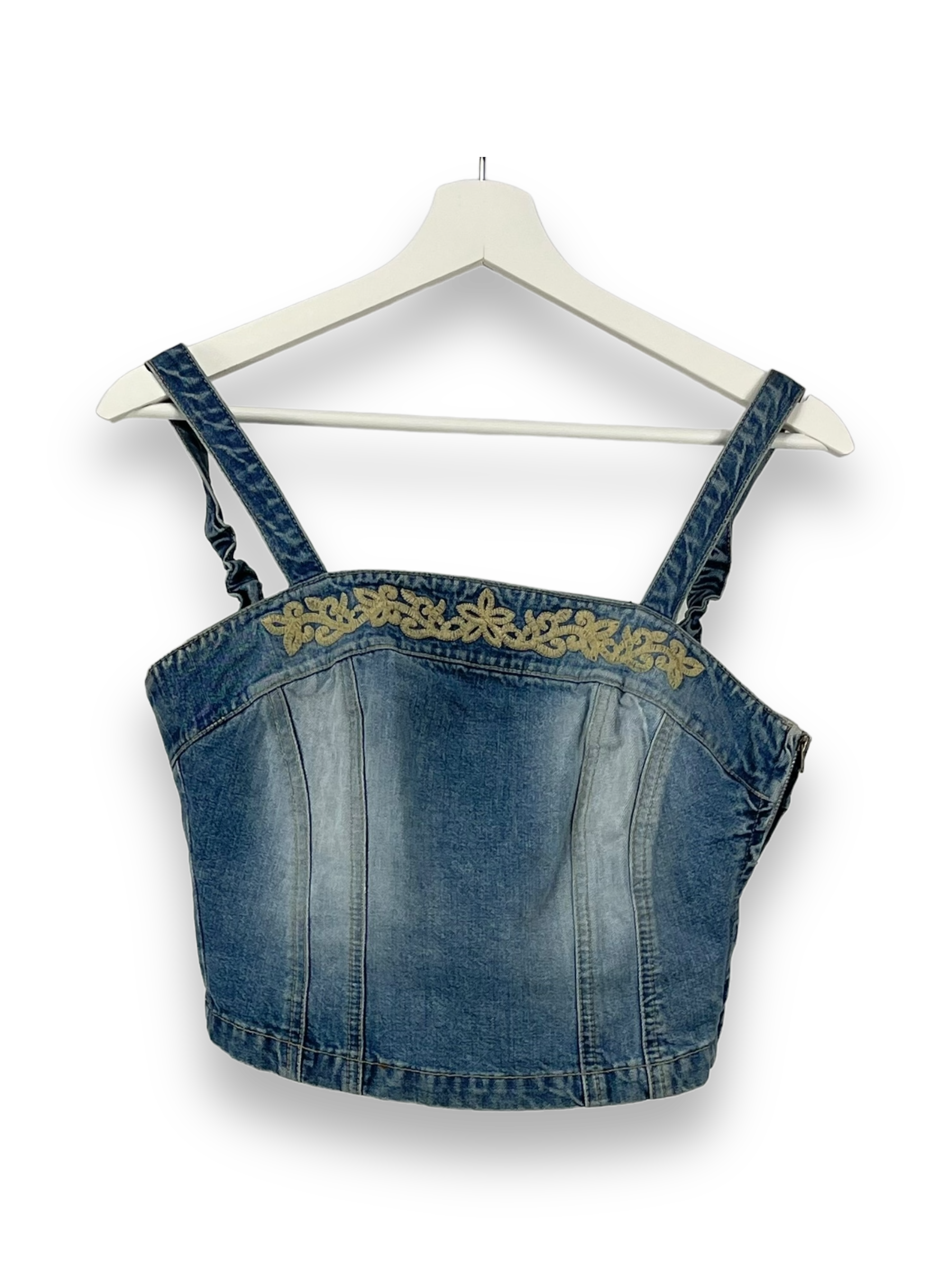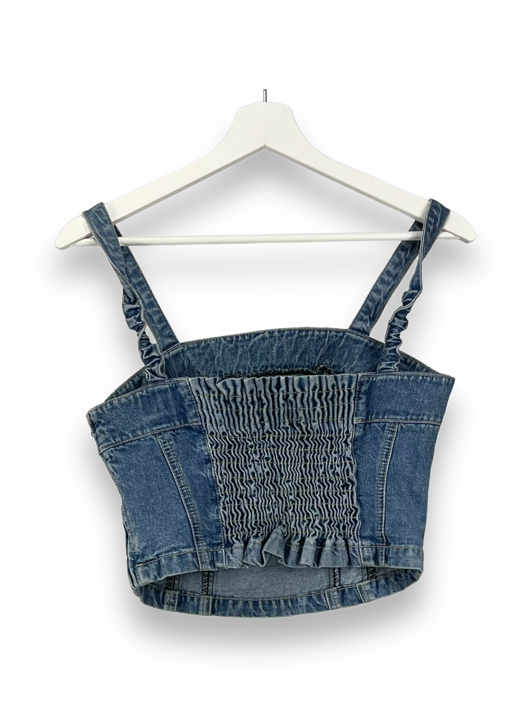 Das Denim Top von Kenny‘s ist ärmellos und hat einen kurzen Schnitt. An der Seite lässt es sich mit einem Reissverschluss schliessen und hinten am Rücken und bei den Träger hat es einen feinen Gummizug. Vorne beim Ausschnitt hat es einen feinen tollen Stick und der Stoff ist leicht verwaschen.