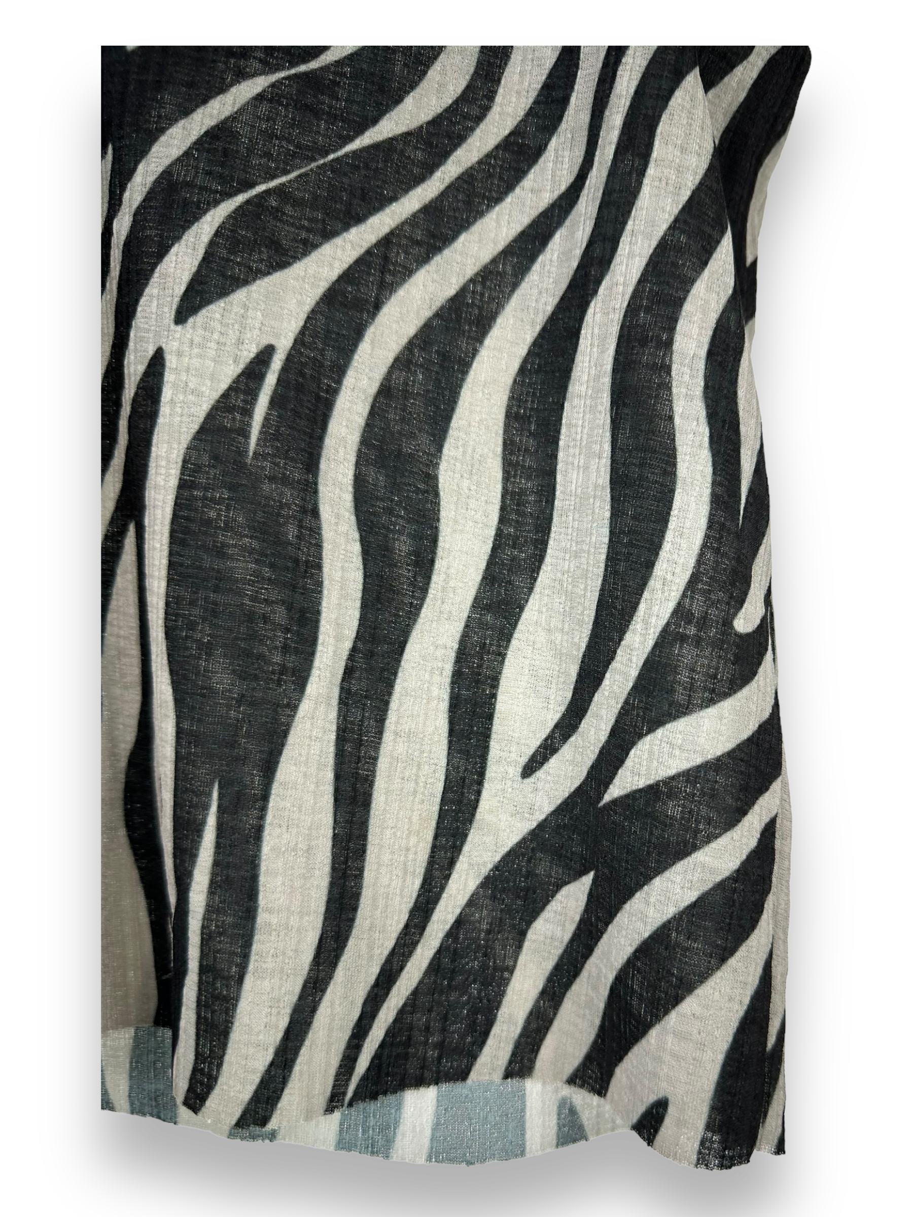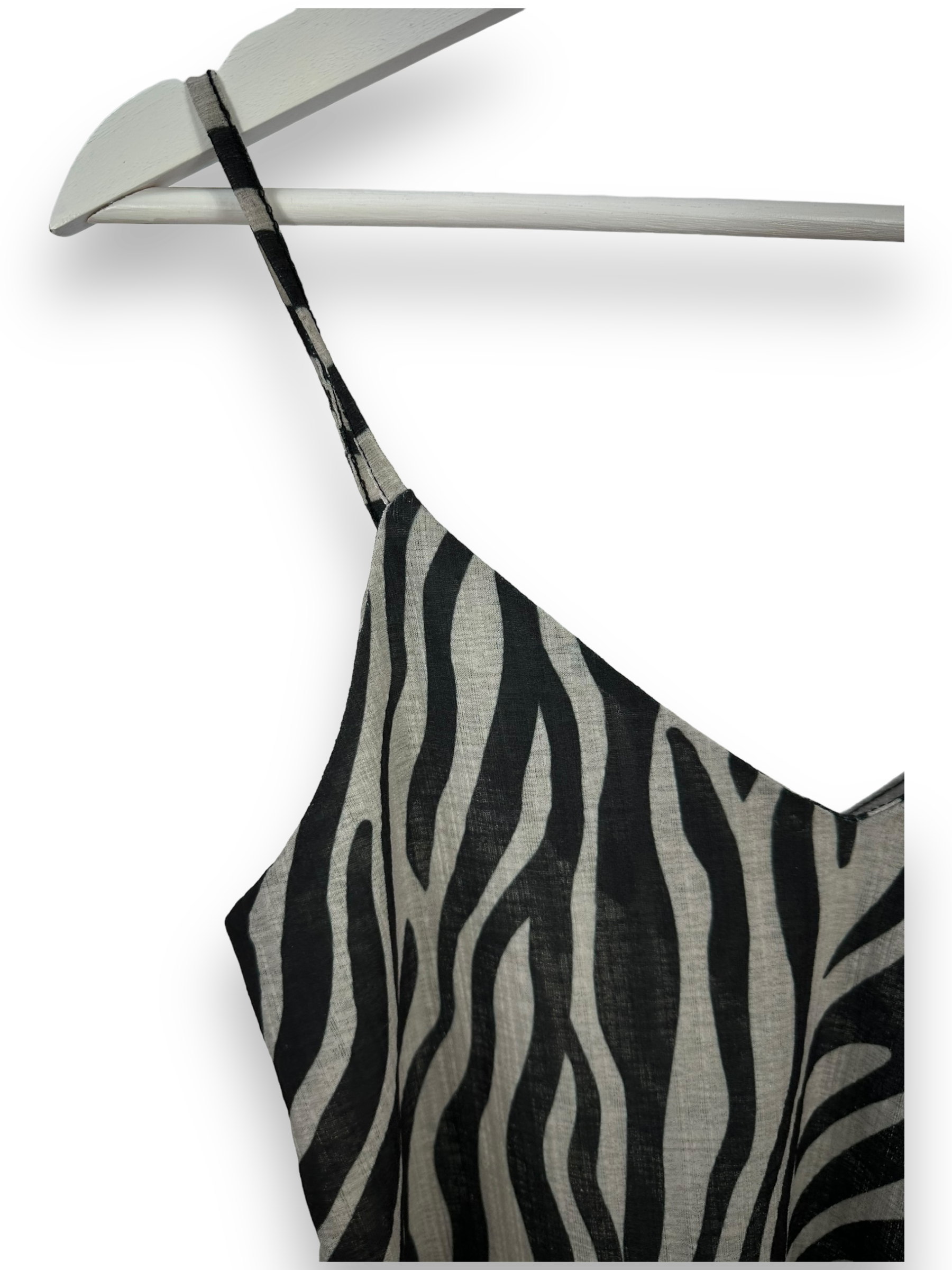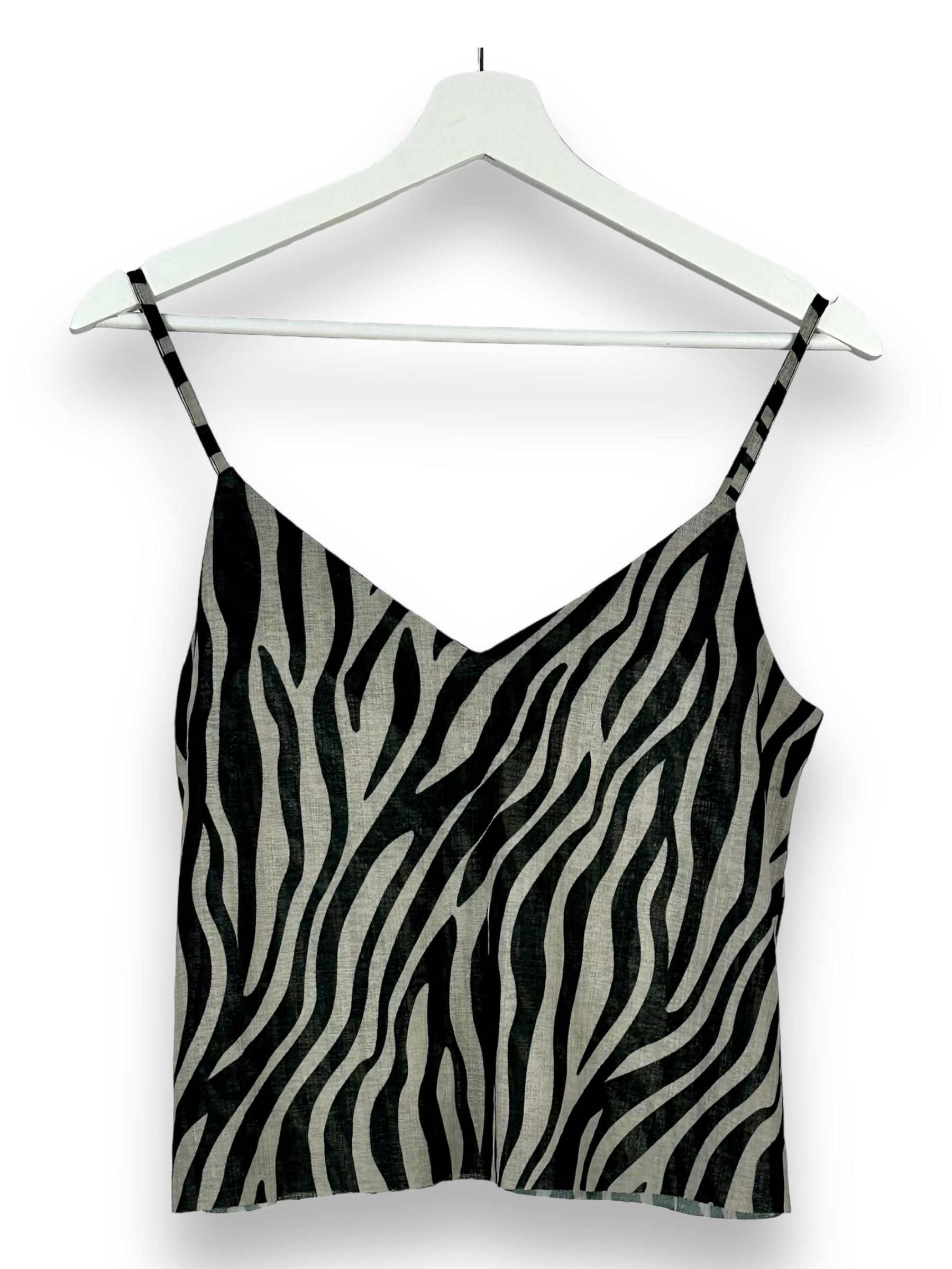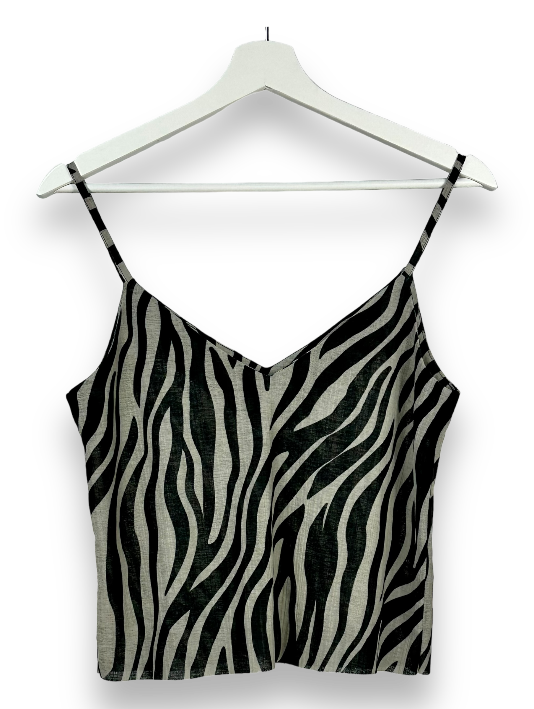 Tauche ein in den wilden Chic mit diesem Top in Schwarz und Beige mit Zebraprint, das deinen Look aufregend und stylisch macht. Die Kombination aus Spaghettiträgern und einem lockeren Schnitt verleiht diesem Top eine luftige Leichtigkeit und sorgt für angenehmen Tragekomfort. Sein zebragemustertes Design bringt eine wilde Note in dein Outfit und verleiht dir eine einzigartige Ausstrahlung.