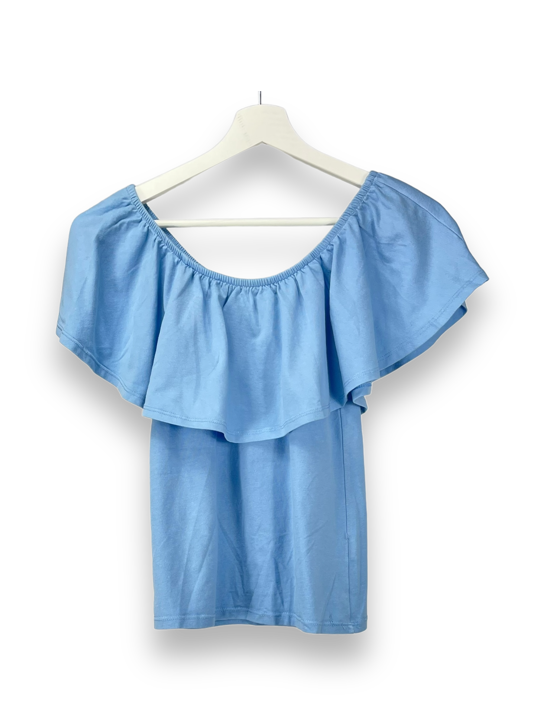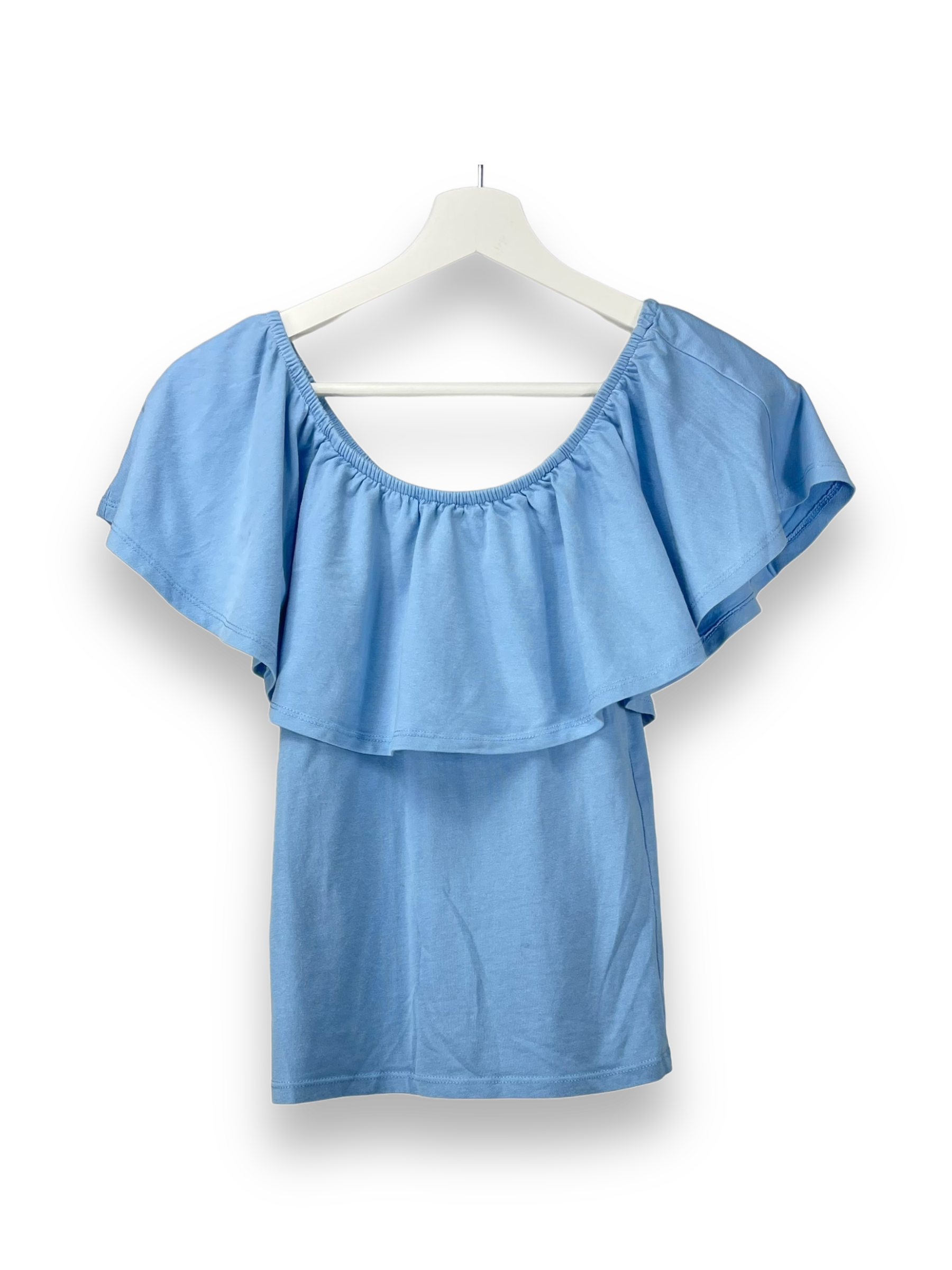Dieses Shirt kann als Top mit kurzen Ärmel, oder schulterfrei getragen werden. Du findest es in einem schönen blau uni. Damit das Shirt beim schulterfreien Tragen einen guten Halt hat, hat es über den ganzen Kragen einen Gummizug.
