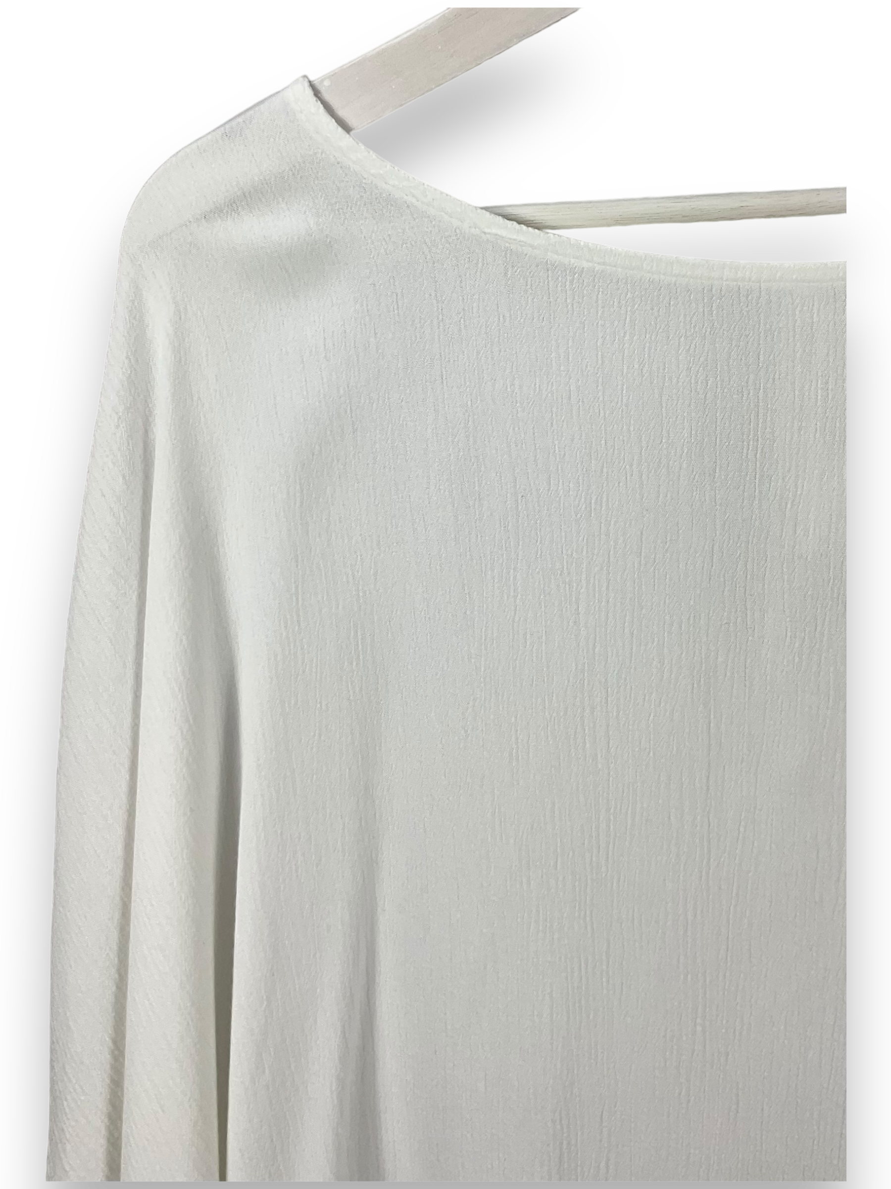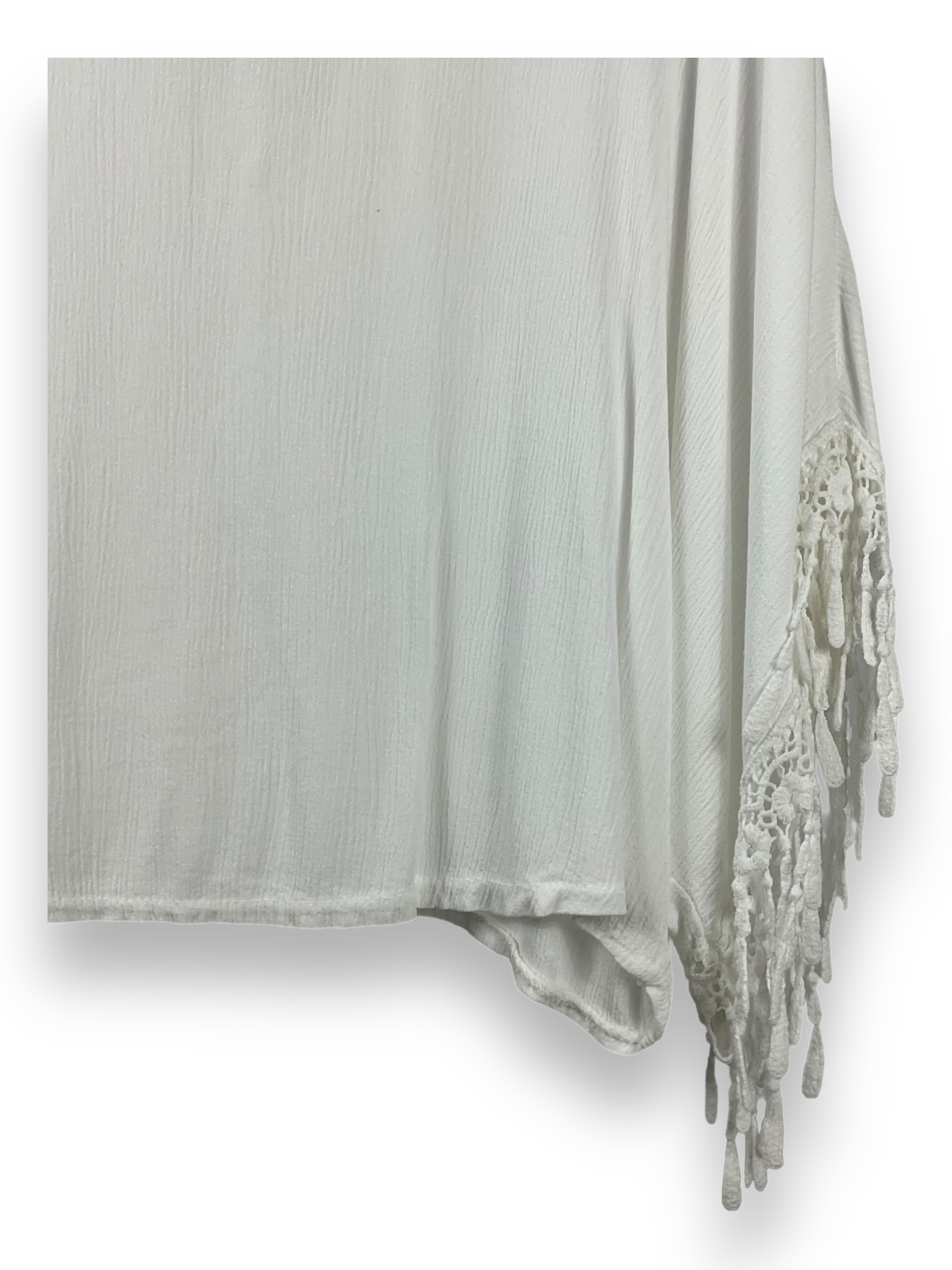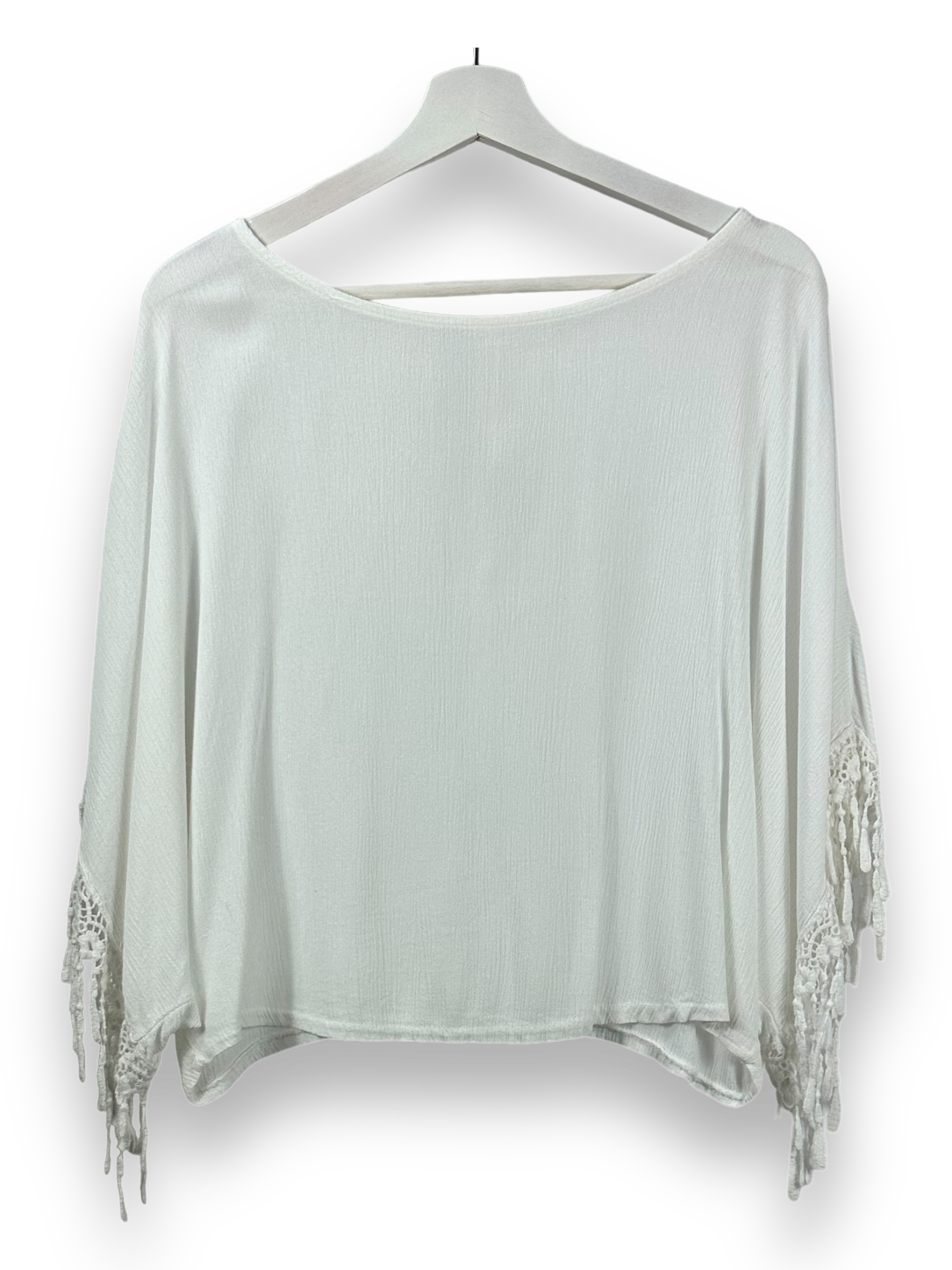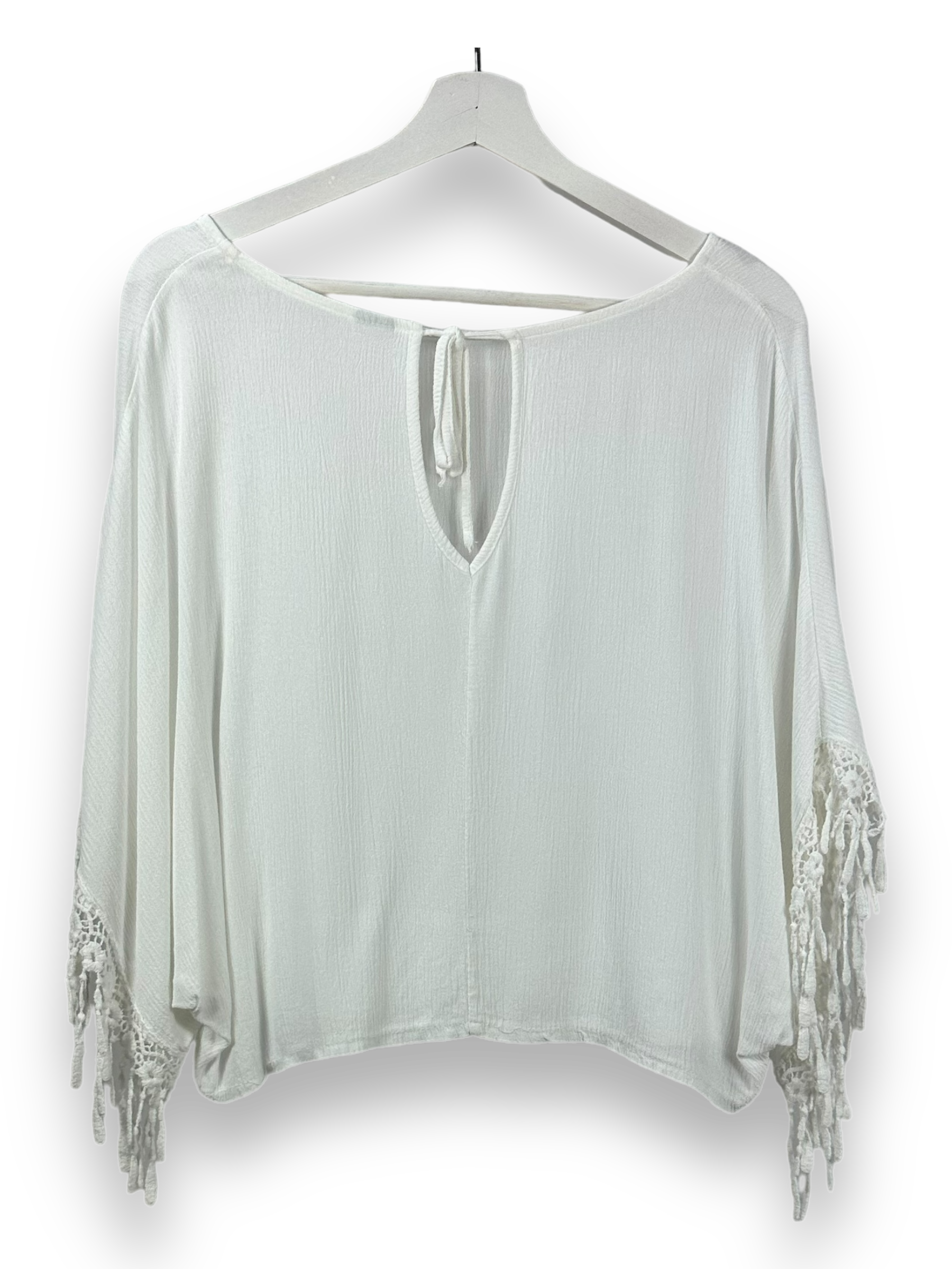 Tauche ein in die zeitlose Eleganz dieses weissen Blusentops, das deinen Look mit Leichtigkeit und Stil ergänzt. Mit seinem geraden, lockeren Schnitt und den Fledermausärmeln bietet dieses Top einen bequemen und dennoch modischen Look. Die Spitzenverzierungen an den Ärmeln verleihen ihm eine raffinierte Note und machen es zu einem vielseitigen Stück für verschiedene Anlässe.