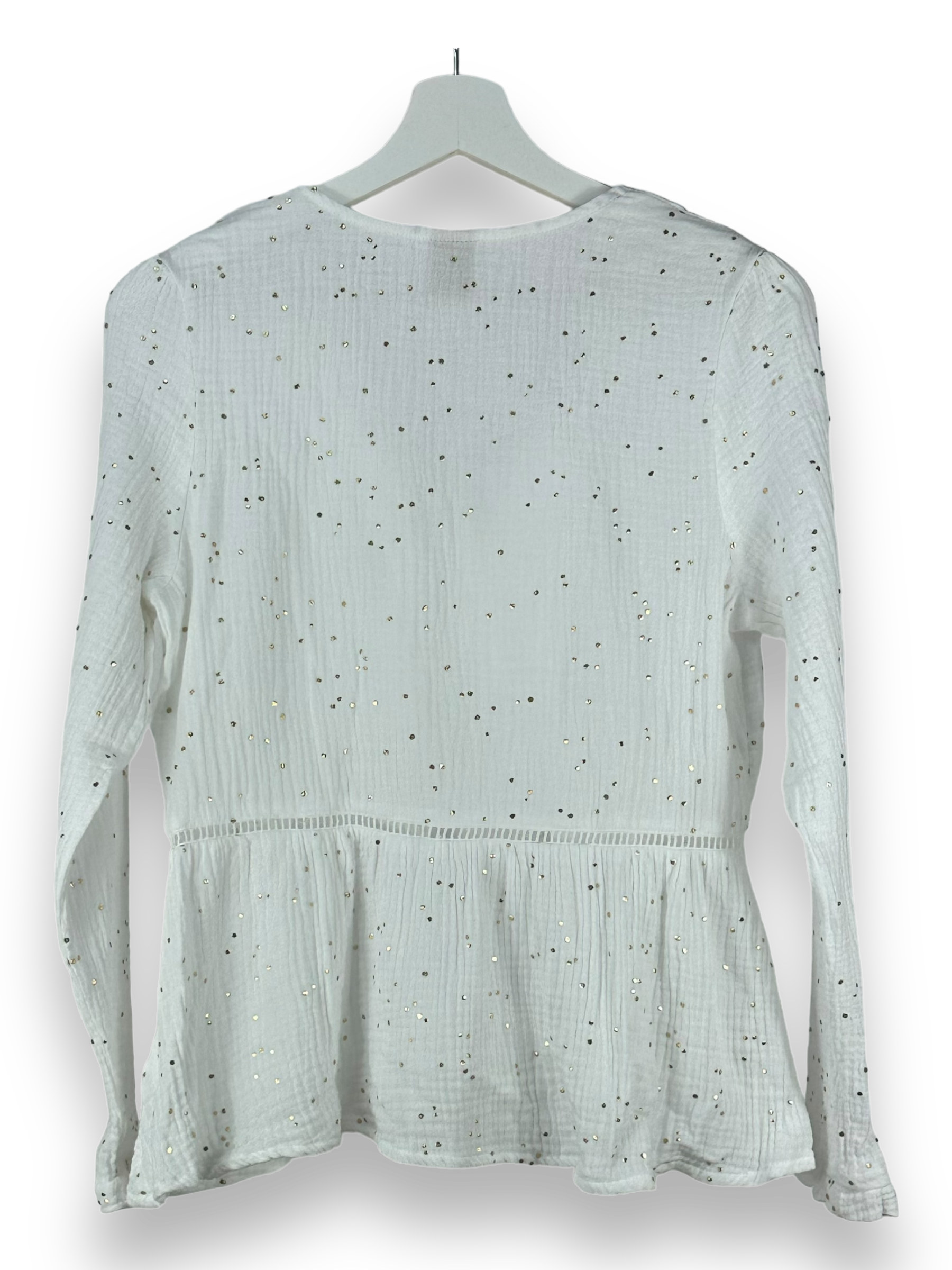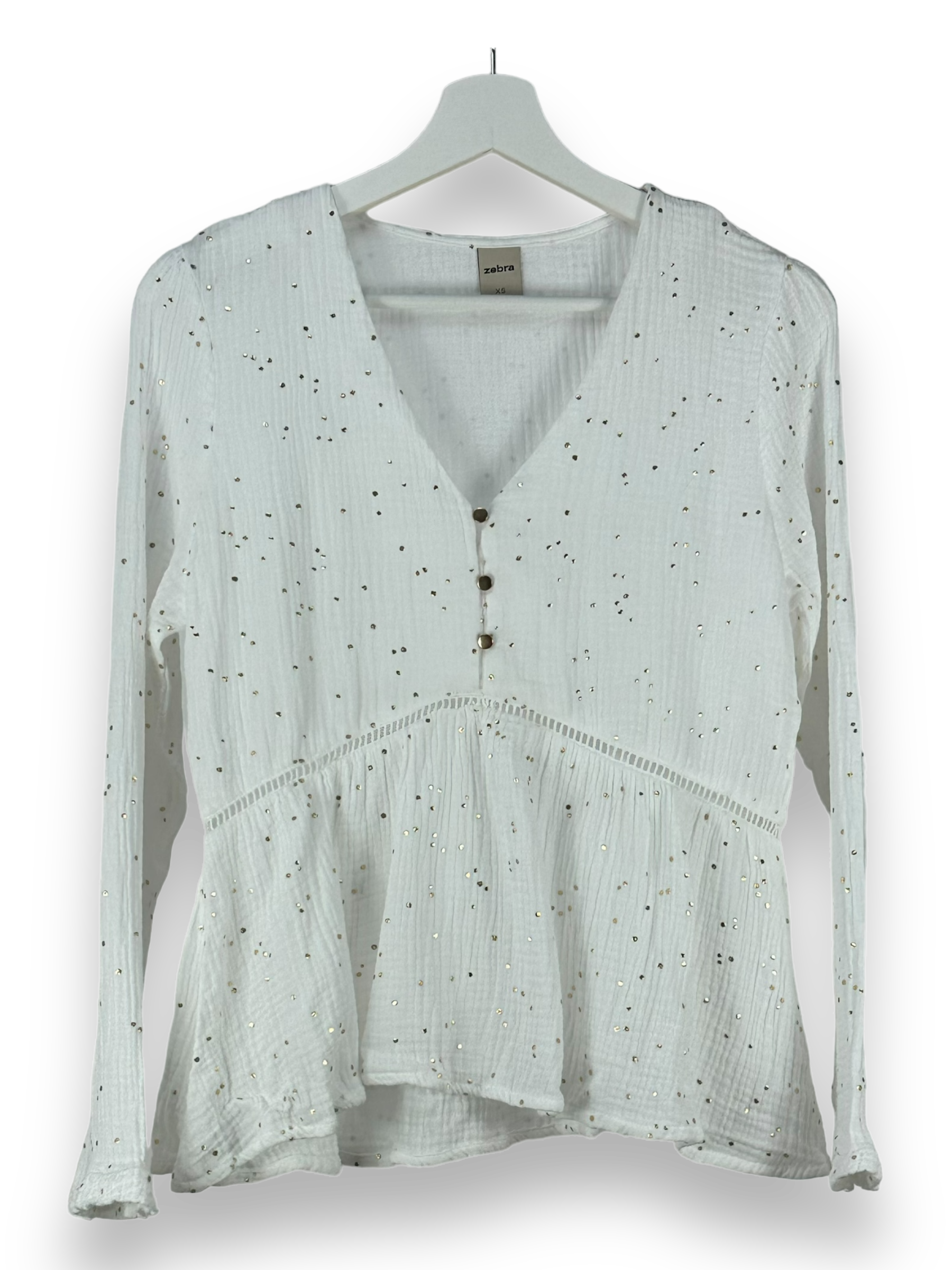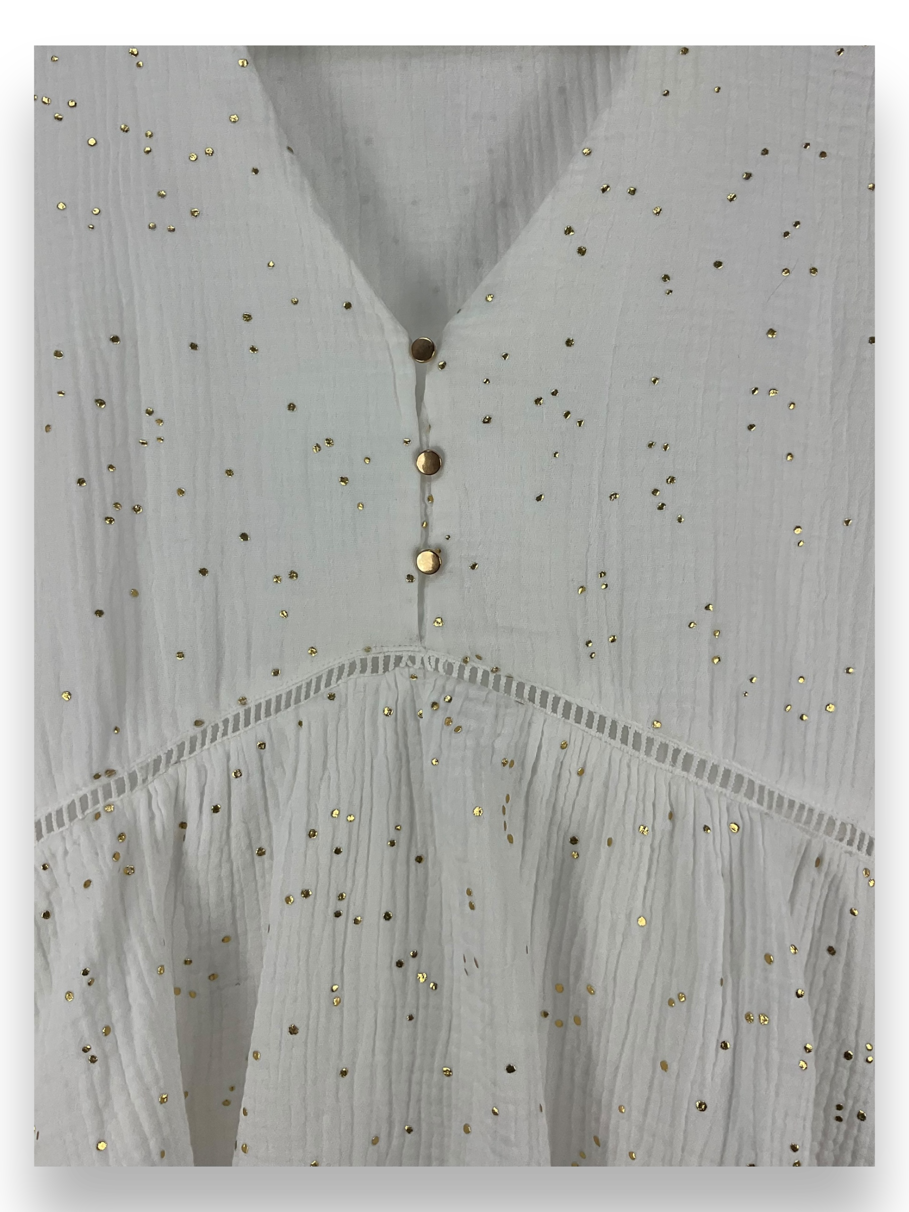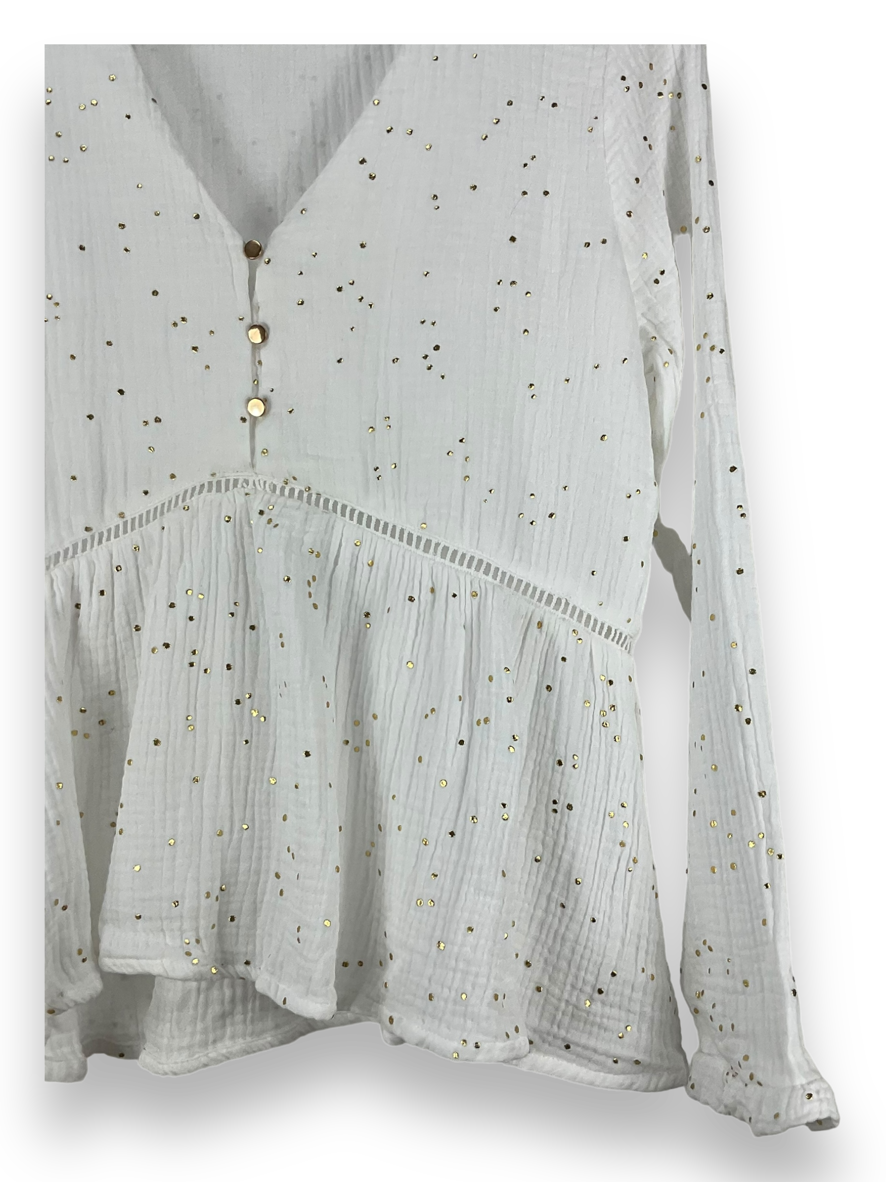 Das goldene Punktmuster verleiht diesem Top eine besondere Eleganz, während der V-Ausschnitt mit Knöpfen einen Hauch von Raffinesse hinzufügt. Die langen Ärmel halten dich an kühleren Tagen angenehm warm.