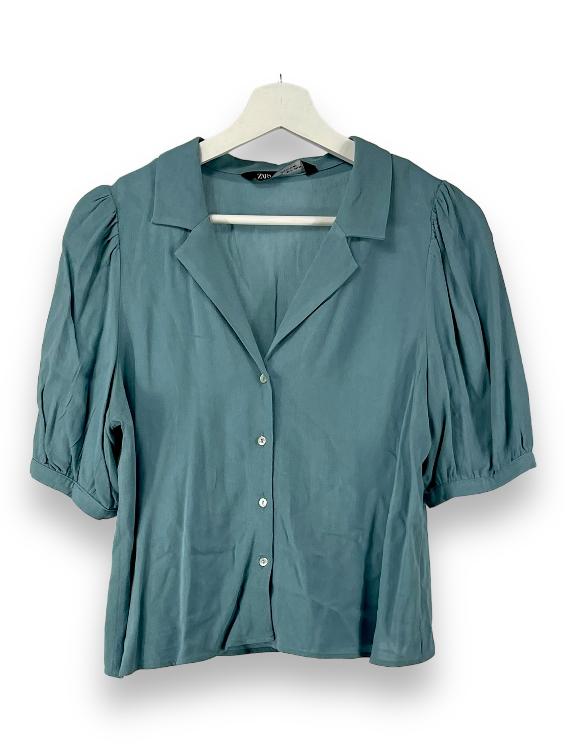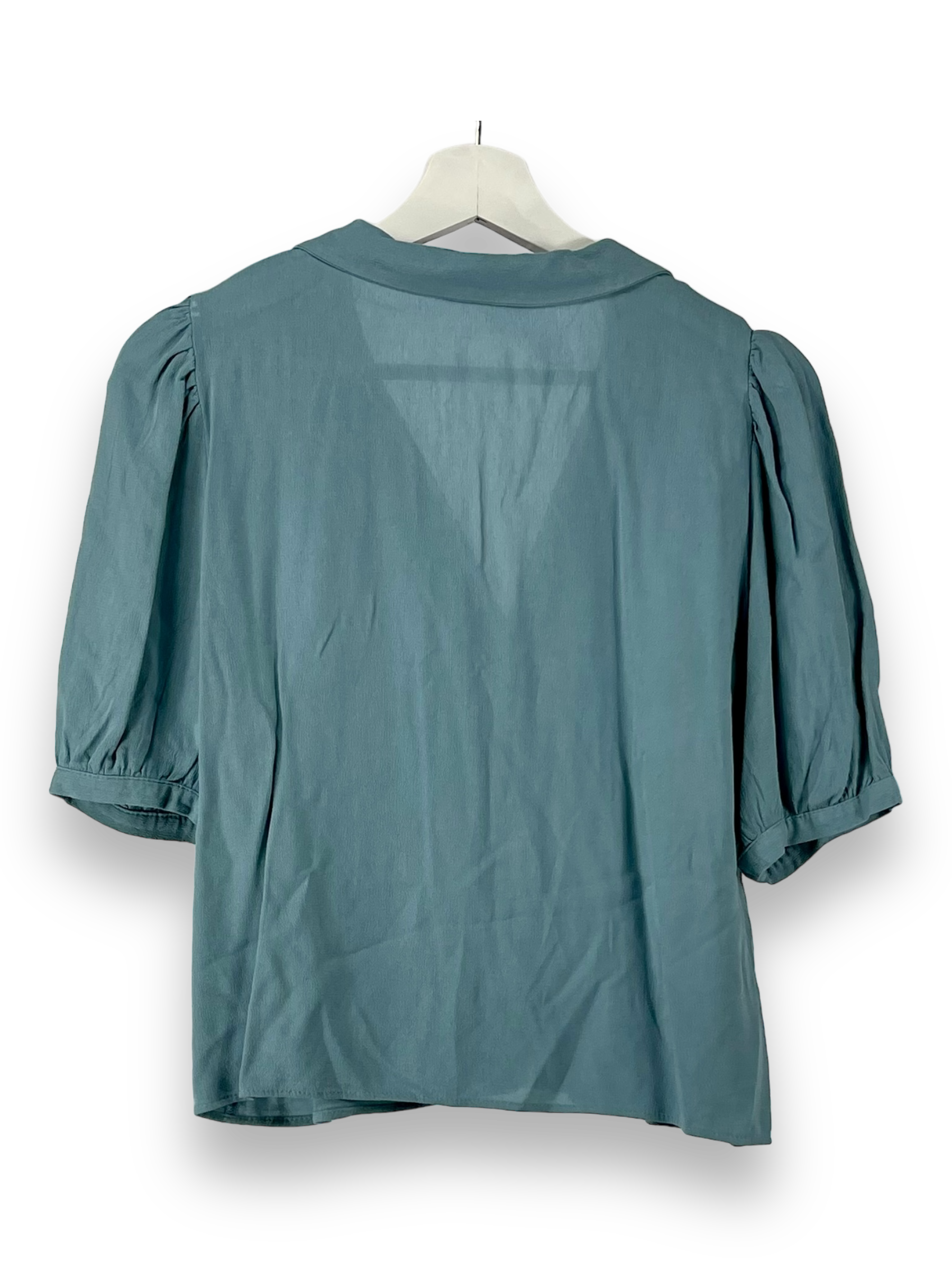 Hier haben wir ein Blusentop aus Viskose und Wolle in einem schönen Blau. Sie ist kurzarm und etwas kürzer geschnitten. Vorne hat die Bluse eine Knopfleiste und bringt zusätzlich Ballonärmel mit sich.