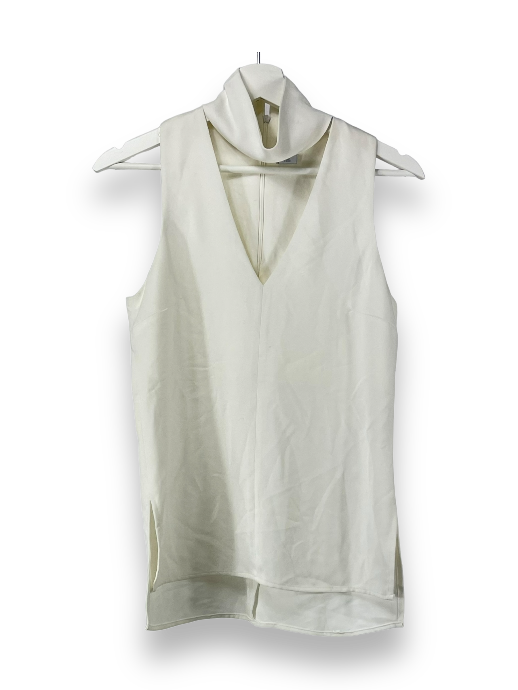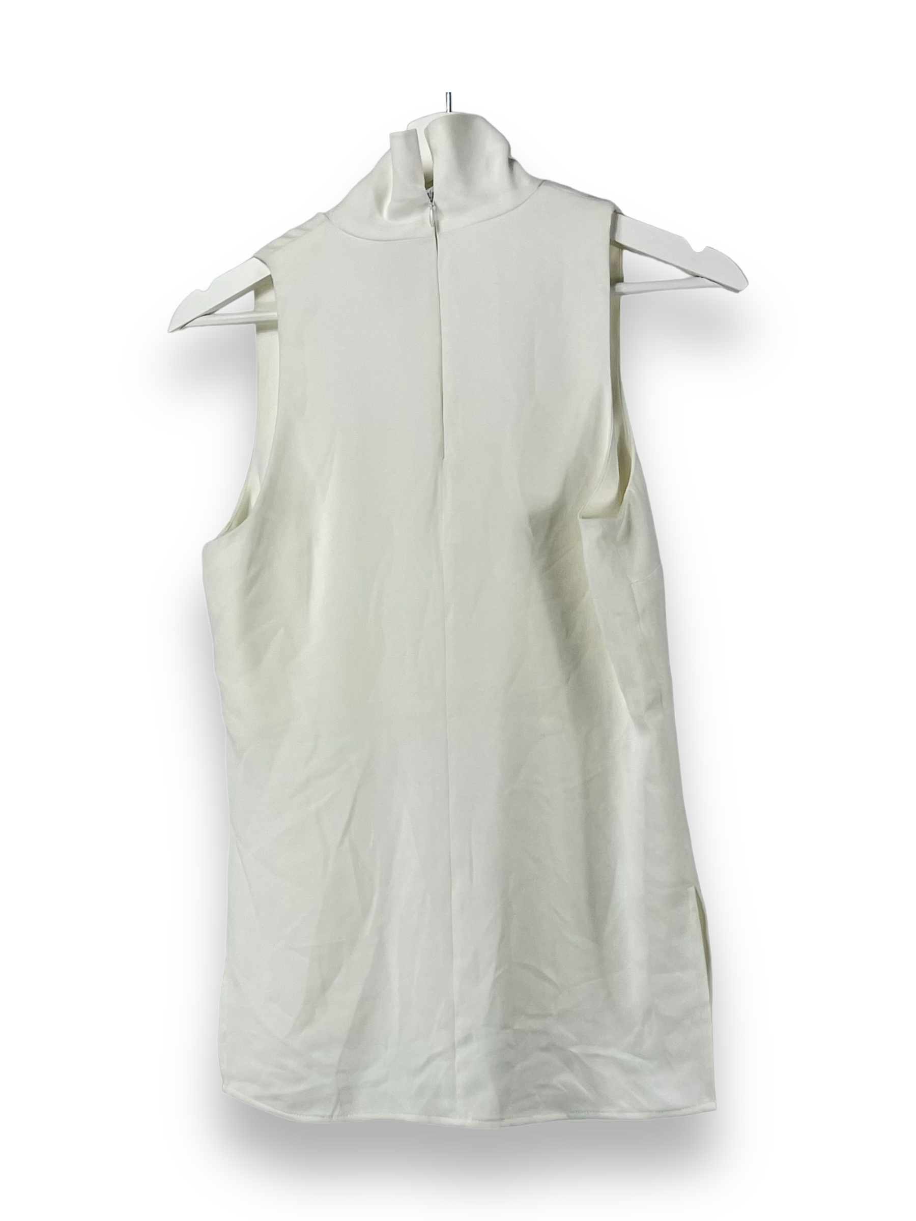 Das Blusentop ist ärmellos in uni weiss / ecru mit einem leichten Satin-Glanz. Vorne hat es einen V-Ausschnitt mit einem tollen, feinen Kragen.