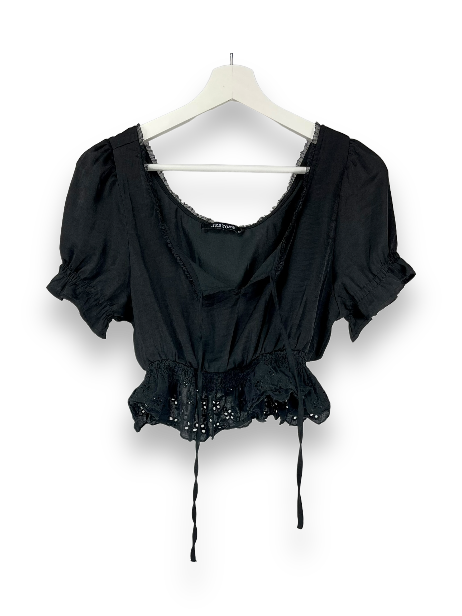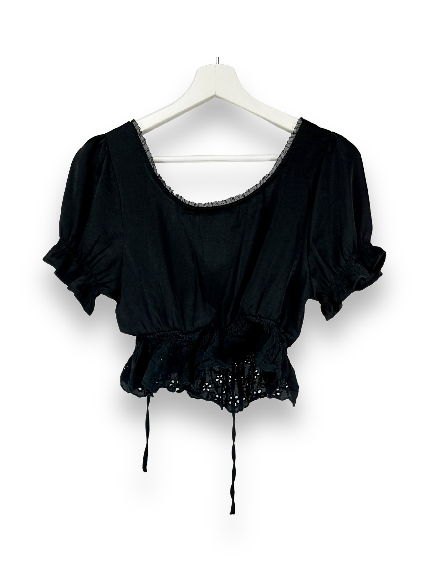 Dieses süsse Top ist kurz geschnitten und kurzarm. Vorne hat es einen kleinen V-Ausschnitt, der zu gebunden werden kann. An den Ärmel und unten um das komplette Top, hat es Rüschen mit einem Lochstick.