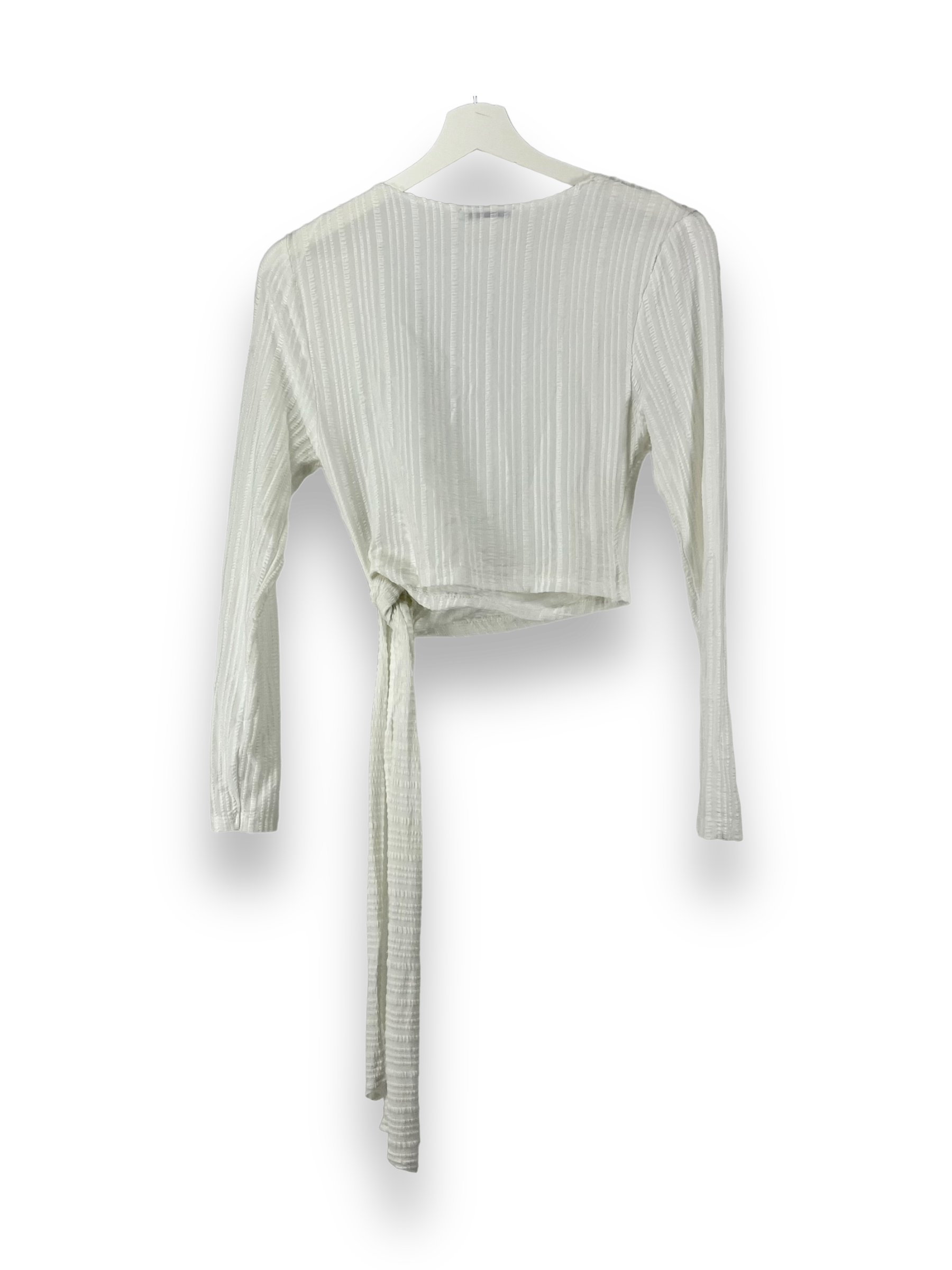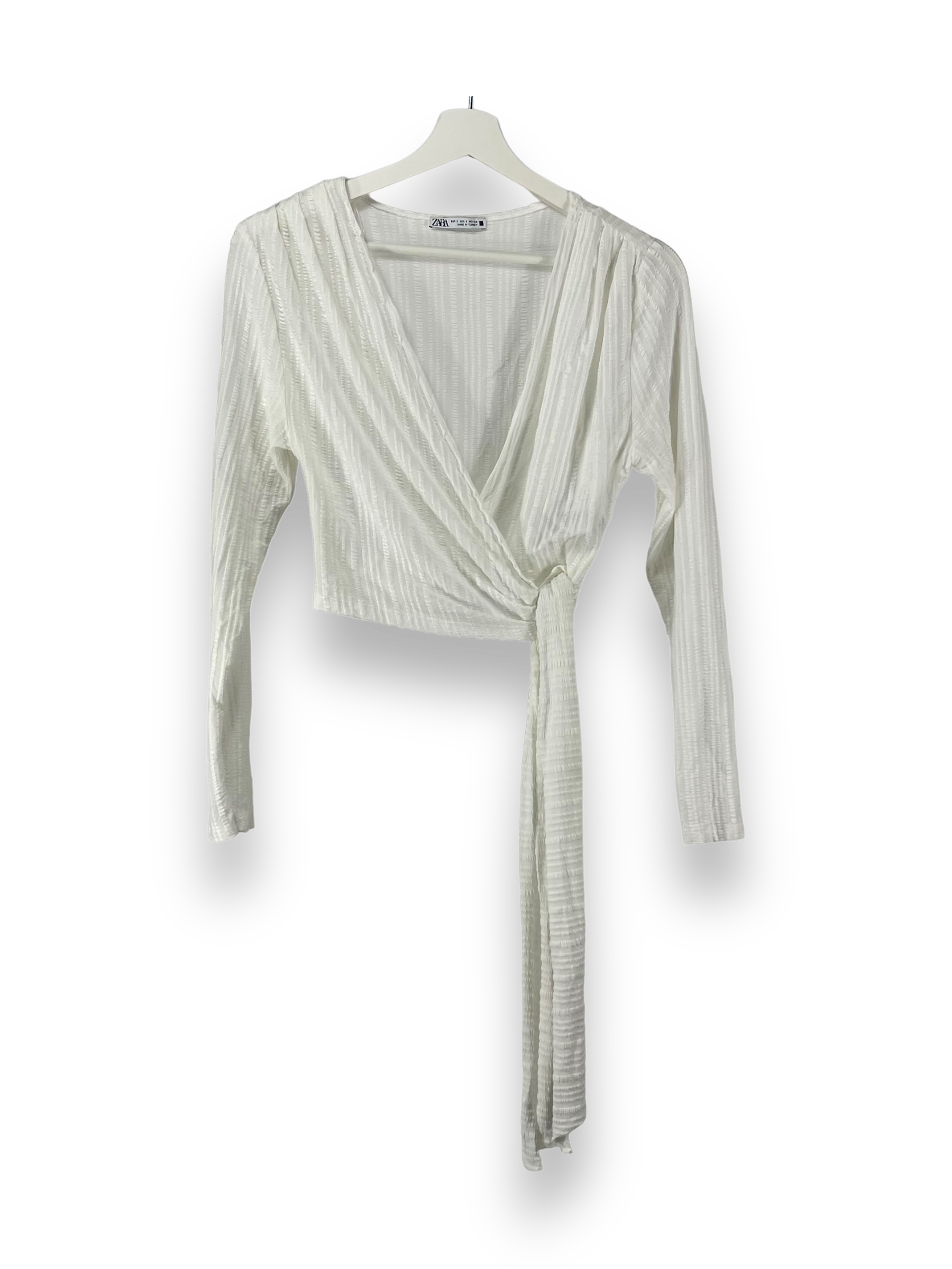 Das Top von ZARA haben wir in uni weiss mit langen Ärmel und einem kurzen Schnitt. Vorne hat es einen V-Ausschnitt und lässt sich in verschiedenen Varianten binden.